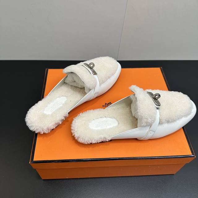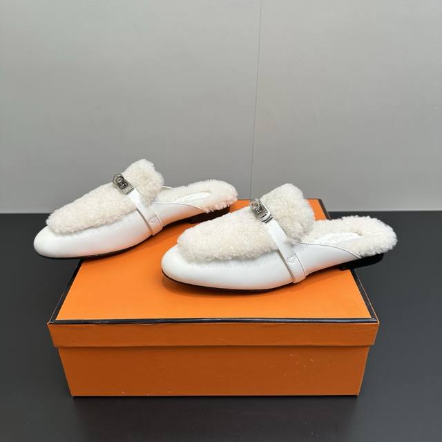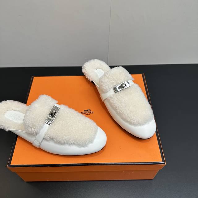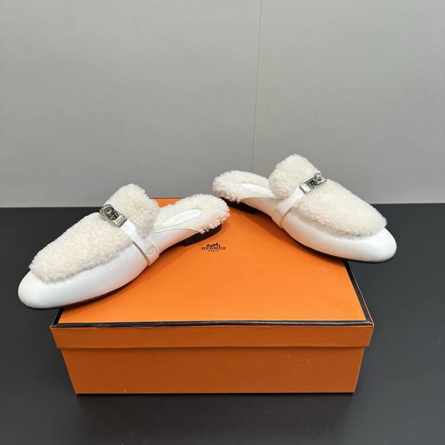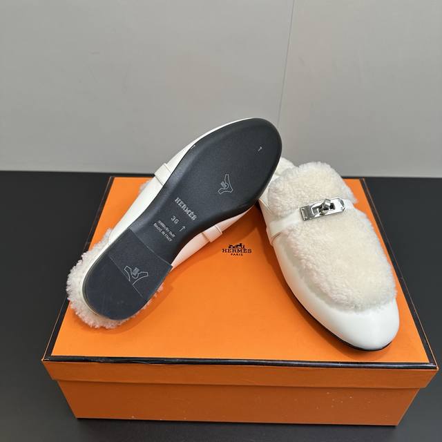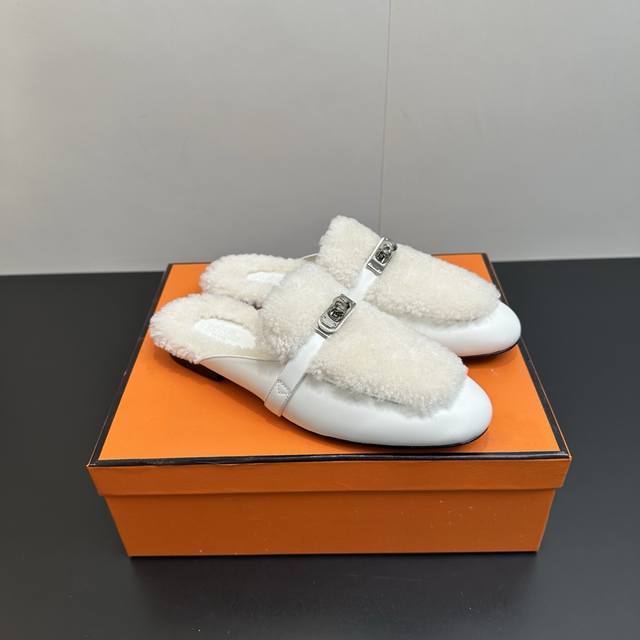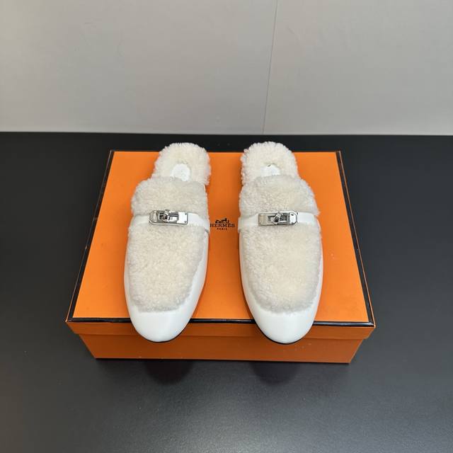 Hermes Oz Wool Mules, Classic Kelly Buckle Closed-Toe Slip-on Mules, Classic Half-Slip-on Fleece Slip-on Mules. Made of calfskin, featuring a classic palladium-plated Kelly buckle and integrated lambskin, creating an elegant everyday style. Upper: Calfskin and lambskin. Insole: Lambskin. Outsole: Italian Grade A genuine leather. Sizes: 35-39, 40.41. Custom orders are non-refundable and non-exchangeable.