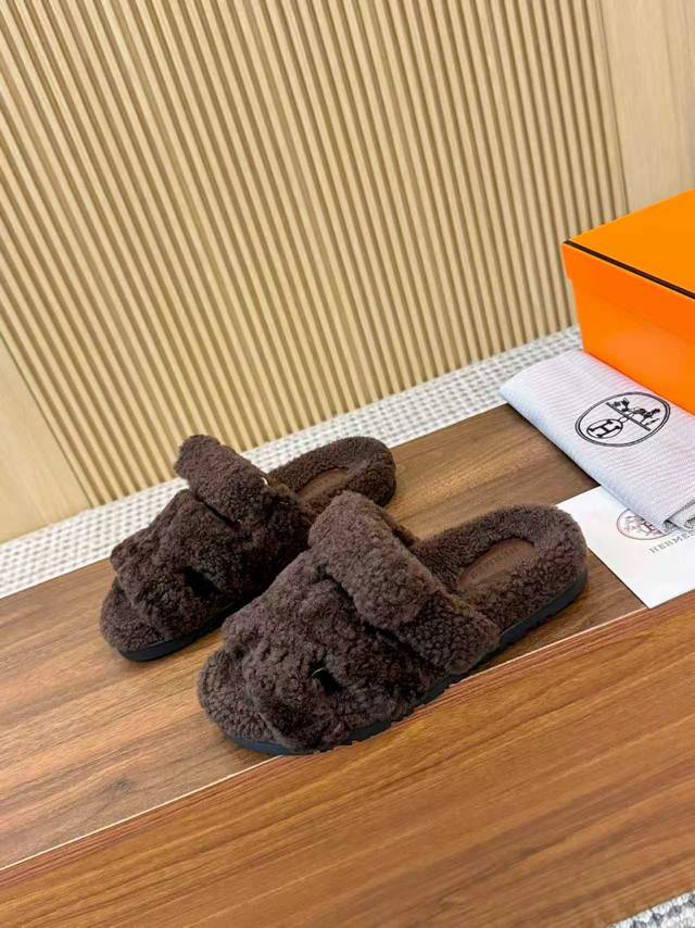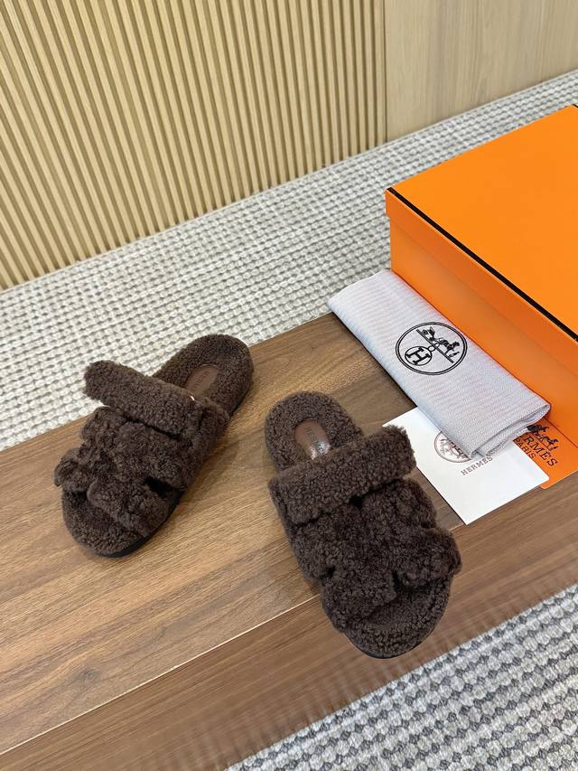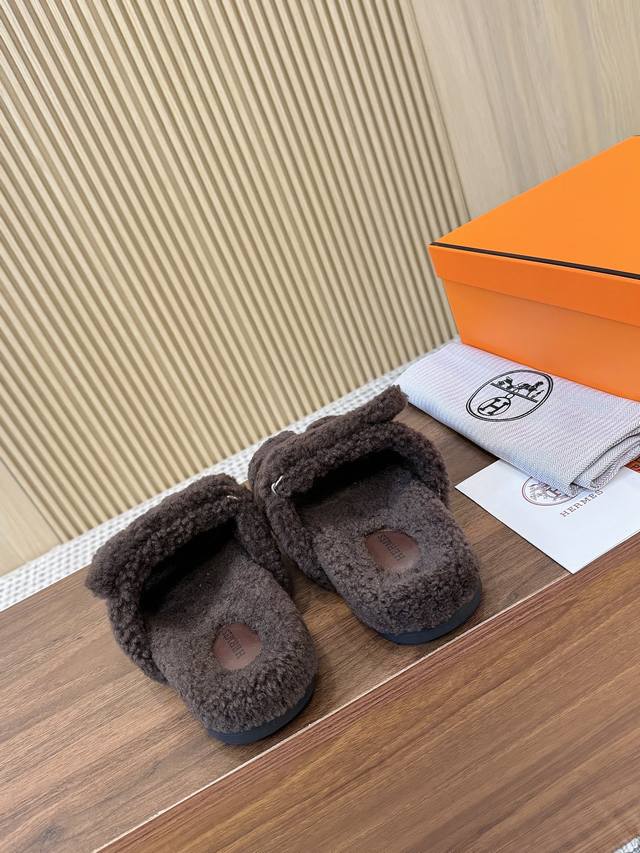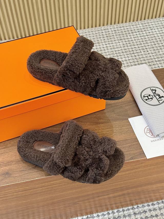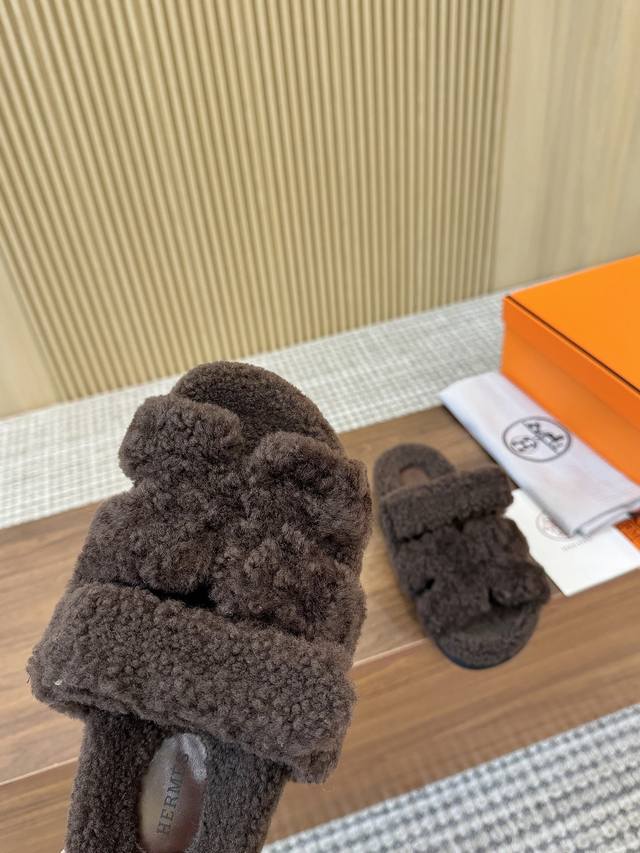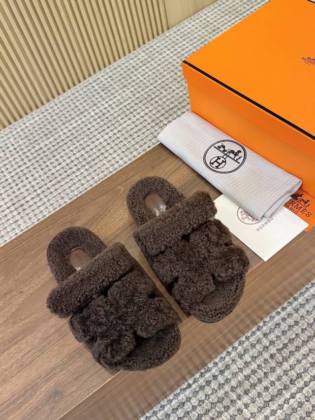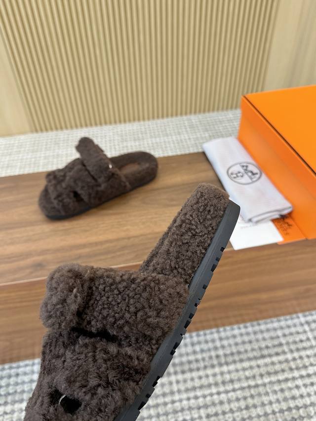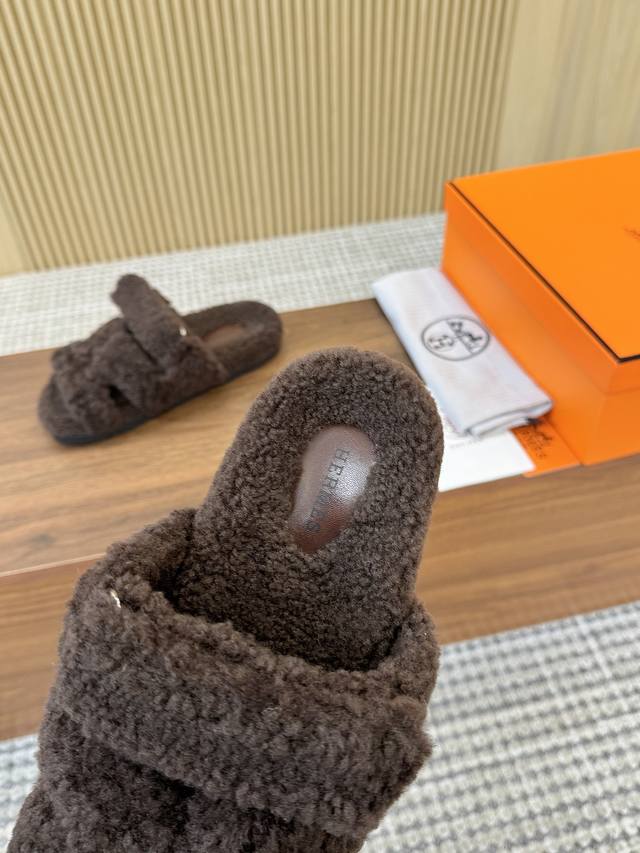 Hermes Shearling Rolled Fleece Slippers. This year's materials are all A+ shearling rolled fleece. Super cute and fluffy, feels like walking on clouds. Wear them barefoot or with socks, they're incredibly stylish. The sole is an original molded TPU sole. Size: Women's 35-41.