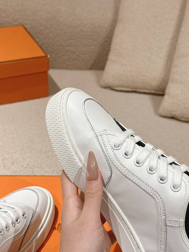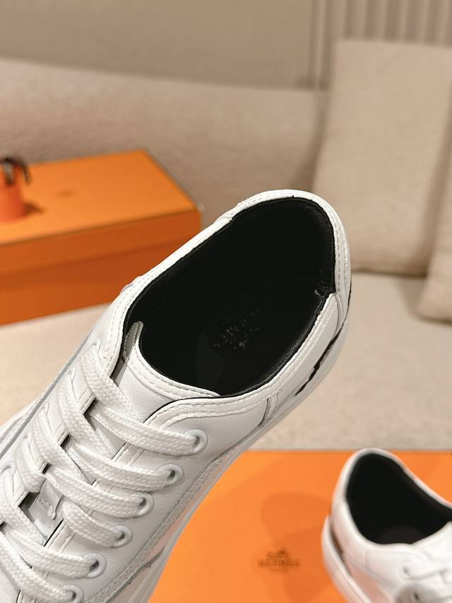 Hermes Top-Tier Version# Hermes Deep Series Couple White Sneakers, Casual Skate Shoes. Stylish graphic design creates a retro style. Upper: Cowhide leather. Lining: Sheepskin lining. Outsole: TPU outsole. Sizes: 35-45.