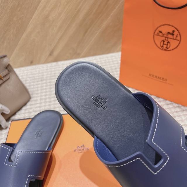 Hernes deep blue genuine leather upper, lambskin lining, high-end H men's slippers, Italian durable genuine leather sole, urgently needed in the market: exquisitely handcrafted. Original replica, sizes: 39-46, 38, 39, 45, 46 custom orders are non-refundable and non-exchangeable. Full packaging, genuine leather sole.