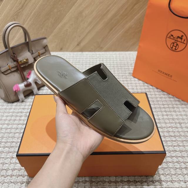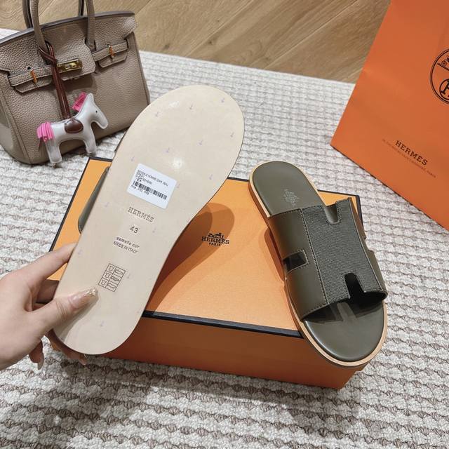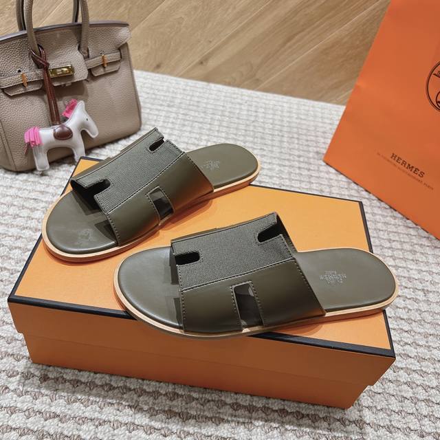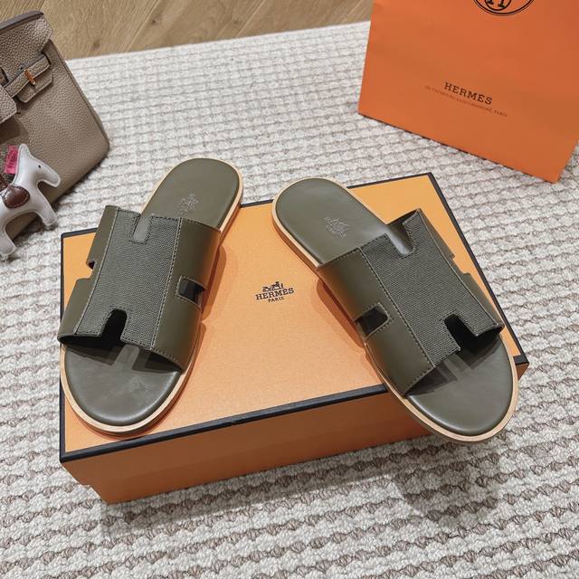 Hernes military green patchwork Hermes genuine leather upper, sheepskin lining, high-end H men's slippers, Italian wear-resistant genuine leather sole, urgently needed in the market: exquisitely handmade. Original replica, sizes: 39-46, 38, 39, 45, 46 custom orders are non-refundable and non-exchangeable. Full packaging, genuine leather sole.