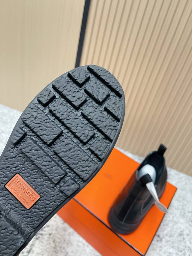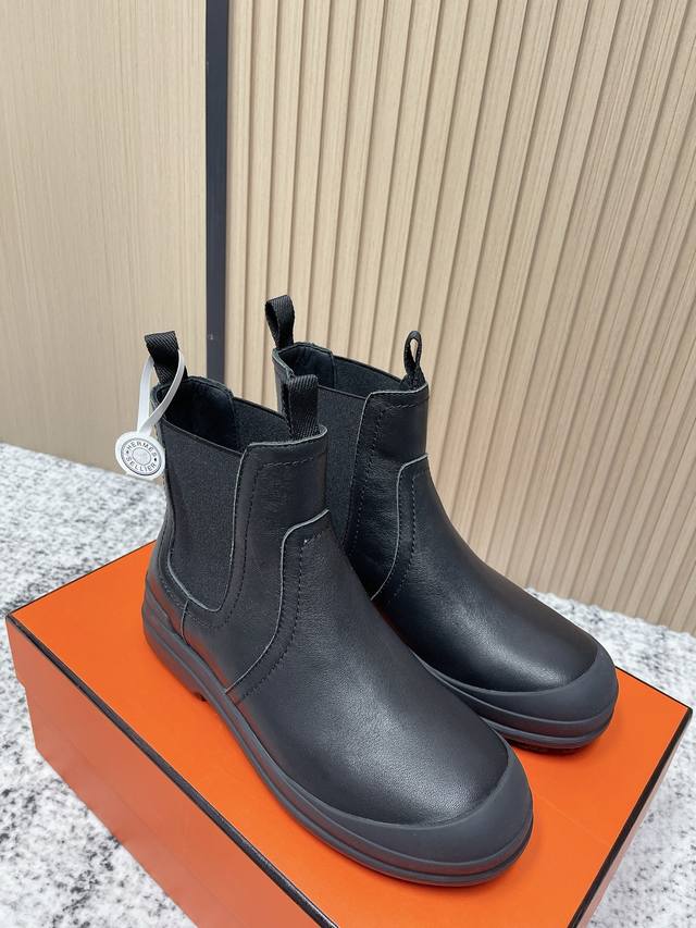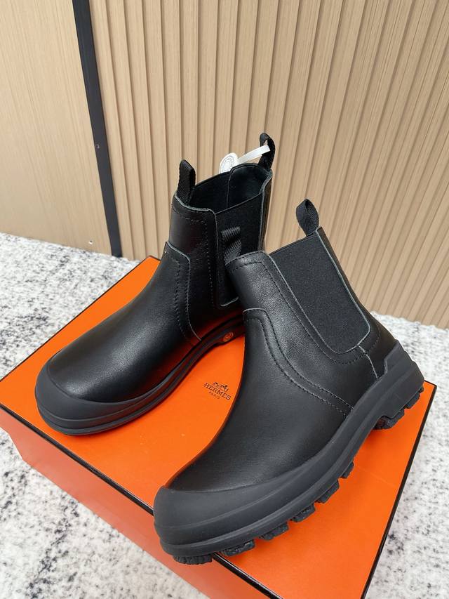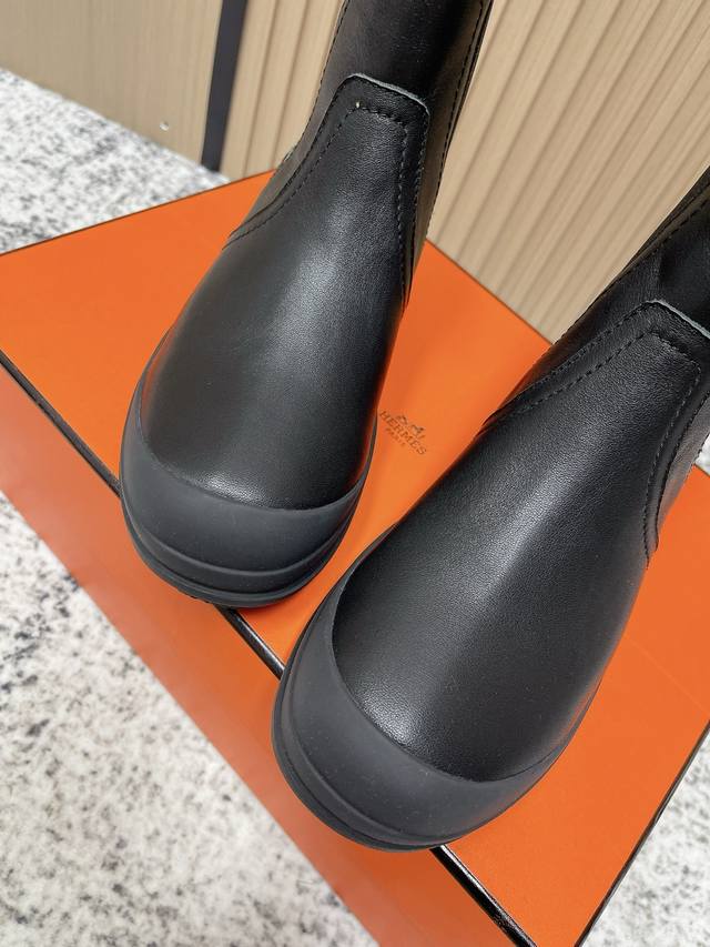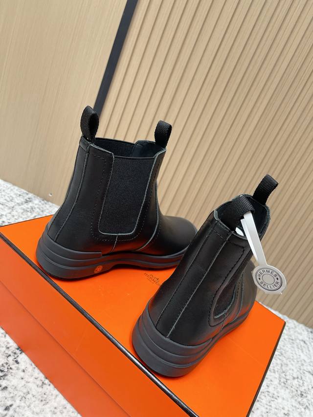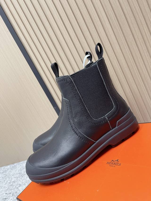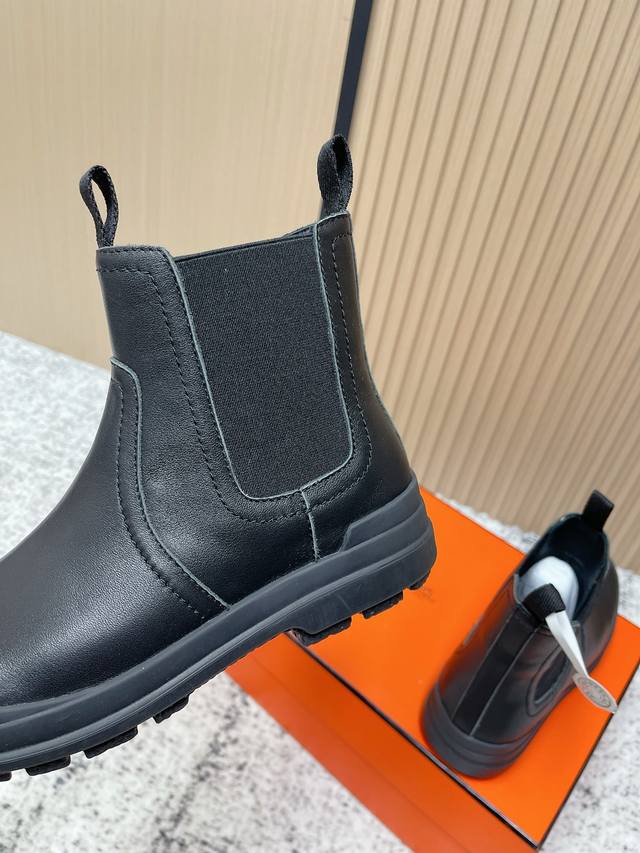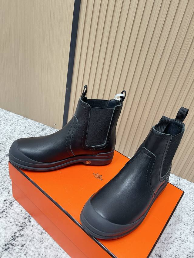 High-quality factory version: Hermes F058 25Ss New 2025Ss Chelsea Boots (Autumn/Winter). The boots have a beautiful shape, an exquisite design, and are very comfortable to wear, exuding a high-end feel! Material: Imported high-gloss calfskin. Lining: Sheepskin lining. Outsole: Original molded rubber outsole. Top quality, sizes 35-40. Size 40 is custom-made and non-refundable.