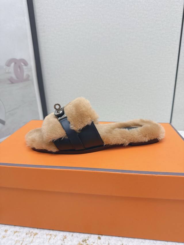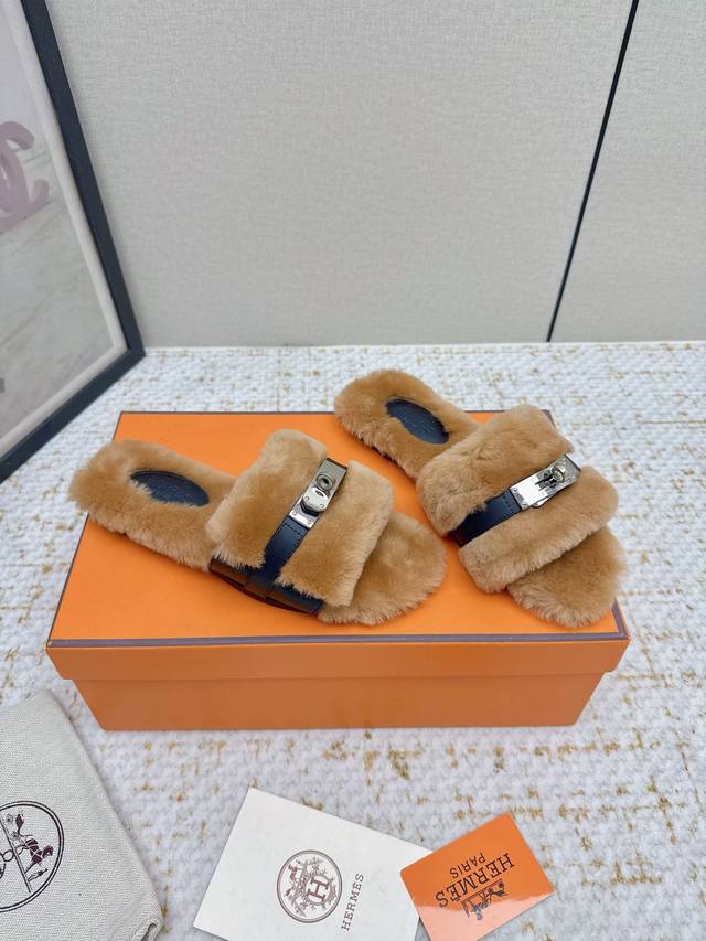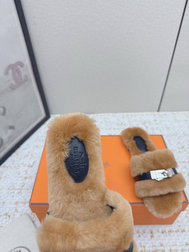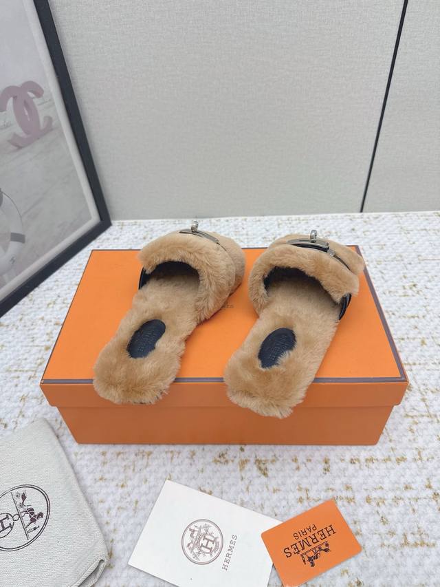 *Hermes 25 Latest Autumn/Winter Shearling Rolled Fleece Slippers
