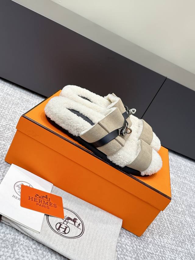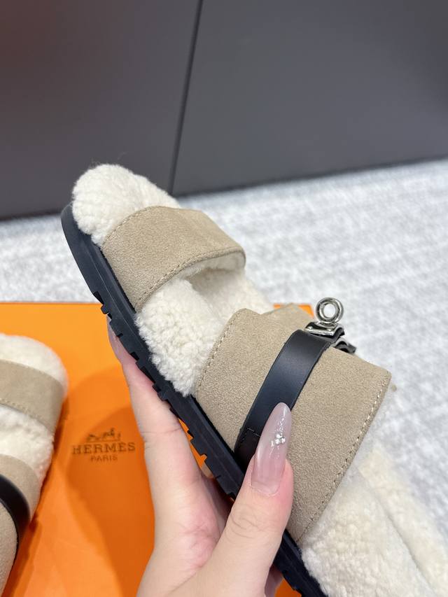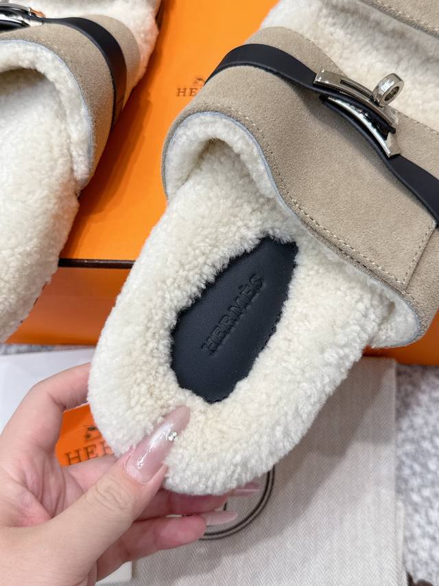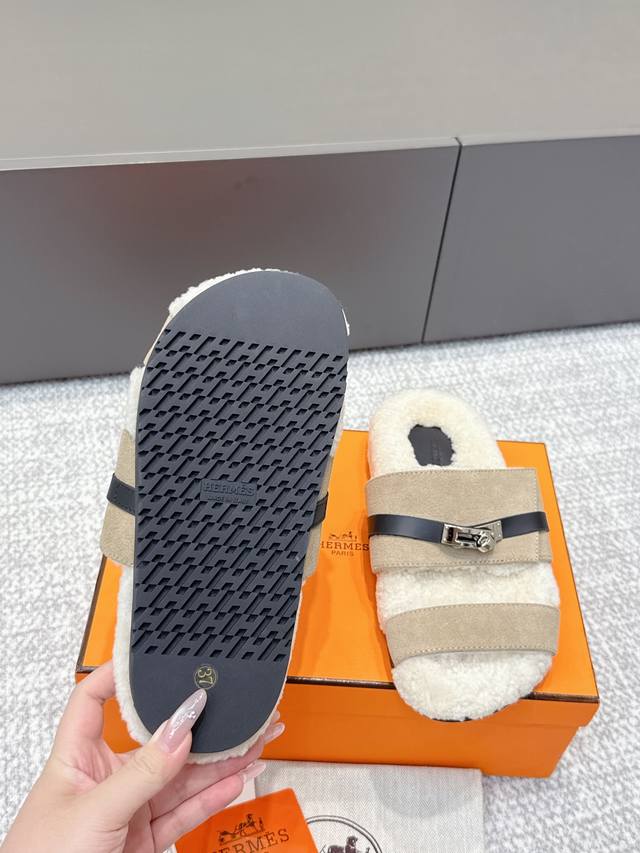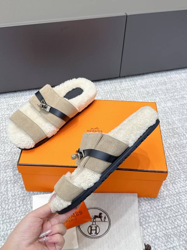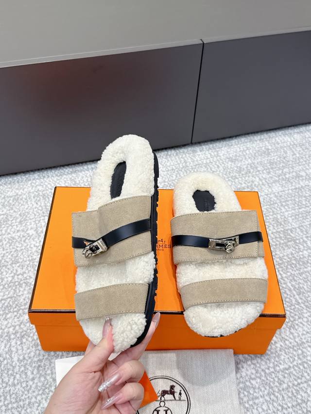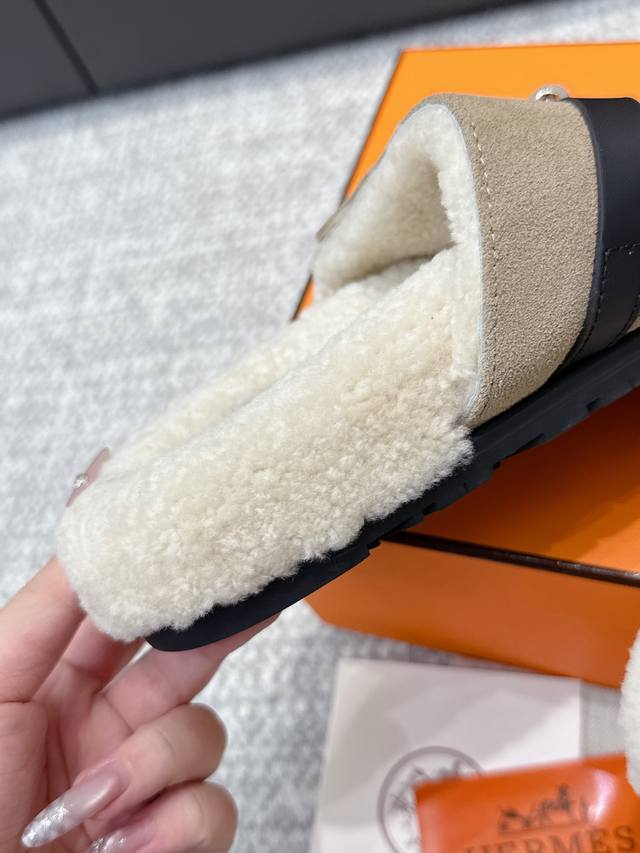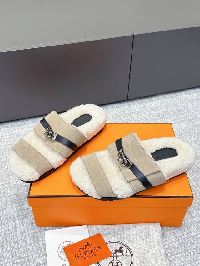 High-quality Hermes 25Ss latest autumn/winter Kelly slippers. Super versatile, stylish, and recommended by many celebrities and influencers. A must-have for autumn/winter. Casual, comfortable, and high-end. Upper: Imported sheepskin. Lining: Imported wool. Insole: Bumper mixed sheepskin. Outsole: TPU non-slip and wear-resistant. Size: 35-40. Size 40 is custom-made and non-refundable.