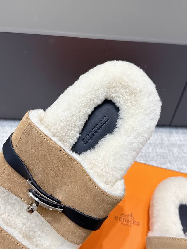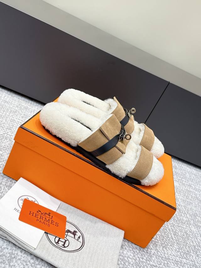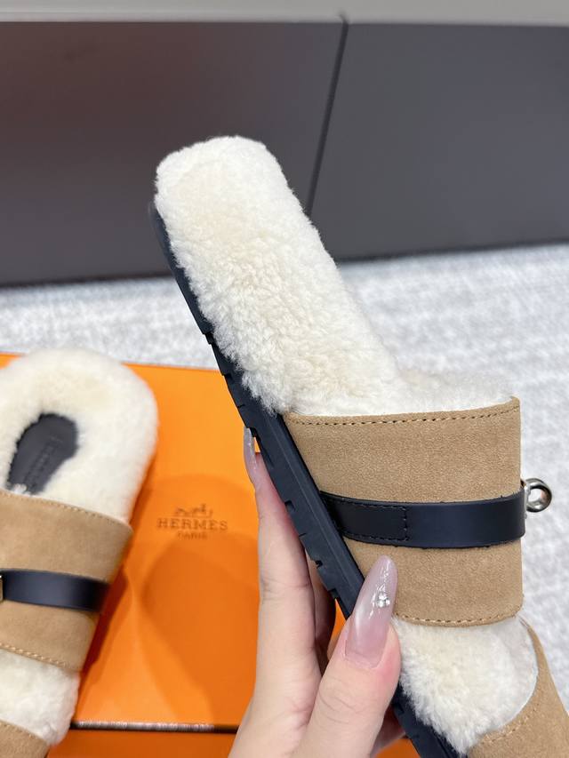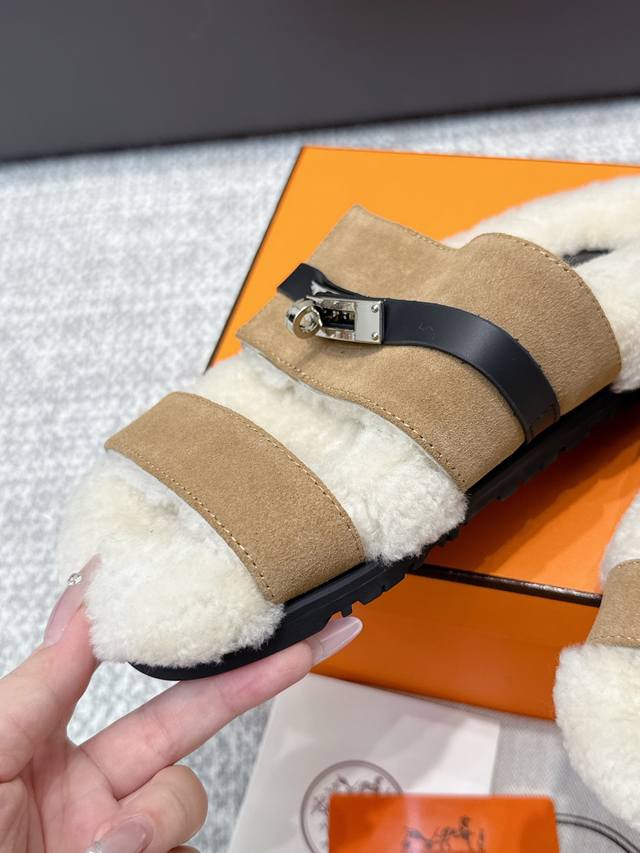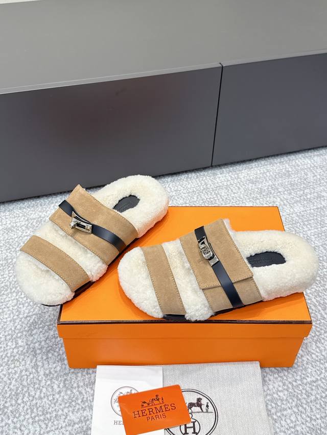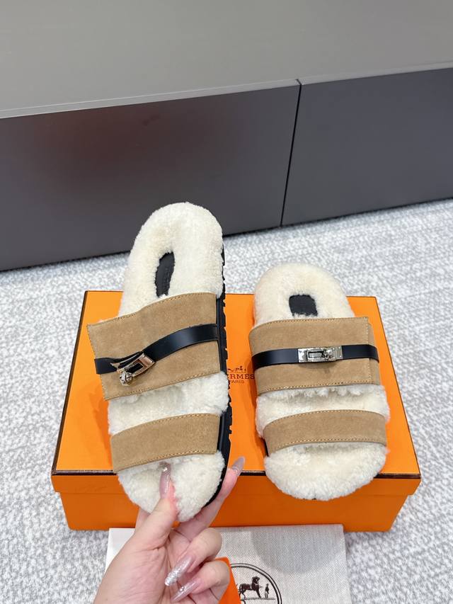 High-quality Hermes 25Ss latest autumn/winter Kelly slippers. Super versatile, stylish, and recommended by many celebrities and influencers. A must-have for autumn/winter. Casual, comfortable, and high-end. Upper: Imported sheepskin. Lining: Imported wool. Insole: Bumper mixed sheepskin. Outsole: TPU non-slip and wear-resistant. Size: 35-40. Size 40 is custom-made and non-refundable.