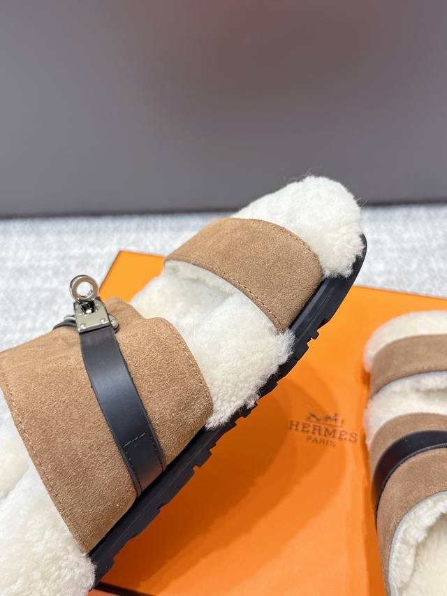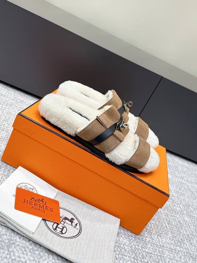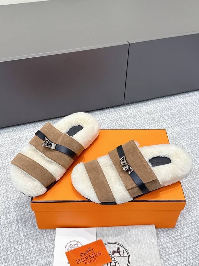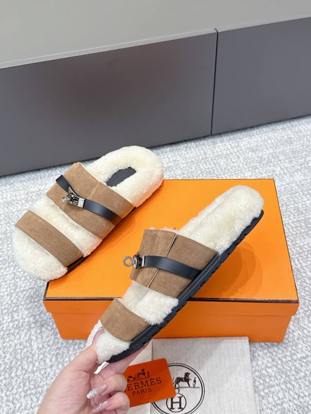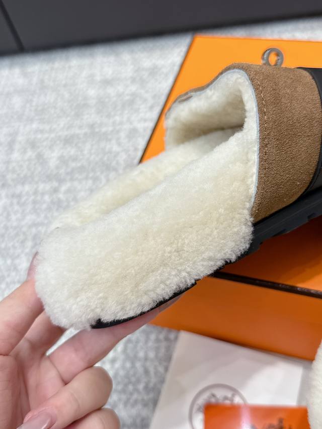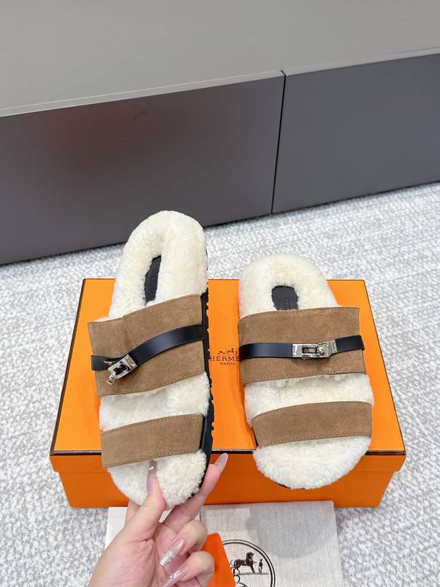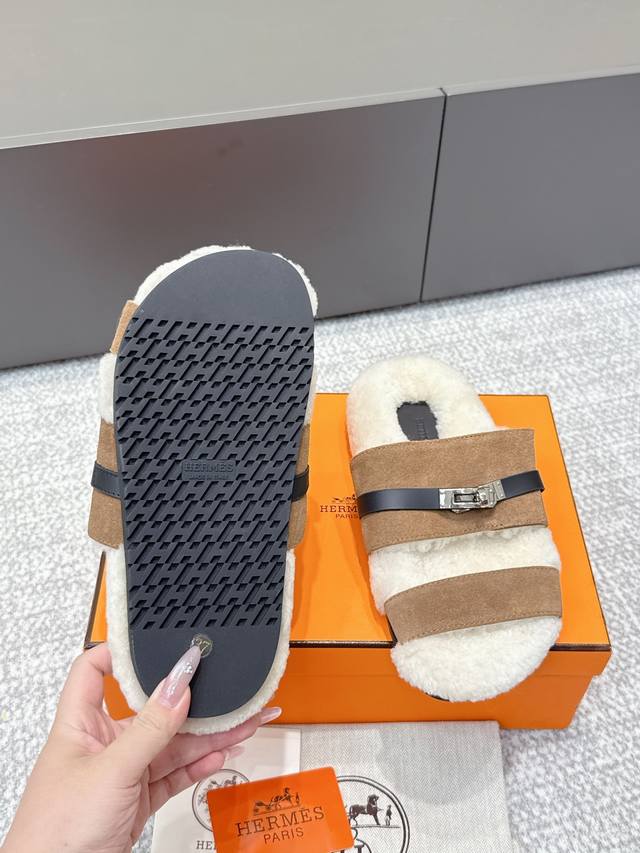 High-quality Hermes 25Ss latest autumn/winter Kelly slippers. Super versatile, stylish, and recommended by many celebrities and influencers. A must-have for autumn/winter. Casual, comfortable, and high-end. Upper: Imported sheepskin. Lining: Imported wool. Insole: Bumper mixed sheepskin. Outsole: TPU non-slip and wear-resistant. Size: 35-40. Size 40 is custom-made and non-refundable.