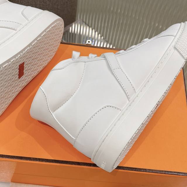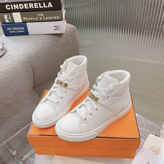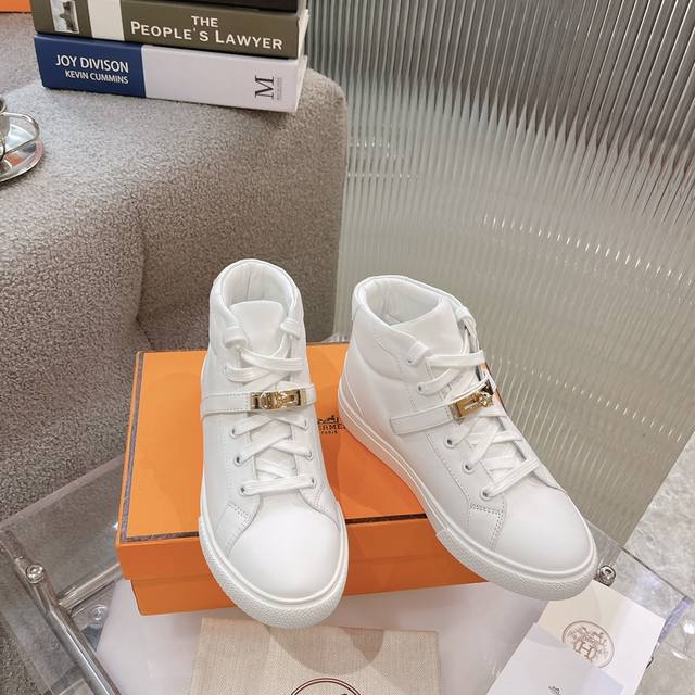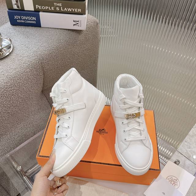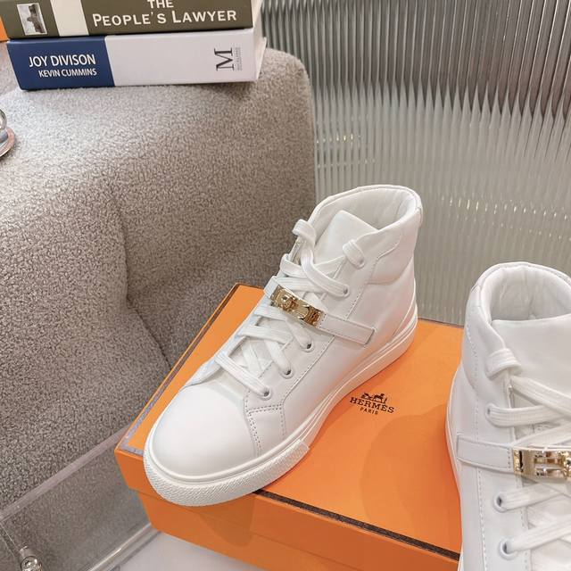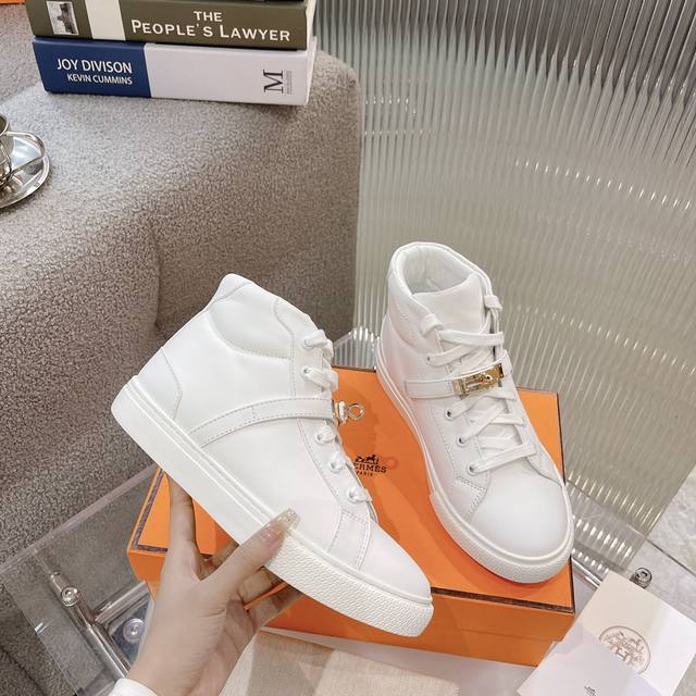 High-top casual shoes from He*Ms! The latest Kelly buckle casual shoes are now available! Top-quality, reseller-level! The Hermes family rarely releases flat casual shoes, especially those with the classic palladium-plated Kelly buckle! Create a stylish urban look, perfectly embodying Hermes' noble and elegant style! Materials: Imported cowhide upper, imported sheepskin lining and insole, original mold-made outsole. Sizes: 35-40, 41 (made to order).