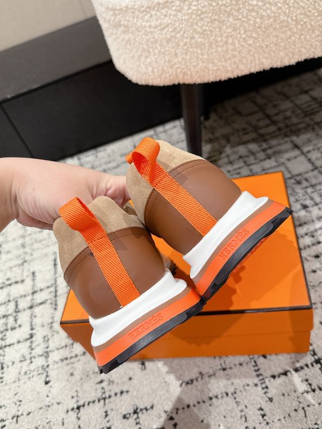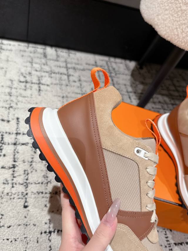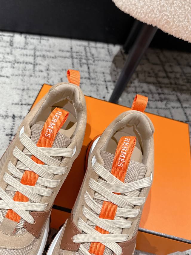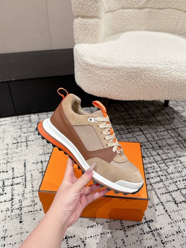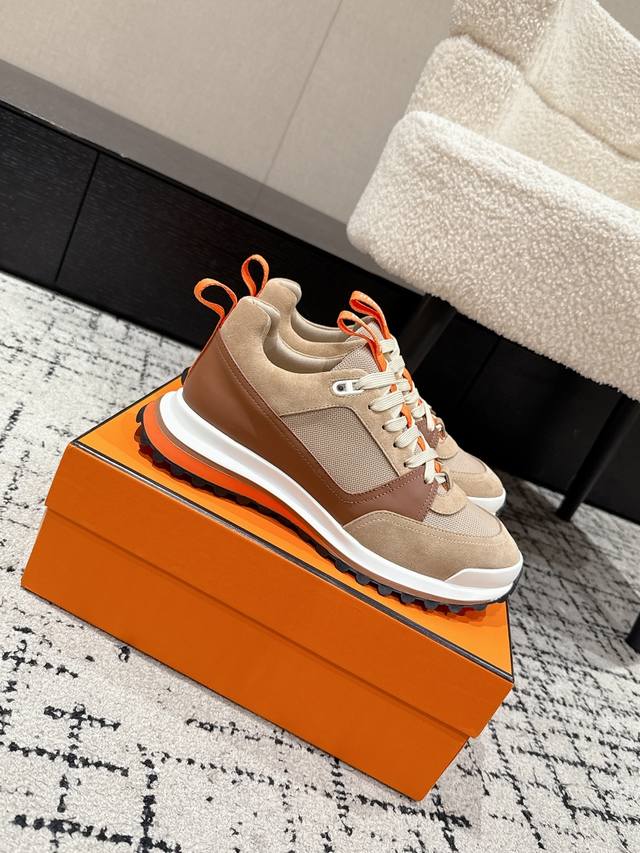 Men's Hermes 25 Leader New Round Toe Lace-up Low-top Sporty Casual Shoes. New arrival at boutiques. Every detail of the shoe is meticulously crafted and eye-catching. Elegant patchwork elements highlight a refined temperament! The fashionable flyknit lace-up design adds a casual touch, while the exquisite lines subtly embody the brand's design language. The delicate lines perfectly fit the foot shape, naturally outlining a stylish silhouette for a visually striking effect, fully showcasing a unique sporty style! Upper: Nappa calfskin suede; Lining: Top-grain mesh cowhide insole; Outsole: Ultra-lightweight TPU foam rubber two-tone molded outsole. Size: Men's 39-45, 45 custom-made.