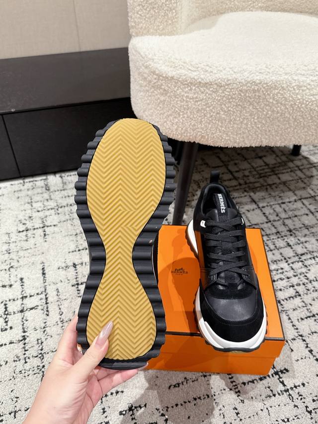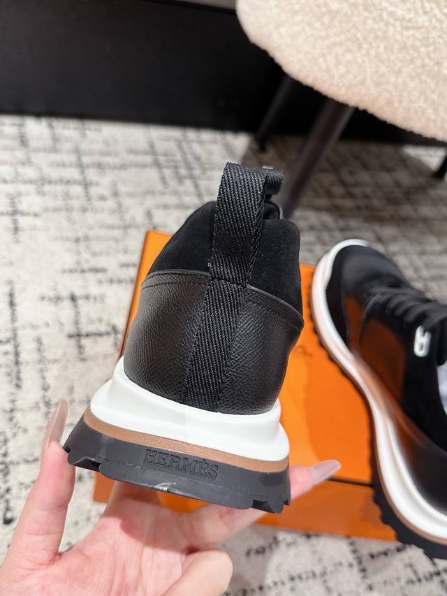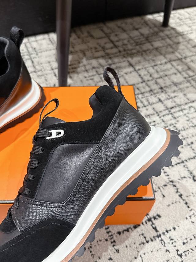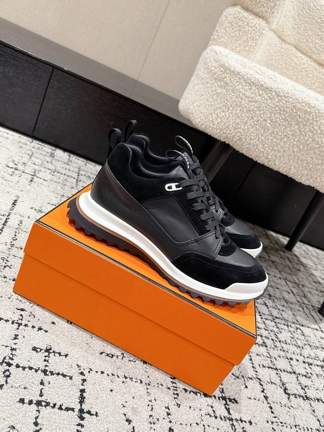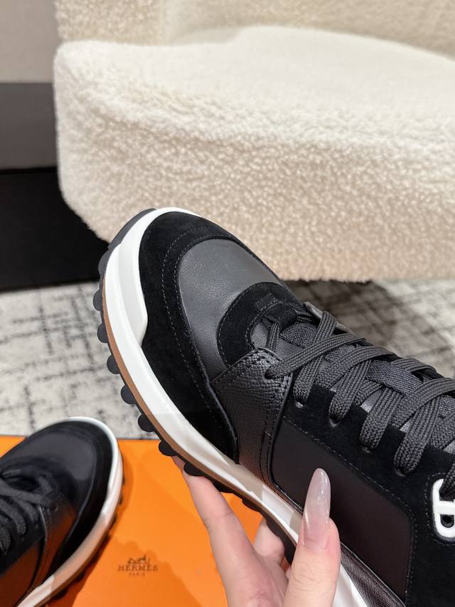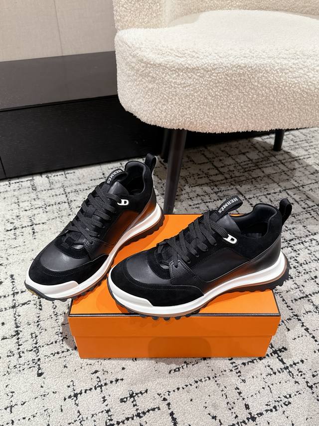 Men's Hermes 25 Leader New Round Toe Lace-up Low-top Sporty Casual Shoes. New arrival at boutiques. Every detail of the shoe is meticulously crafted and eye-catching. Elegant patchwork elements highlight a refined temperament! The fashionable flyknit lace-up design adds a casual touch, while the exquisite lines subtly embody the family design language. The delicate lines perfectly fit the foot shape, naturally outlining a stylish silhouette and achieving a visually striking effect, fully interpreting a unique sporty style! Upper: Nappa calfskin suede; Lining: Top-grain mesh cowhide insole; Outsole: Ultra-lightweight TPU foam rubber two-tone molded outsole. Size: Men's 39-45, 45 custom-made.
