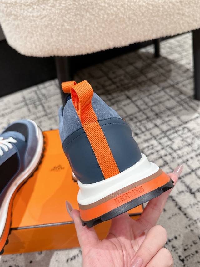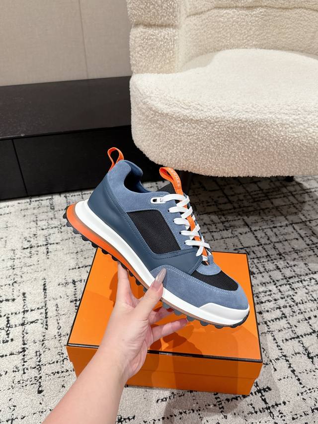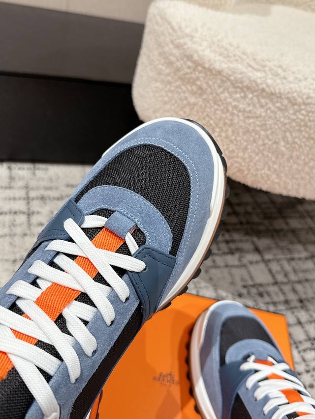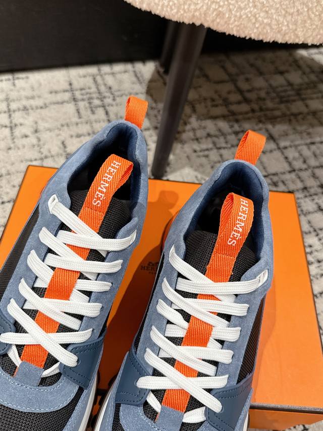 Men's Hermes 25 Leader New Round Toe Lace-up Low-top Sporty Casual Shoes. New arrival at boutiques. Every detail of the shoe is meticulously crafted and eye-catching. Elegant patchwork elements highlight a refined temperament! The fashionable flyknit lace-up design adds a casual touch, while the exquisite lines subtly embody the family design language. The delicate lines perfectly fit the foot shape, naturally outlining a stylish silhouette and achieving a visually striking effect, fully interpreting a unique sporty style! Upper: Nappa calfskin suede; Lining: Top-grain mesh cowhide insole; Outsole: Ultra-lightweight TPU foam rubber two-tone molded outsole. Size: Men's 39-45, 45 custom-made.