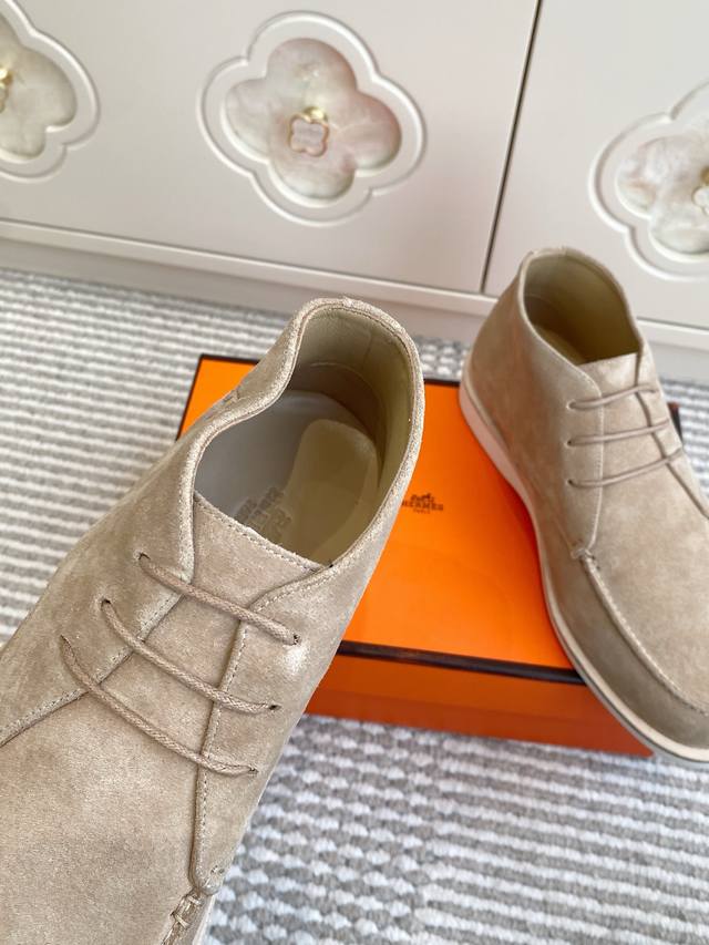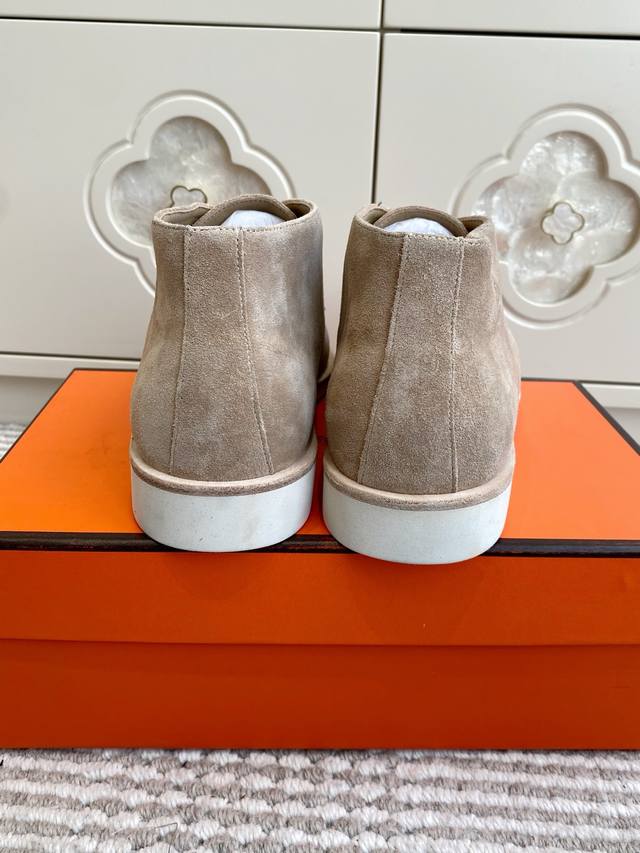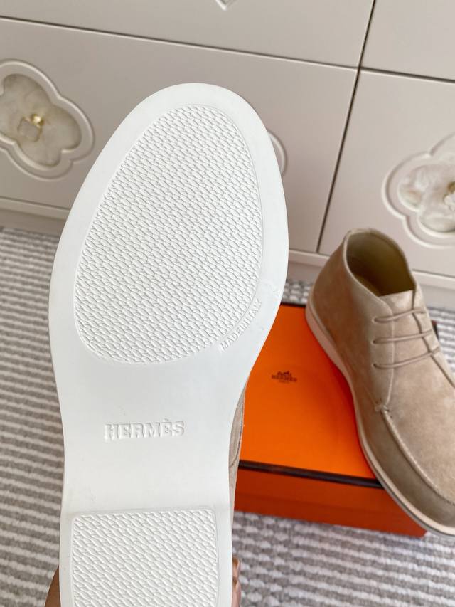 Men's Hermes Suede Lace-up Casual Ankle Boots, Top Quality, Classic "H" Logo, Rubber Sole