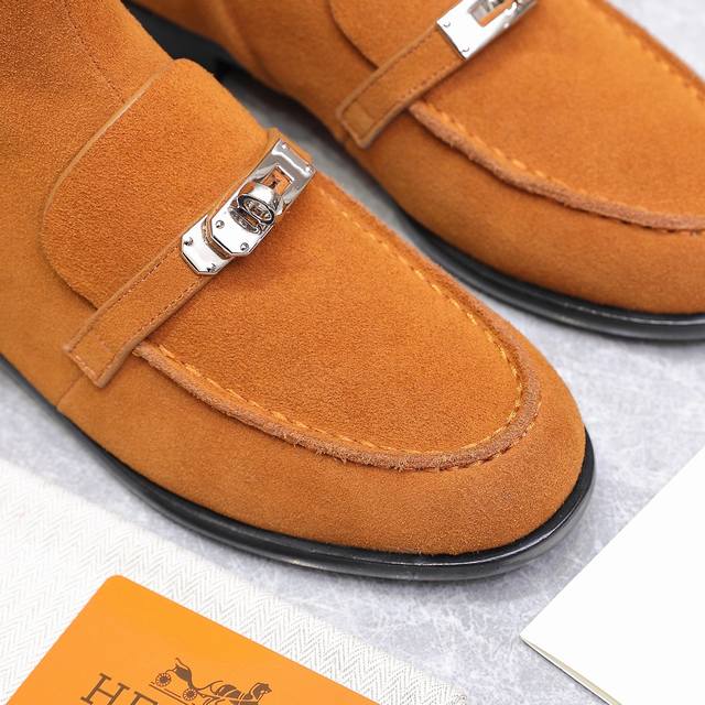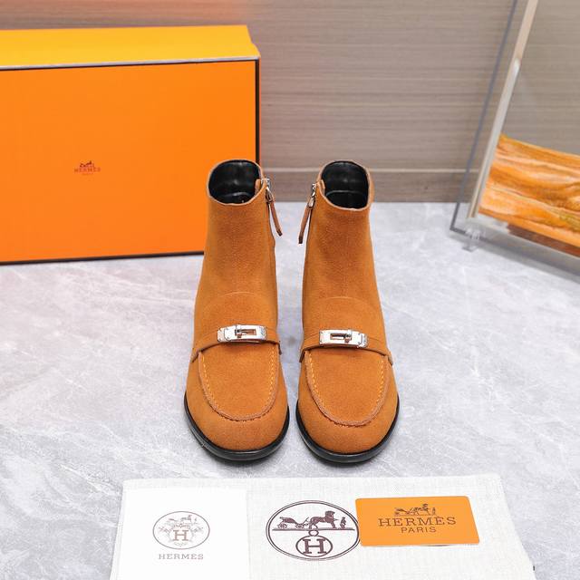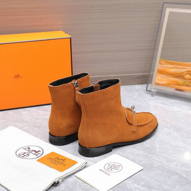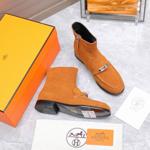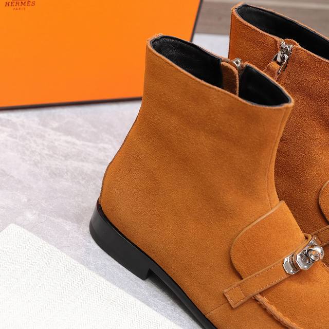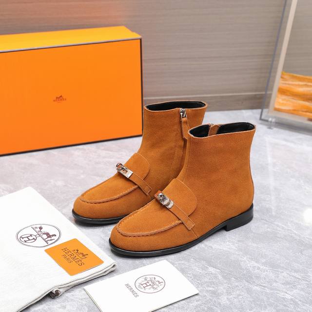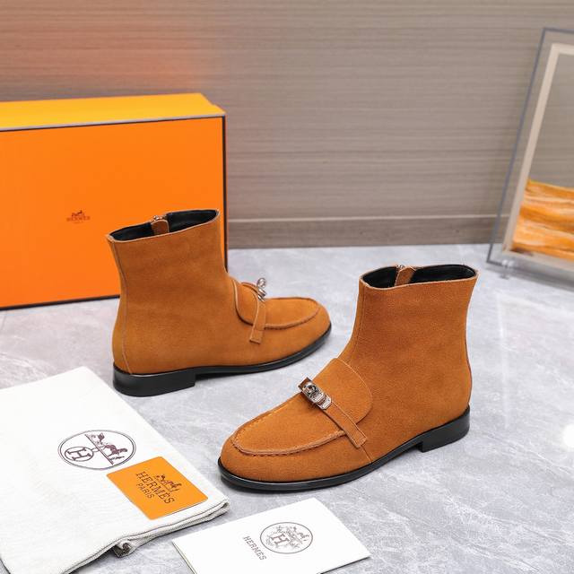 Top Quality Hermes Autumn/Winter New Collection Kelsy Ankle Boots, Classic Kelly Buckle Suede Ankle Boots, Slip-on Flat Bottom with Side Zipper. Every detail showcases exceptional quality. The iconic Kelly buckle adorns the boot's upper with a shimmering metallic sheen, while the smooth lines exude a luxurious feel. Continuing the classic legend is a symbol of Hermes' taste. Stable and comfortable for both city streets and outdoor strolls, the boot height fits the ankle perfectly. It flatters the leg line, making legs appear slimmer and longer. Paired with jeans, it's chic and casual; paired with a dress, it's elegant and charming, easily adapting to various styles of clothing