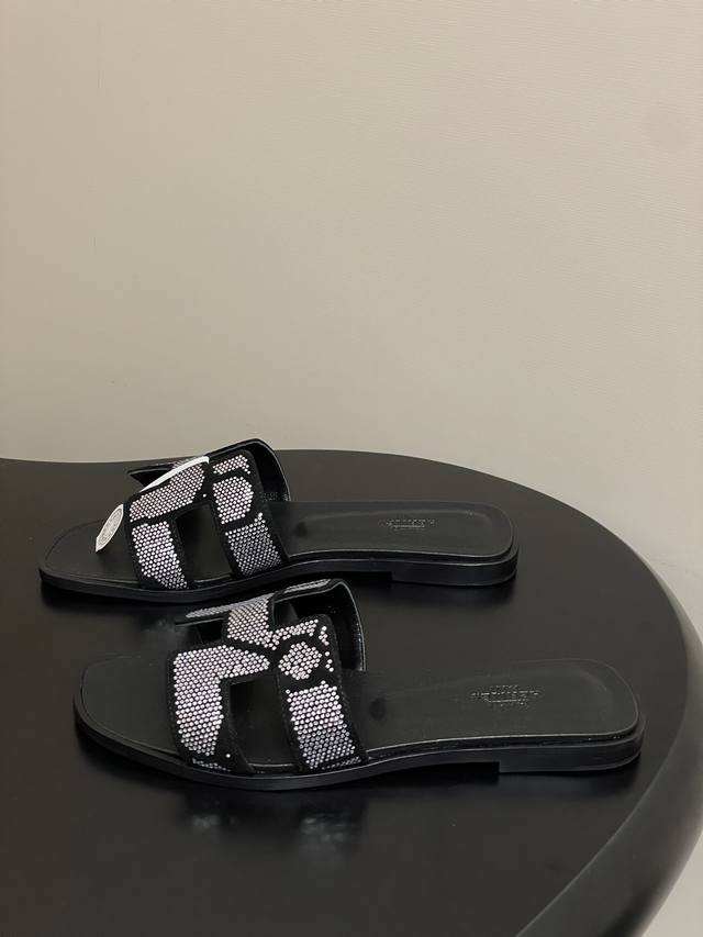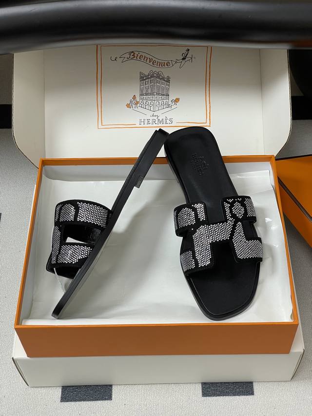 Top quality with a high-end airplane box. Hermes Oran diamond-encrusted H-shaped sandals, classic flat, chunky heeled sandals with hot-stamped H-shaped upper. Each pair comes with two Hermes silk scarves. The classic H-shaped upper is decorated with an "Arcane" rhinestone pattern. Stylish, versatile, and super comfortable. Every detail is meticulously crafted. The simple and streamlined design creates a fashionable and elegant evening look. Upper: Fine suede. Insole: Sheepskin. Outsole: Italian Grade A genuine leather. Heel height: 5cm (flat). Sizes: 35-39. 40, 41, 42 are custom-made and non-refundable.