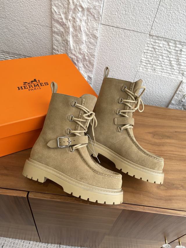 Top Version: Hermes 25Ss Autumn/Winter New Classic Land Ankle Boots/Martin Boots. Featuring Hermes' unique craftsmanship and quality, these Land ankle boots are crafted from top-grade cowhide, with a delicate and lustrous texture, continuing Hermes' signature leather craftsmanship. The lining and insole are made of soft cowhide, skin-friendly and breathable, providing a cloud-like comfort experience. The thick sole with a non-slip rubber outsole enhances stability and gives you confidence with every step. Material: Imported suede; Lining: Imported cowhide; Outsole: Original molded rubber outsole; Size: 35-40 (40 is custom-made and non-refundable).