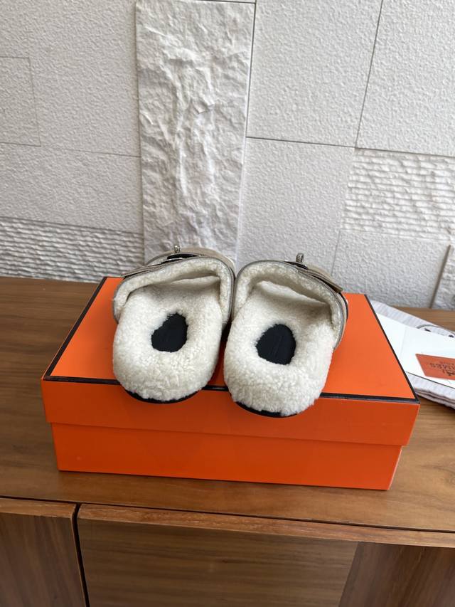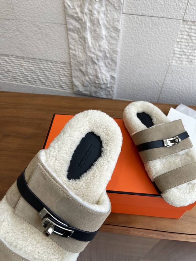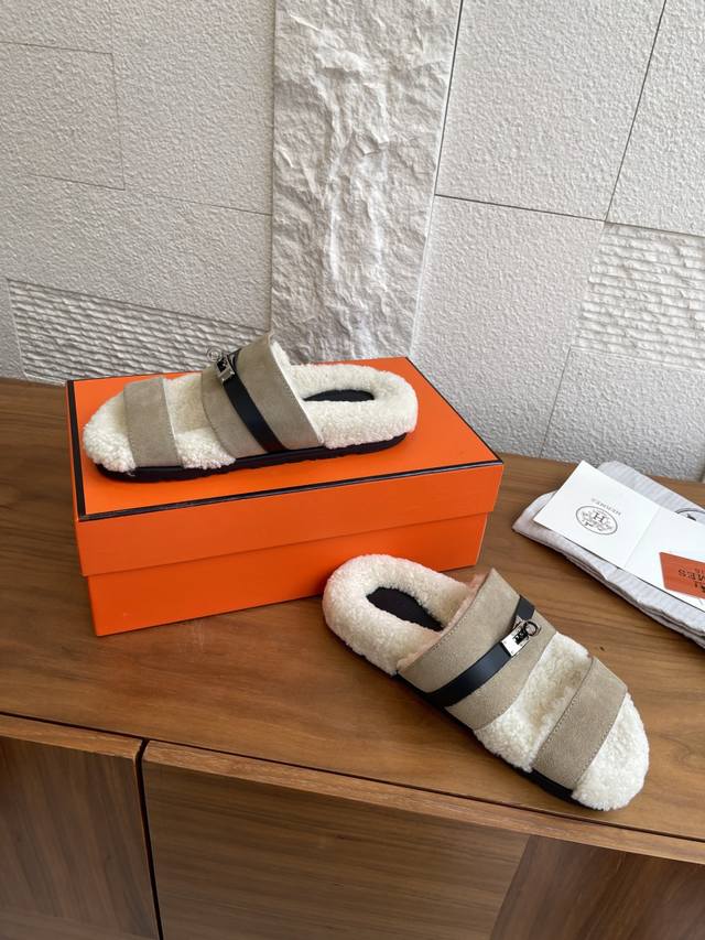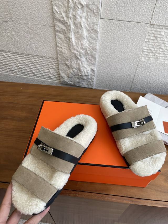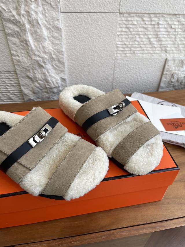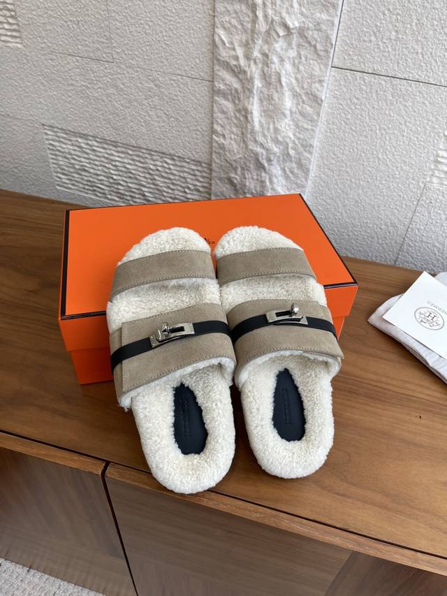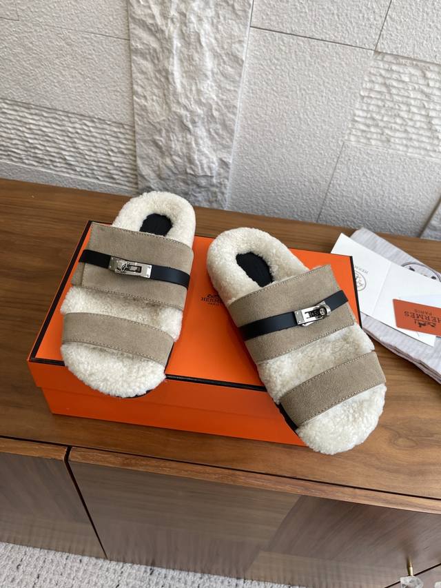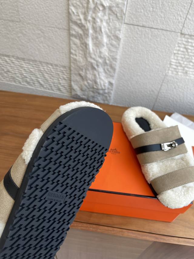 Hermes 25Ss Autumn/Winter New Kelly Buckle Fur Sandals, Thick-soled Fur Shoes. These Hermes Kelly buckle fur sandals are made of lamb's wool, super versatile, stylish, and a must-have for autumn and winter, recommended by many celebrities and influencers. Material: Imported suede. Lining: Imported lamb's wool. Outsole: Original molded rubber outsole. Size: 35-40. Size 40 is custom-made and non-refundable.