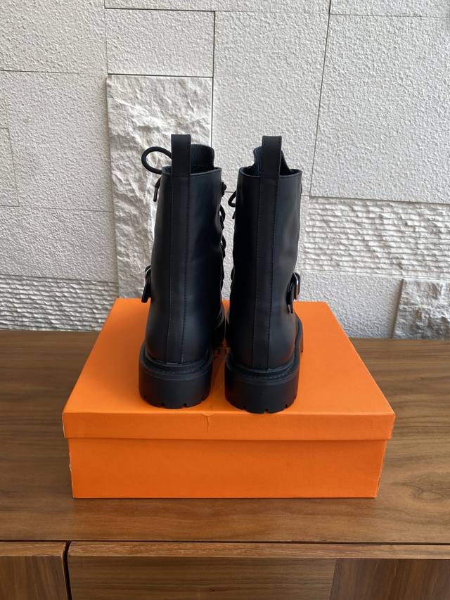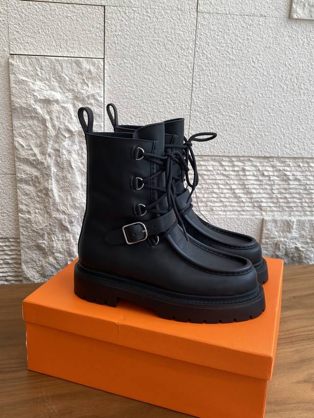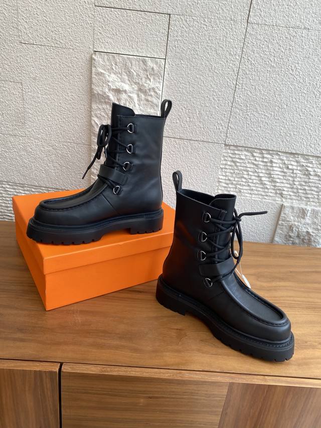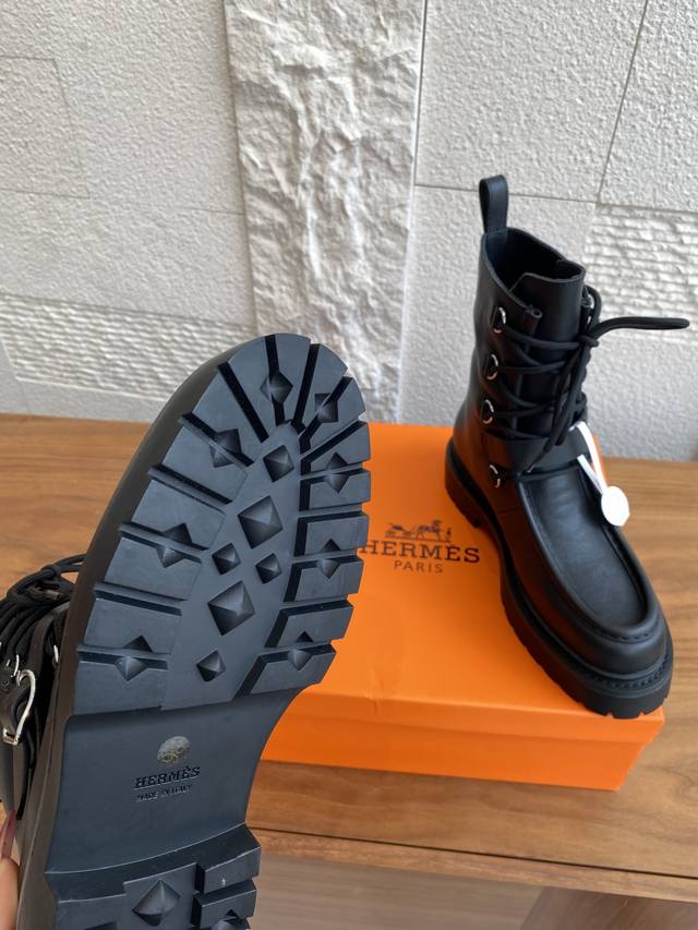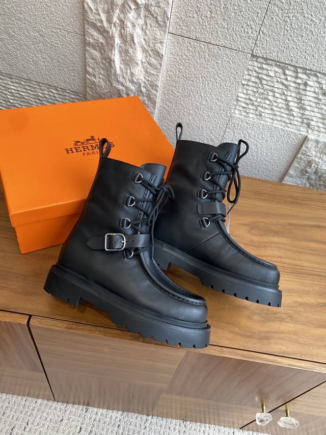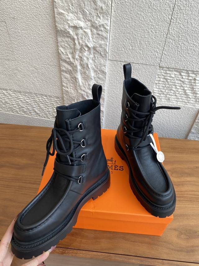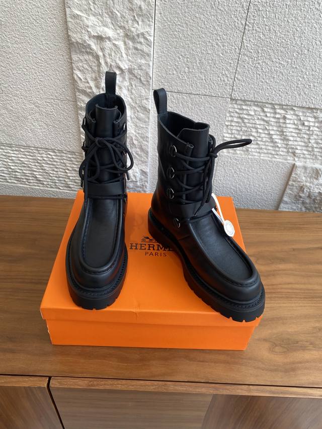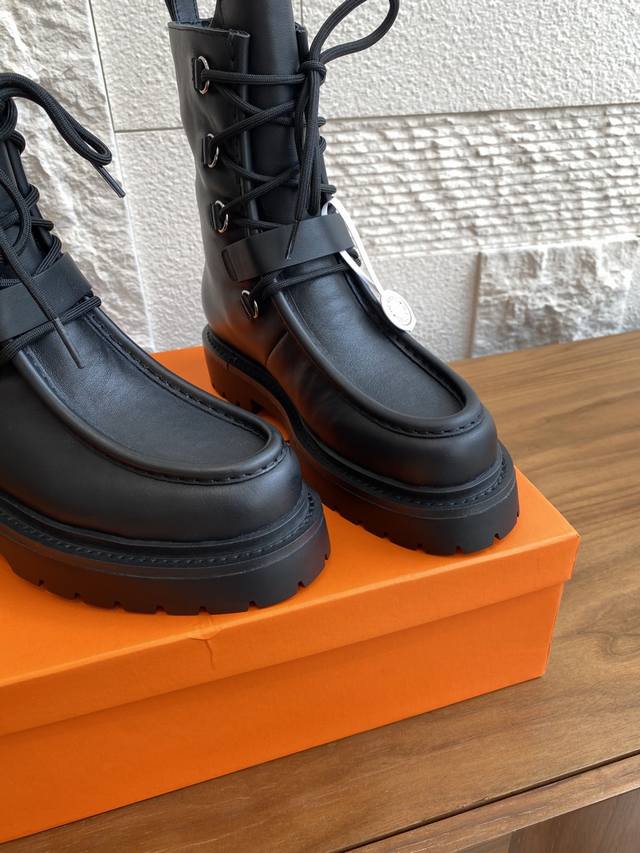 Hermes 25Ss Autumn/Winter New Land Lace-up Platform Ankle Boots. This is a 1:1 replica of the original, with a retail price exceeding 20,000 RMB, naturally reflecting its unique craftsmanship and quality. The boots are made with original imported custom calfskin leather, and the lining is also made with original imported cowhide. Every detail is meticulously replicated. Comfortable, easy to wear, and versatile urban style riding boots. Material: Original imported custom calfskin leather; Lining: Original imported cowhide leather; Outsole: Original molded rubber outsole; Size: 35-40 (40 is custom-made and non-refundable).