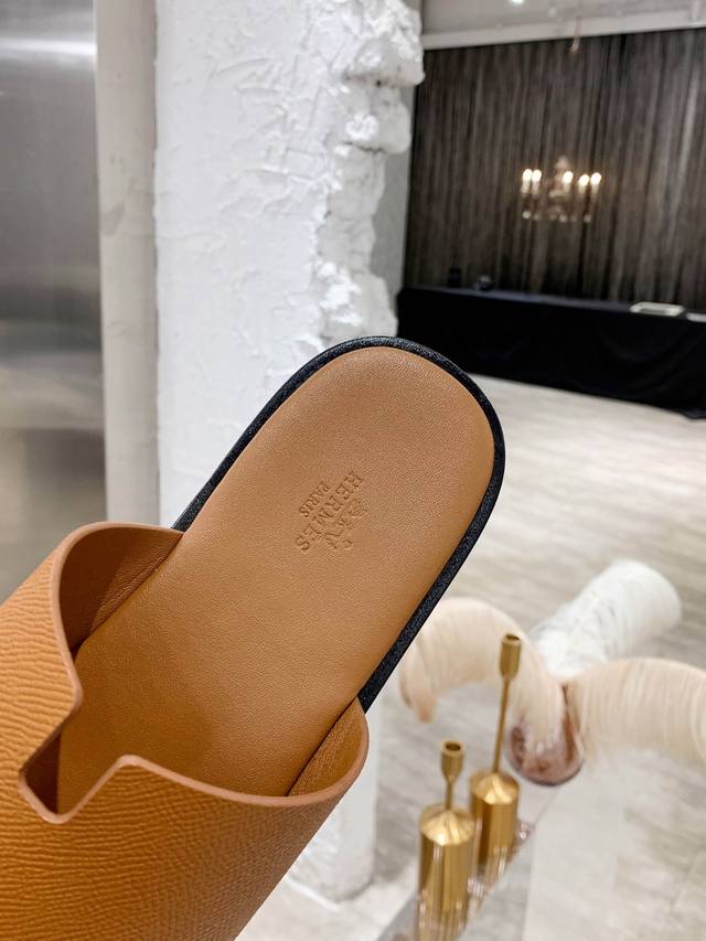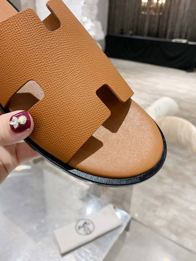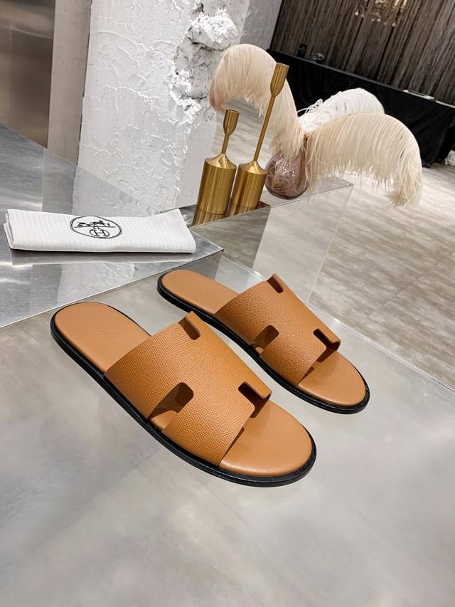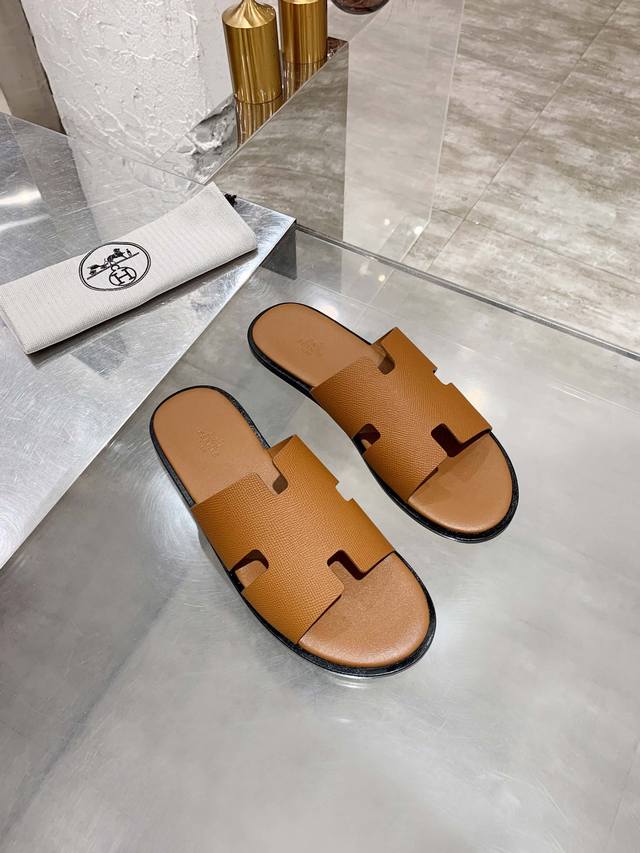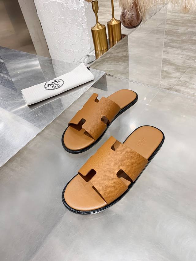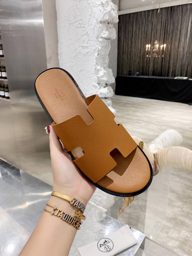 Upgraded brown palm-textured cowhide series Hernes genuine leather upper, sheepskin lining, high-end H men's slippers with durable rubber outsole, urgently needed in the market: exquisitely handcrafted. Original replica, sizes: 39-45, 38, 45, 46 custom orders are non-refundable and non-exchangeable. Includes full packaging. Rubber outsole, genuine leather outsole. 230 DDD
