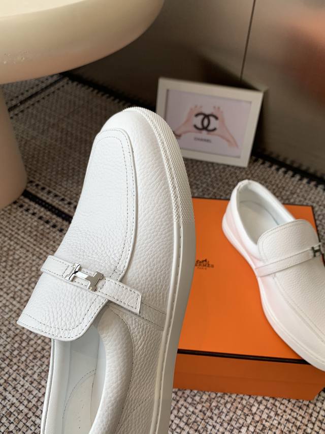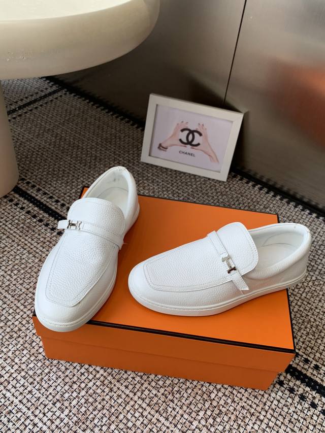 Women's & Men's Hermes Classic H Loafers Couple Style. Timeless British retro design, casual and simple style, no lace-up, comfortable and versatile. Material: Calfskin suede; Lining: Sheepskin; Outsole: Original molded outsole. Sizes: 35-45 (Women's 40, Men's 45, custom made).