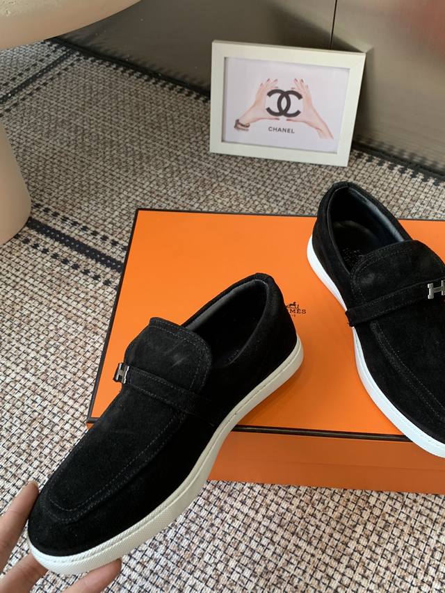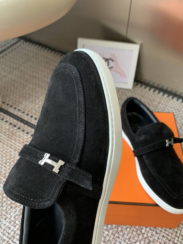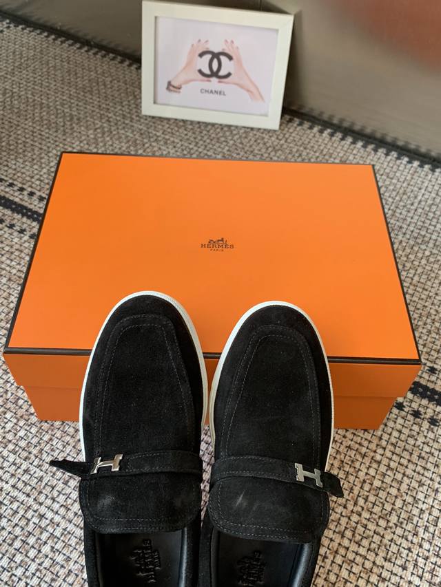 Women's & Men's Hermes Classic H Loafers Couple Style. Timeless British retro design, casual and simple style, no lace-up, comfortable and versatile. Material: Calfskin suede; Lining: Sheepskin; Outsole: Original molded outsole. Sizes: 35-45 (Women's 40, Men's 45, custom made).