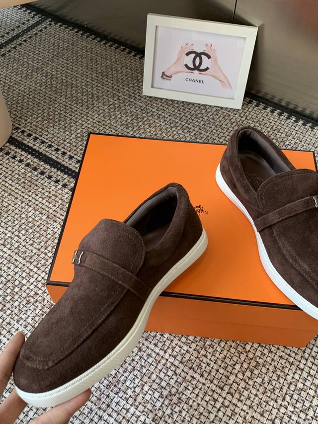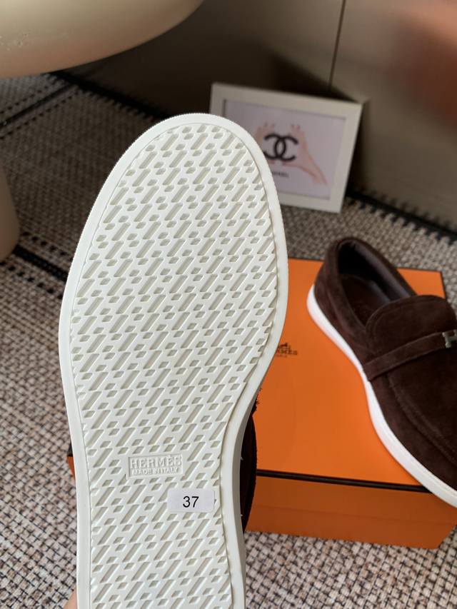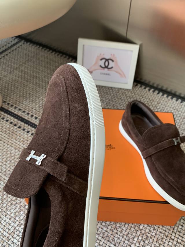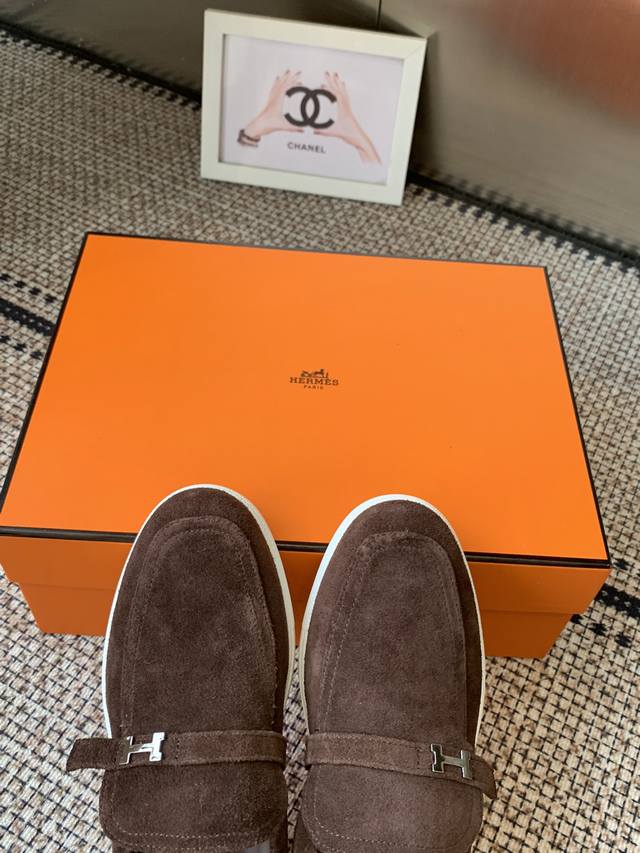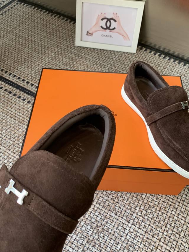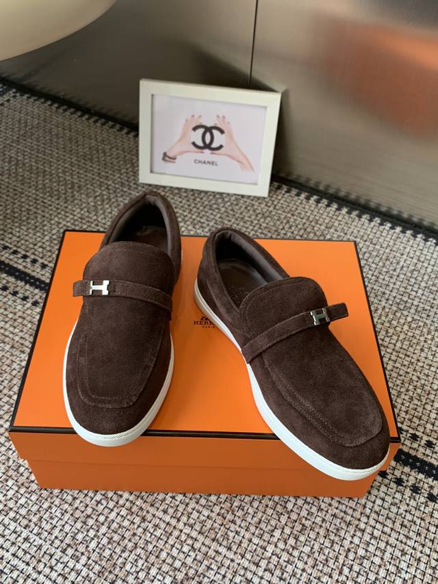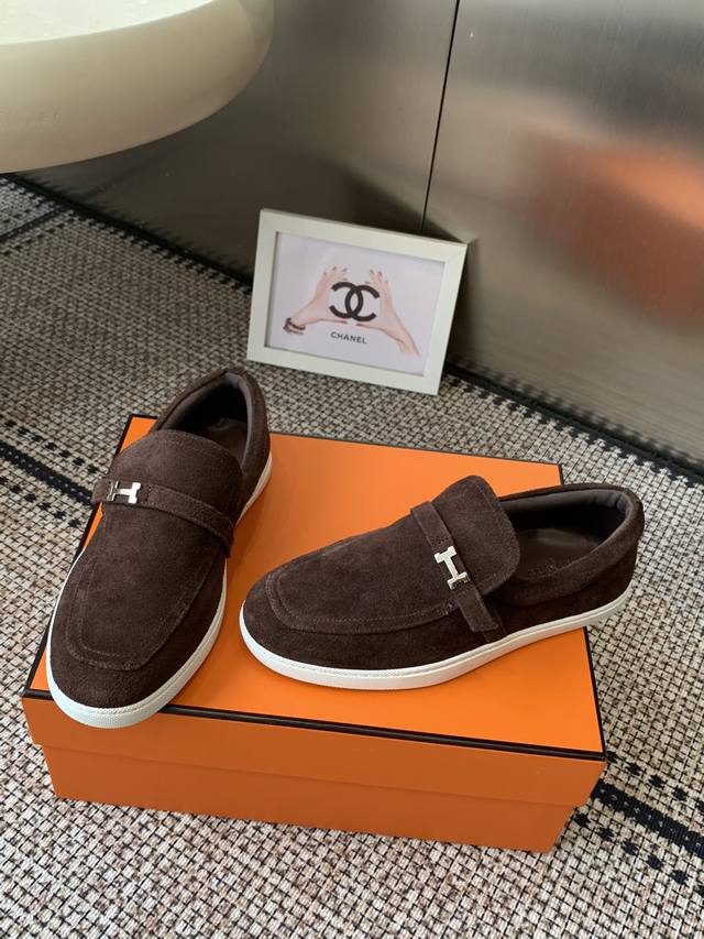 Women's & Men's Hermes Classic H Loafers Couple Style. Timeless British retro design, casual and simple style, no lace-up, comfortable and versatile. Material: Calfskin suede; Lining: Sheepskin; Outsole: Original molded outsole. Sizes: 35-45 (Women's 40, Men's 45, custom made).