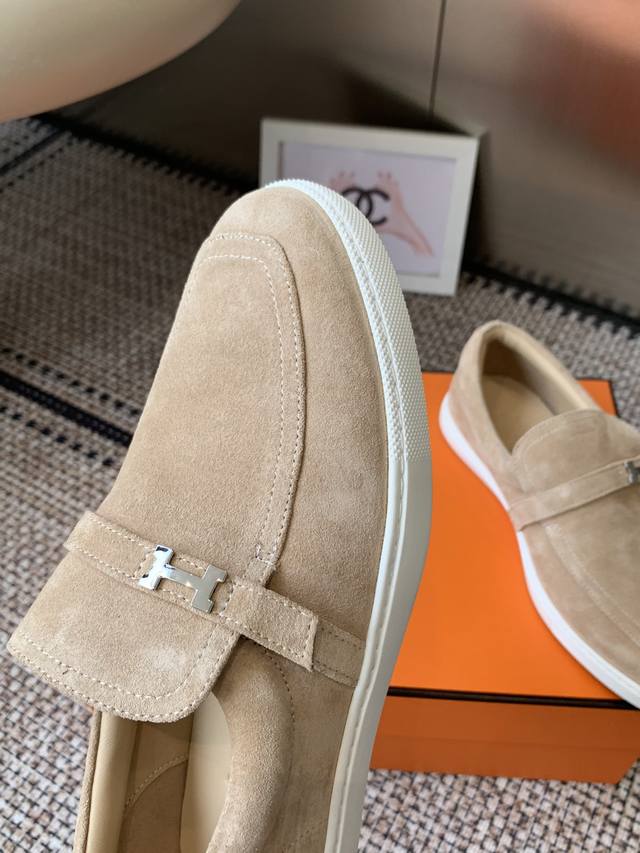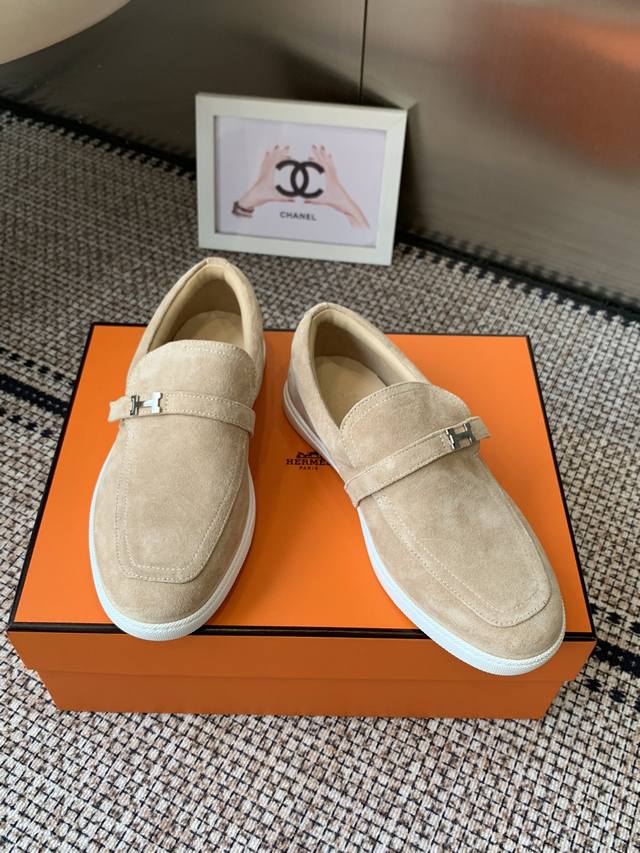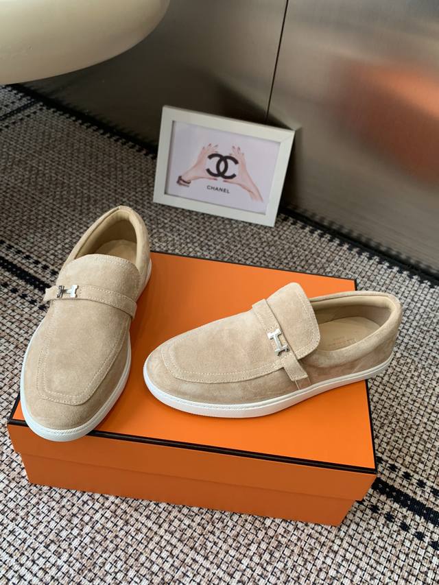 Women's & Men's Hermes Classic H Loafers Couple Style, Timeless British Retro Design, Casual and Simple Style, No Lace-up, Comfortable and Versatile. Material: Calfskin Suede; Lining: Sheepskin; Outsole: Original Mold Outsole. Sizes: 35-45 (Women's 40, Men's 45, Custom Made).