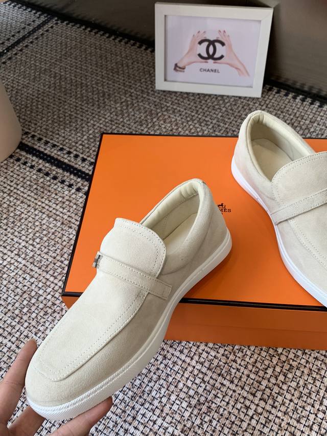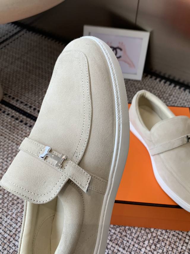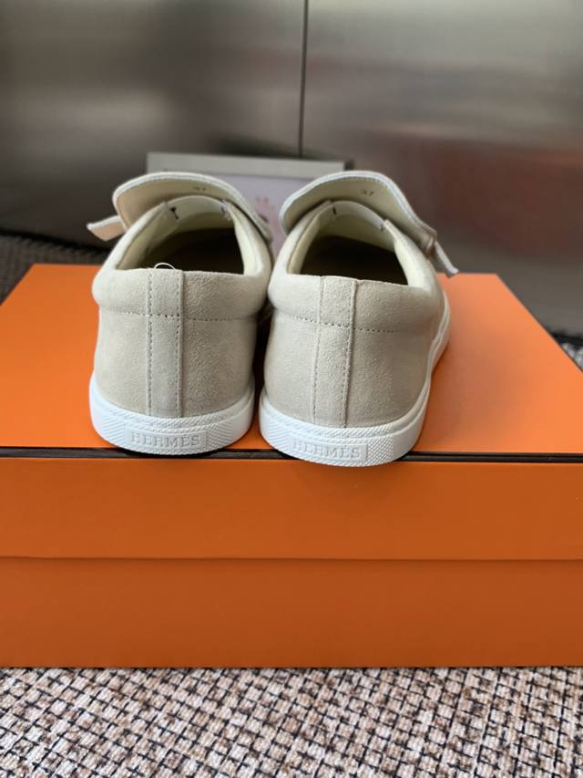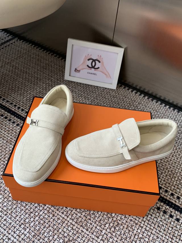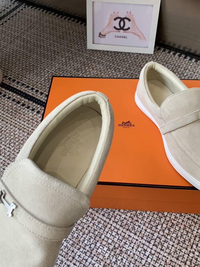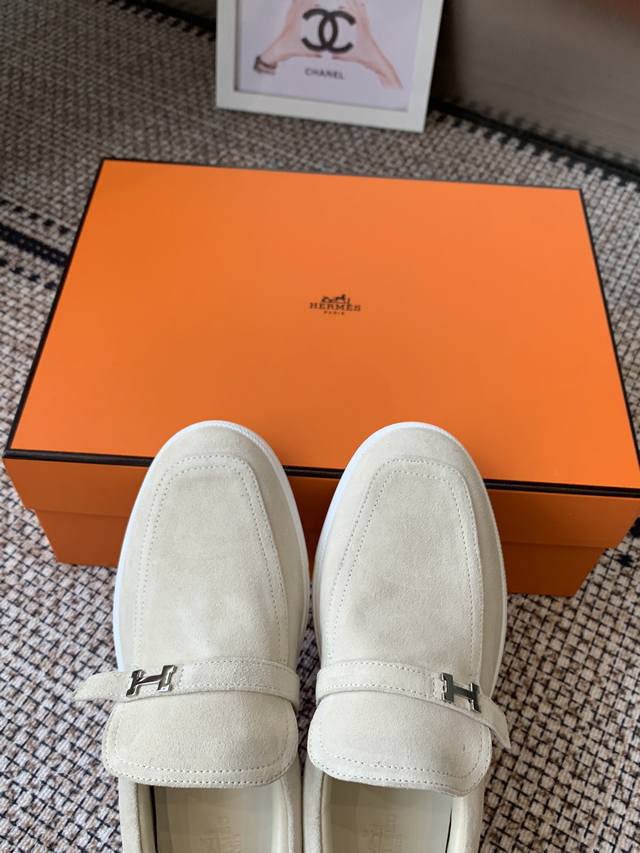 Women's & Men's Hermes Classic H Loafers Couple Style. Timeless British retro design, casual and simple style, no lace-up, comfortable and versatile. Material: Calfskin suede; Lining: Sheepskin; Outsole: Original molded outsole. Sizes: 35-45 (Women's 40, Men's 45, custom made).