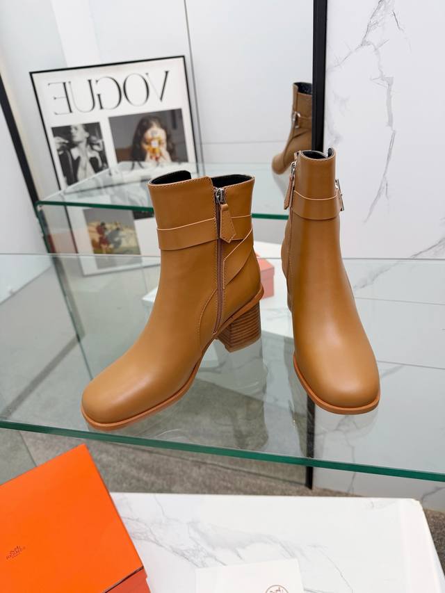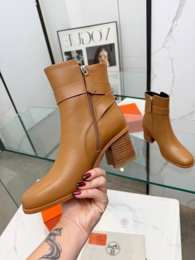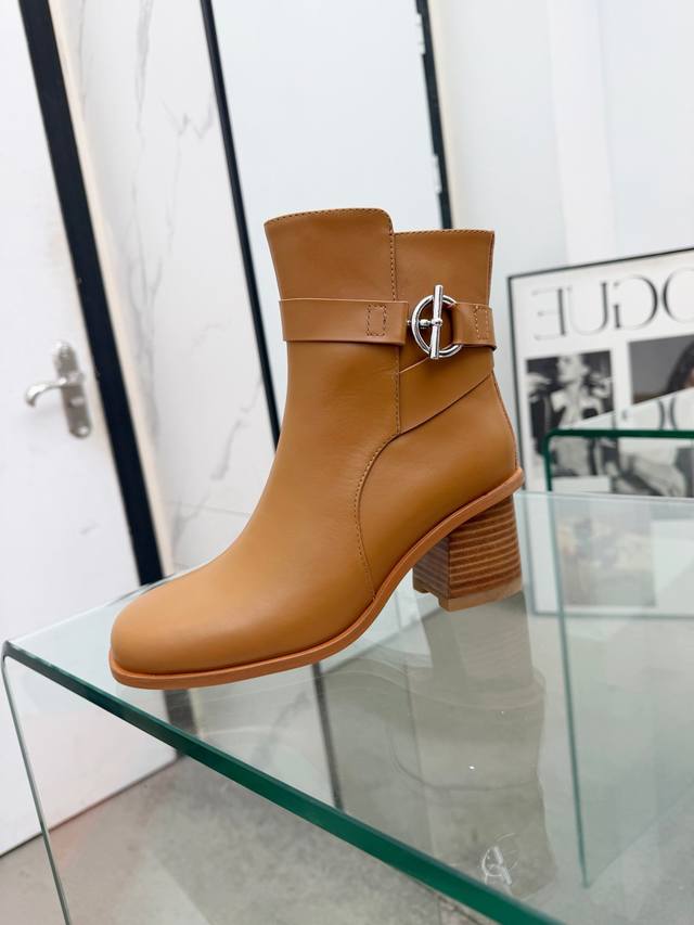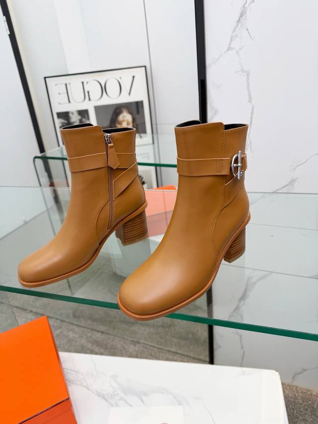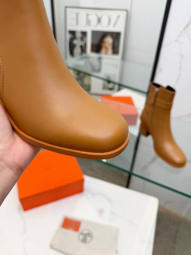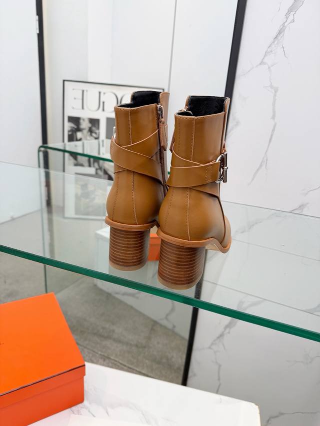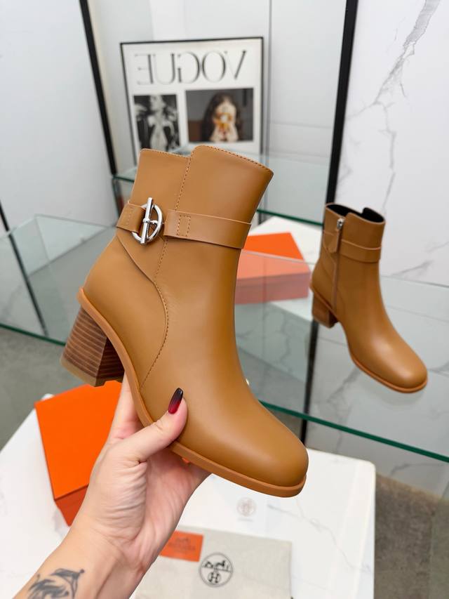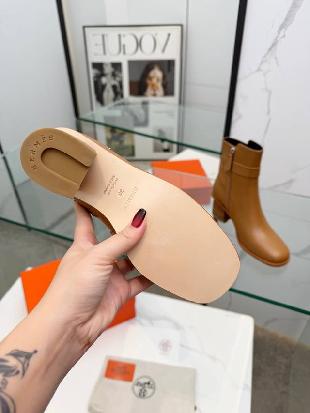 Factory direct Hermes boots, top-tier original 1:1 development. Hermes has released fewer ankle boots this year, but each one is a classic, and this one is no exception. The slender last gives it a very unique feel! It's very stable to walk in, and you won't feel tired at all. The pointed toe and stiletto heel design are versatile, classic, and fashionable. Original metal buckle. 1. Material: Imported calfskin. 2. Lining: Imported Italian water-dyed sheepskin, super soft and delicate. 3. Outsole: Italian original color private mold genuine leather outsole, heel height 6.0. 4. Sizes: 35-39, 40, 41. Customized.