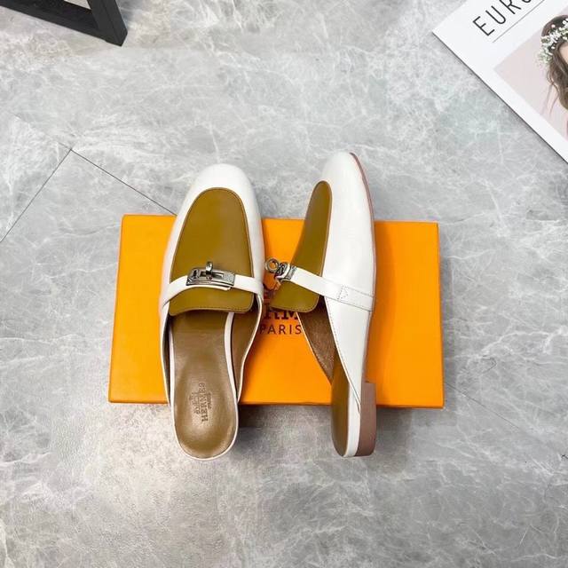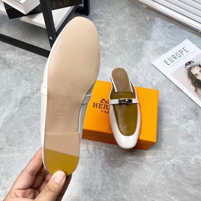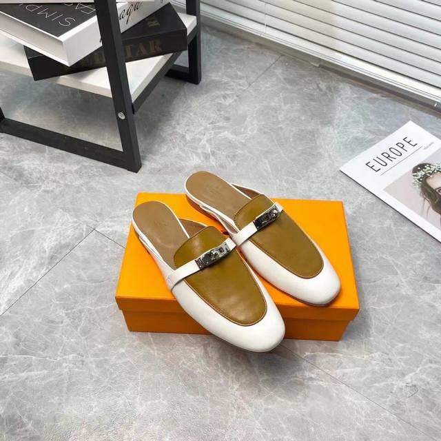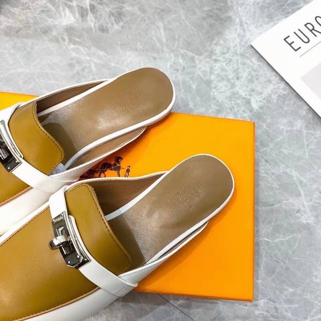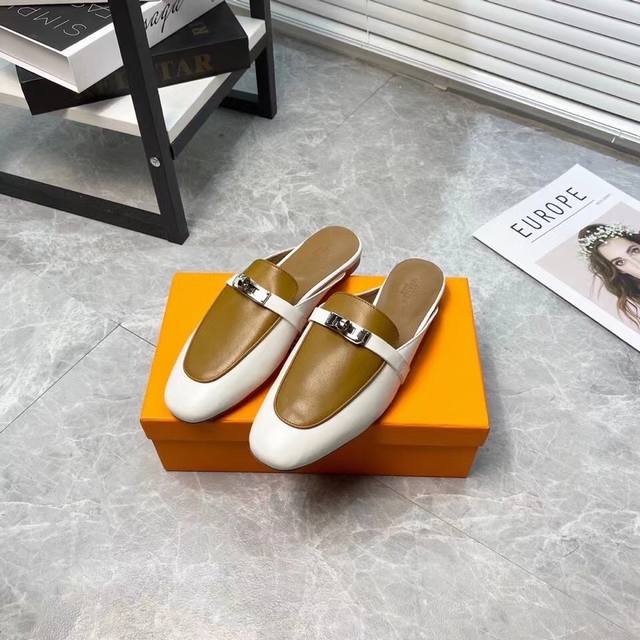 Factory direct price for women's clothing, shoes, and sportswear (original quality). Hermes classic Kelly buckle slippers, the latest color, designed by Hermes' chief shoe designer Pierre Hardy. Exquisite and luxurious lining pattern paired with the iconic Hermes saddle buckle. Original purchase and disassembly, imported custom fabric; all colors have been adjusted countless times to ensure zero difference from the original. Imported Italian top-grain calfskin. Custom-made original Argentine canvas 3D printed pattern. Sizes: 35-40, 34, 41, 42 (custom orders available).