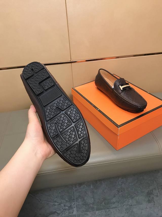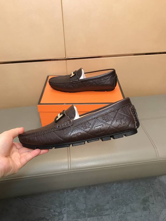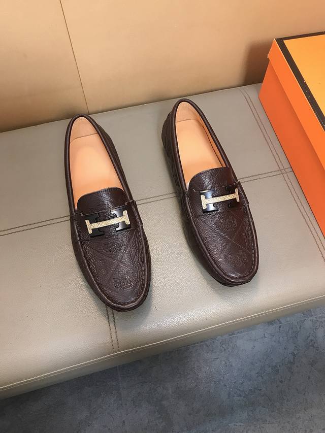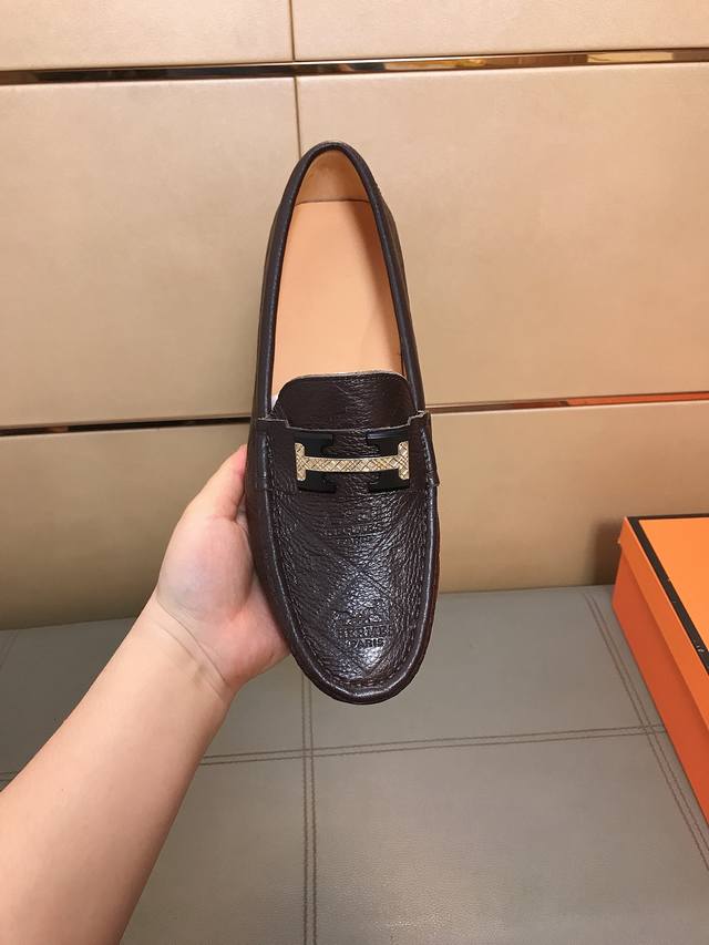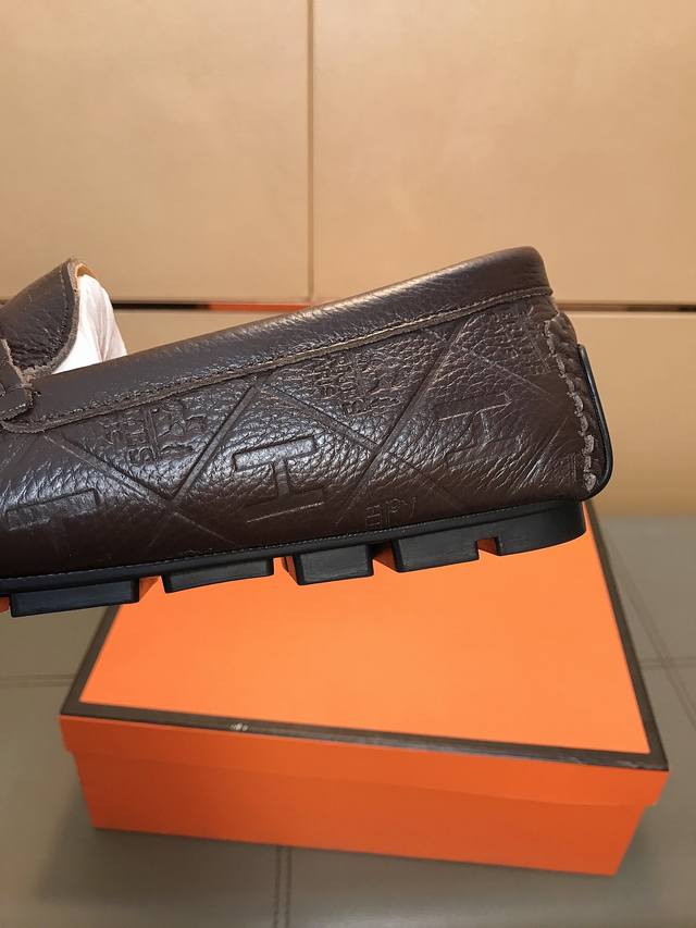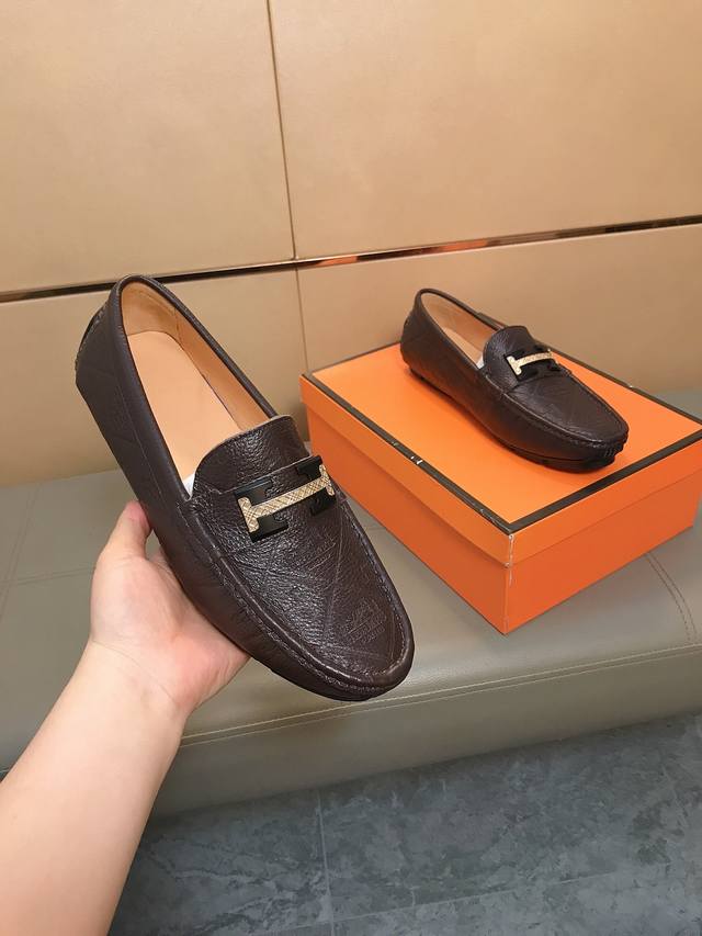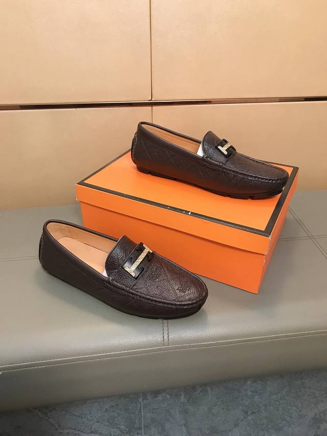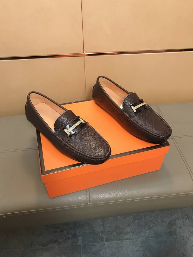 Factory direct price Hermes driving shoe series new arrival, men's slip-on shoes. The upper is made of imported Italian embossed cowhide, with a sheepskin lining; the leather is super soft and very comfortable. The design, combined with precise and beautiful stitching, exudes understated luxury. The comfortable sole design maximizes comfort and slip resistance. Sizes 38-44 DDD