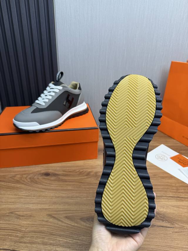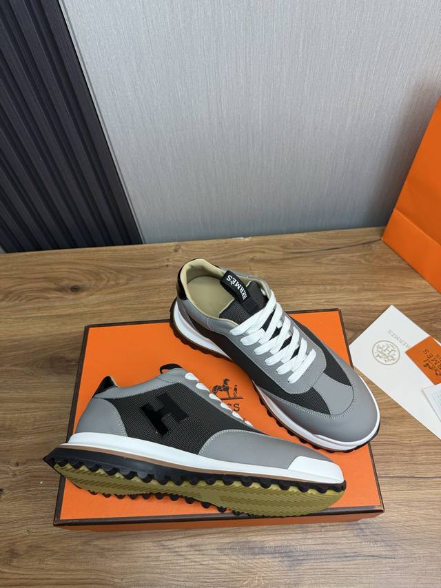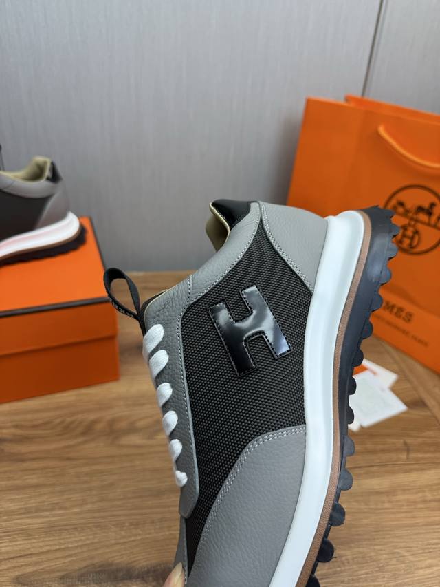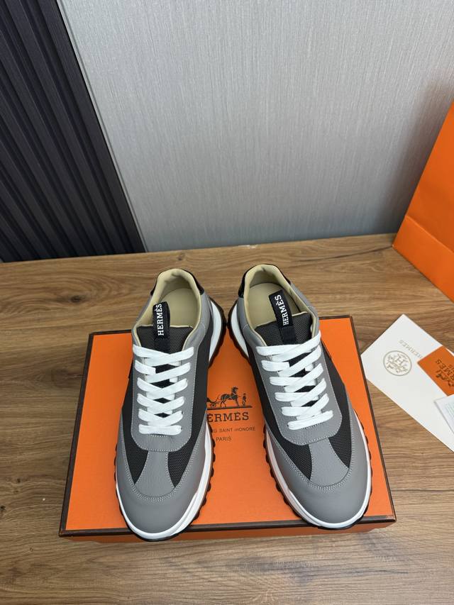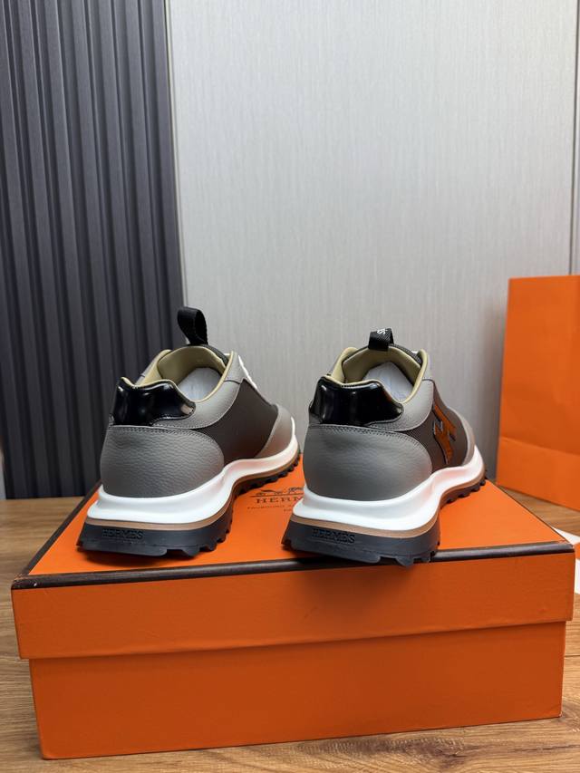 Factory direct price Hermes Leader sneakers! Multi-color patchwork high-tech twill, calfskin, and suede goatskin sneakers. Lightweight geometric sole for a stylish urban look. Product details: White and orange rubber sole; Black rubber sole with orange rubber inlays; Light natural leather inlays; White rubber toe; Beige lambskin insole and lining; Cotton straps with rubber lettering; Sole height: 4cm; Sizes: 39-40-41-42-43-44; 38.45 custom-made.