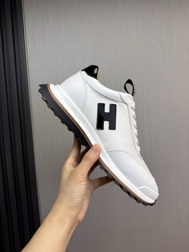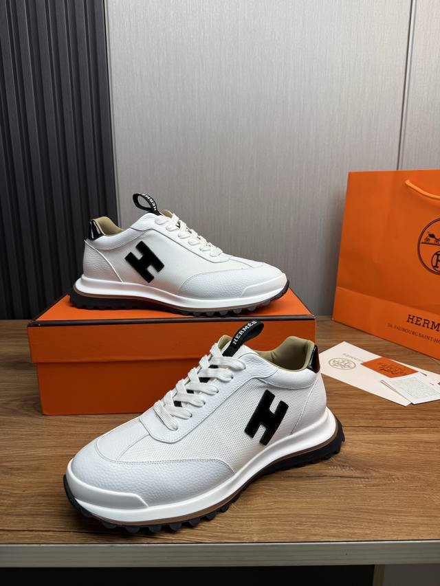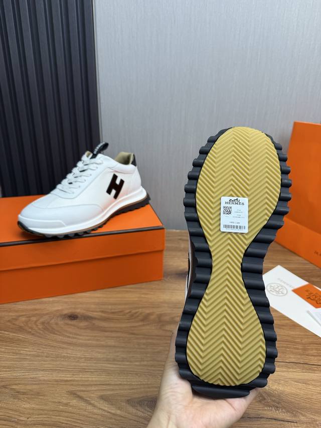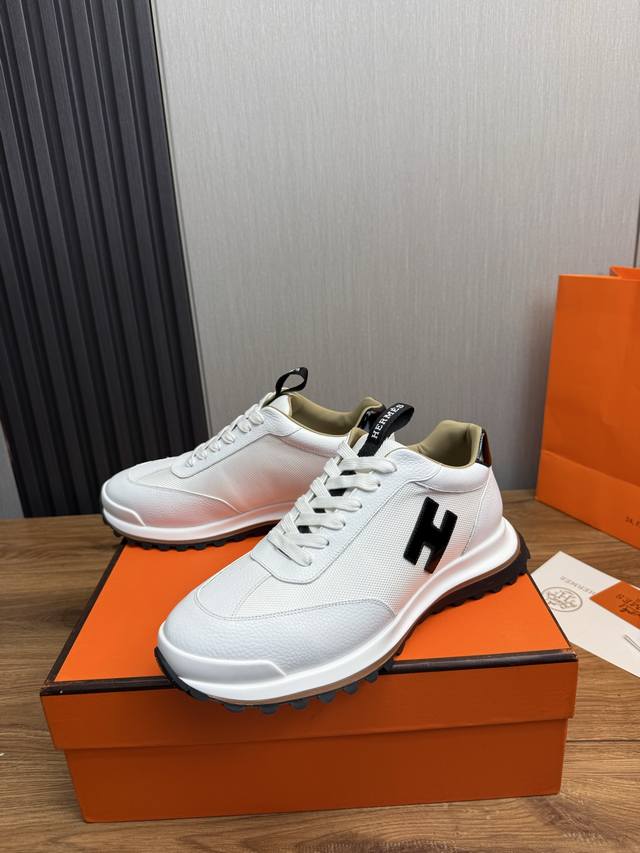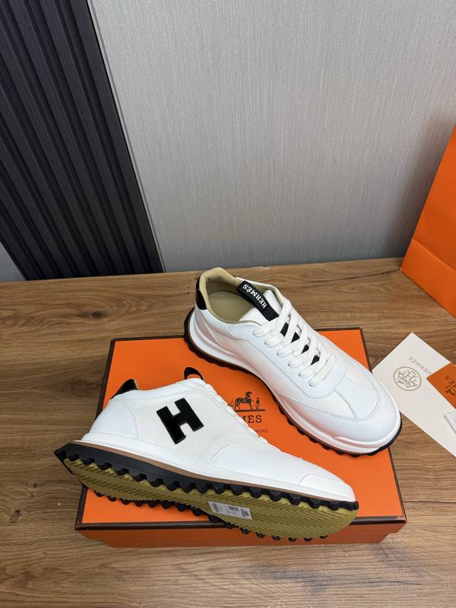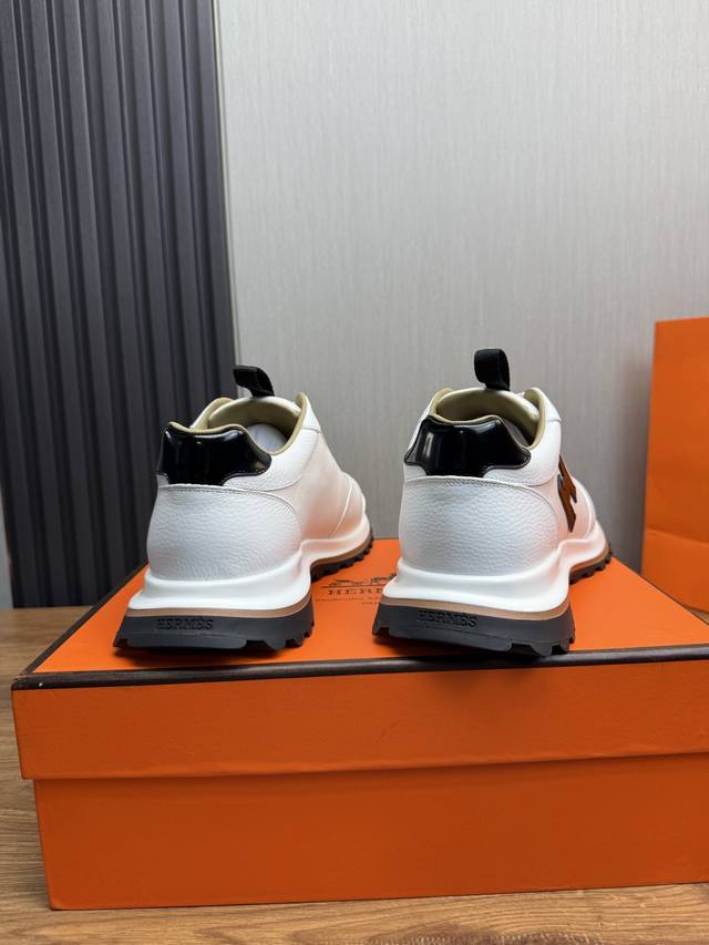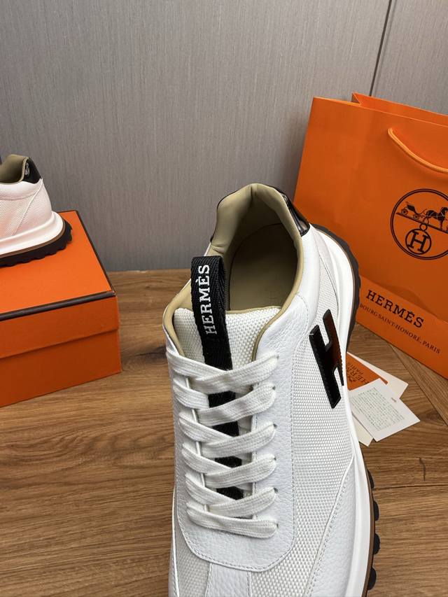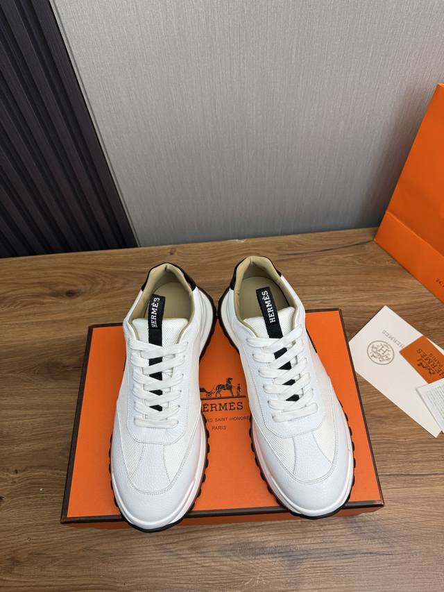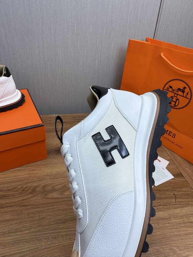 Factory direct price Hermes Leader sneakers! Multi-color patchwork high-tech twill, calfskin, and suede goatskin sneakers. Lightweight geometric sole for a stylish urban look. Product details: White and orange rubber sole; Black rubber sole with orange rubber inlays; Light natural leather inlays; White rubber toe; Beige lambskin insole and lining; Cotton straps with rubber lettering; Sole height: 4cm; Sizes: 39-40-41-42-43-44; 38.45 custom-made.