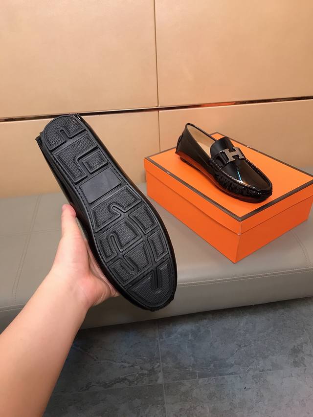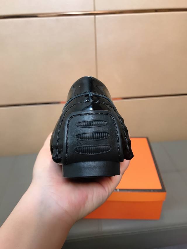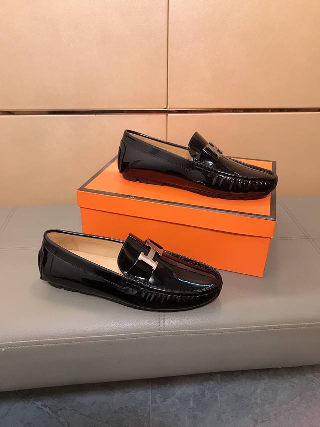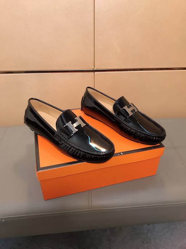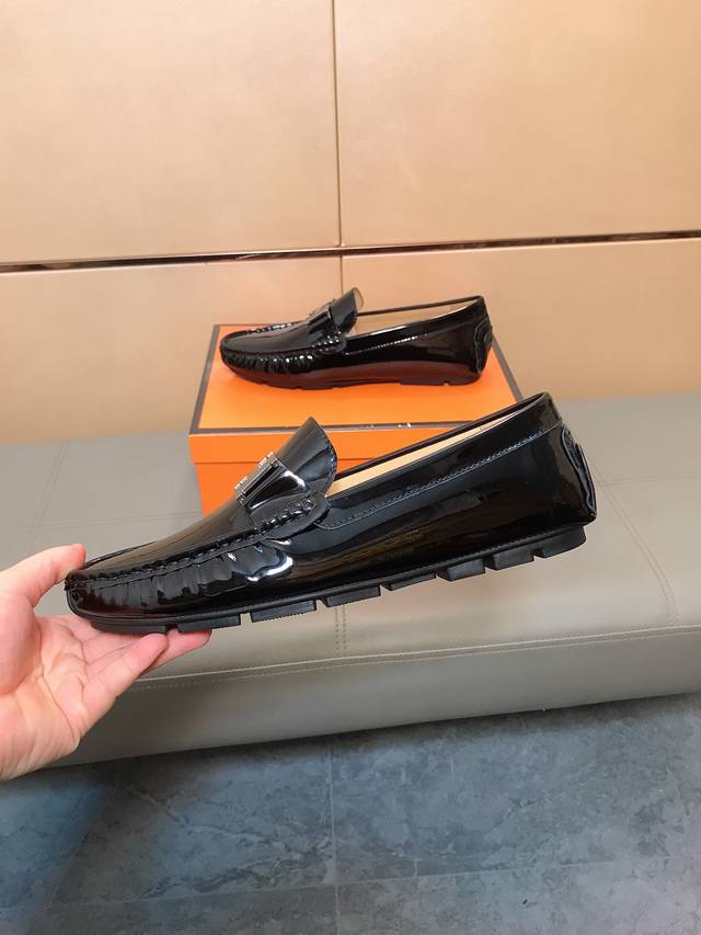 Factory direct price Hermes men's driving shoes, new style, Italian imported patent leather, sheepskin lining, sole: specially supplied rubber outsole, exclusive molded sole for super comfort, high quality, sizes: 38-44.