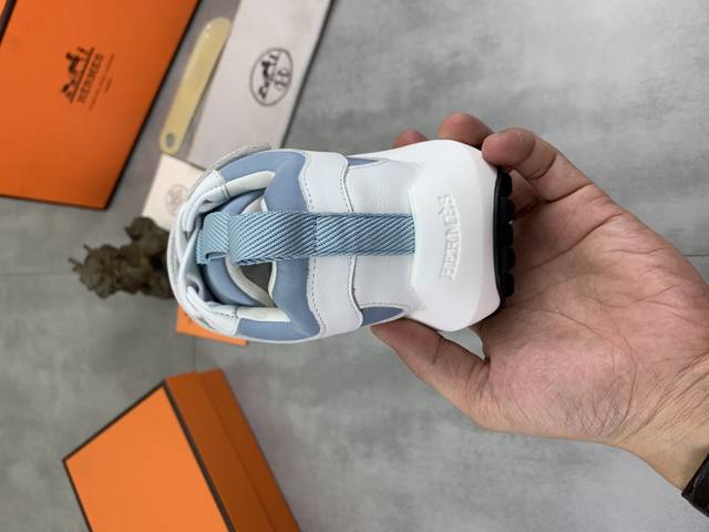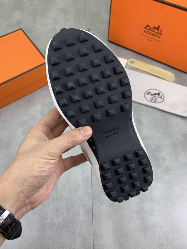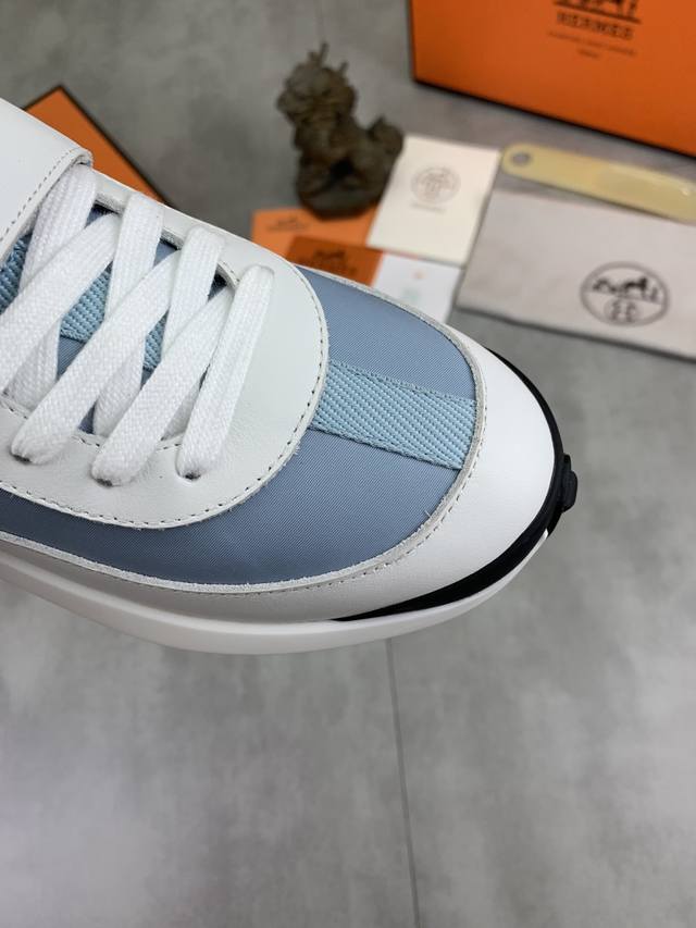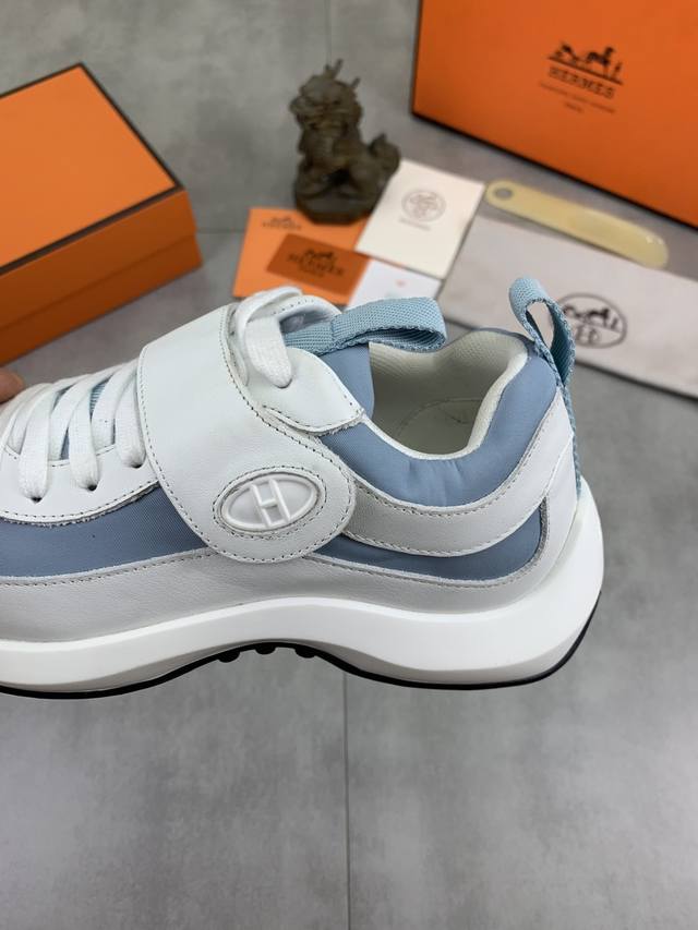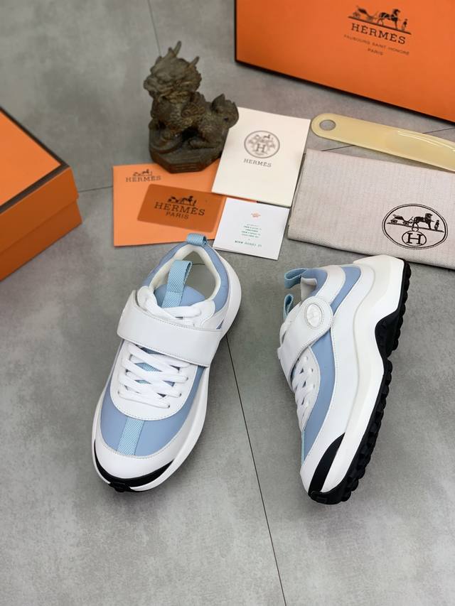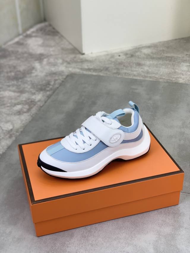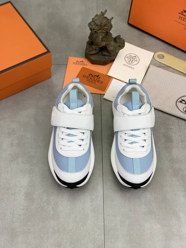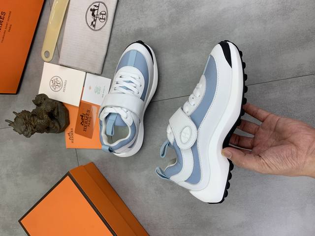 Factory direct price, top-tier original Hermes Drift Sneaker, autumn new casual sports shoes. Original purchase and manufacturing. Hermes men's classic series, technologically advanced breathable fabric paired with cowhide leather. Casual sneakers, combining high-tech breathable materials and cowhide leather. Features Hermes exclusive button decoration on the side, a full "H" slanted design on the outsole, and vibrant colors showcasing vitality, continuing the brand's design inspiration. Lightly stroll through the city, feeling unrestrained comfort. Comes with exquisite packaging. Material: Original custom breathable material + top-grain cowhide. Lining: Cowhide insole. Outsole: Molded and hollowed-out PU + TPU material. Size: Women's 34-40, 41 (custom made). 8 colors available. Premium packaging.