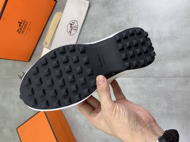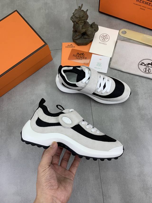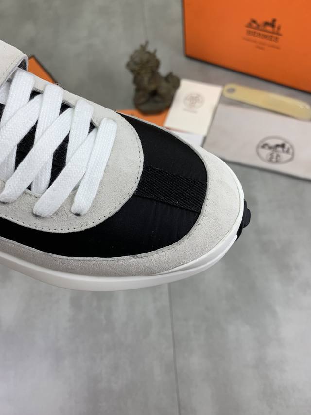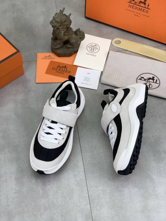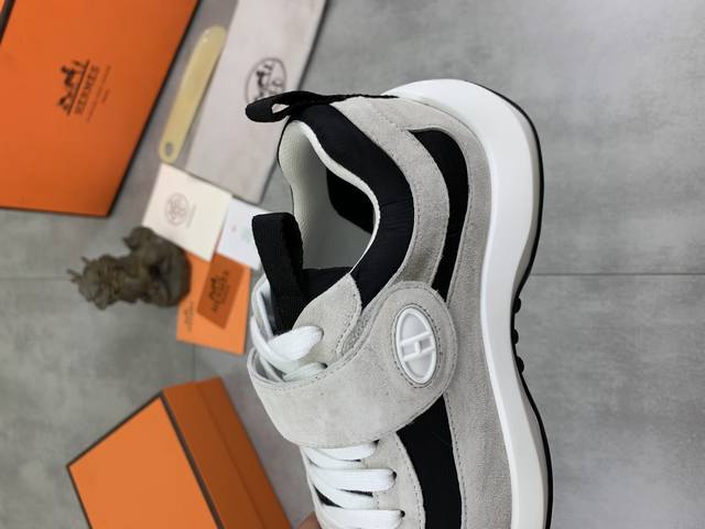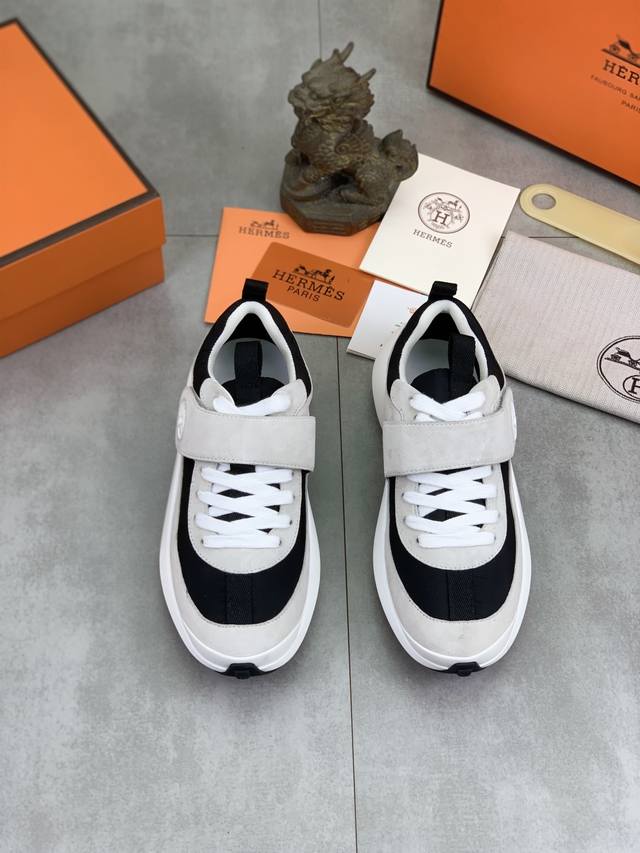Factory direct price, top-tier original Hermes Drift Sneaker, autumn new casual sports shoes. Original purchase and development. Hermes men's classic series, technologically breathable fabric paired with cowhide leather, casual sneakers, combining high-tech breathable materials and cowhide leather. Features Hermes exclusive button decoration on the side, a full "H" slanted design on the outsole, and vibrant colors showcasing vitality, continuing the brand's design inspiration. Lightly stroll through the city, feeling unrestrained comfort. Comes with exquisite packaging. Material: Original custom breathable material + top-grain cowhide. Lining: Cowhide insole. Outsole: Molded and hollowed-out PU + TPU material. Size: Women's 34-40 41, custom-made men's 39-45. 8 colors available. Premium packaging.
