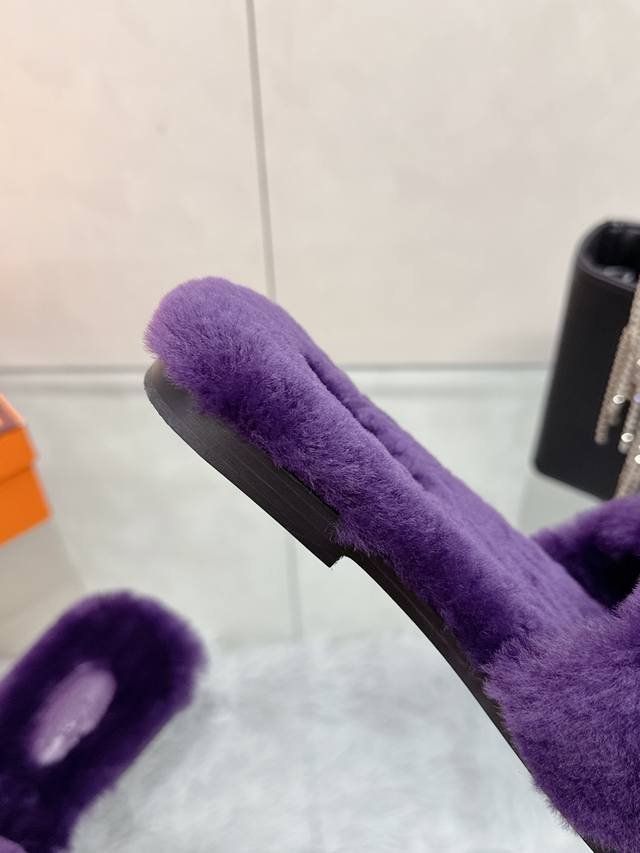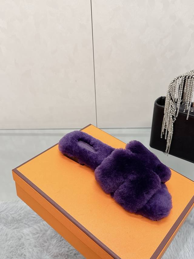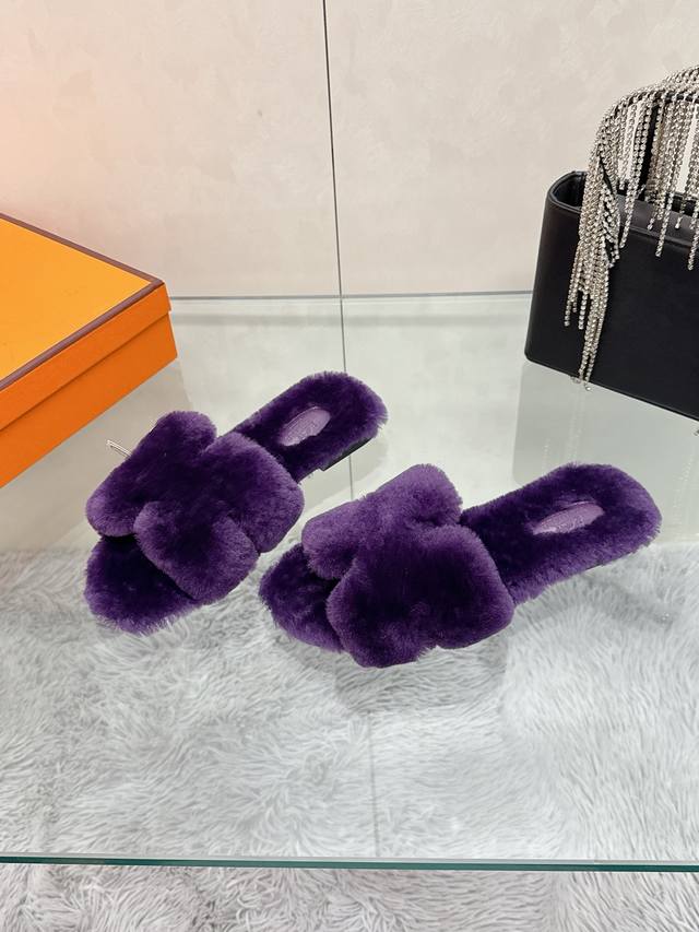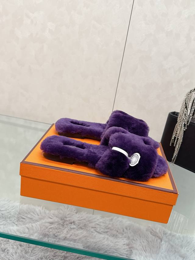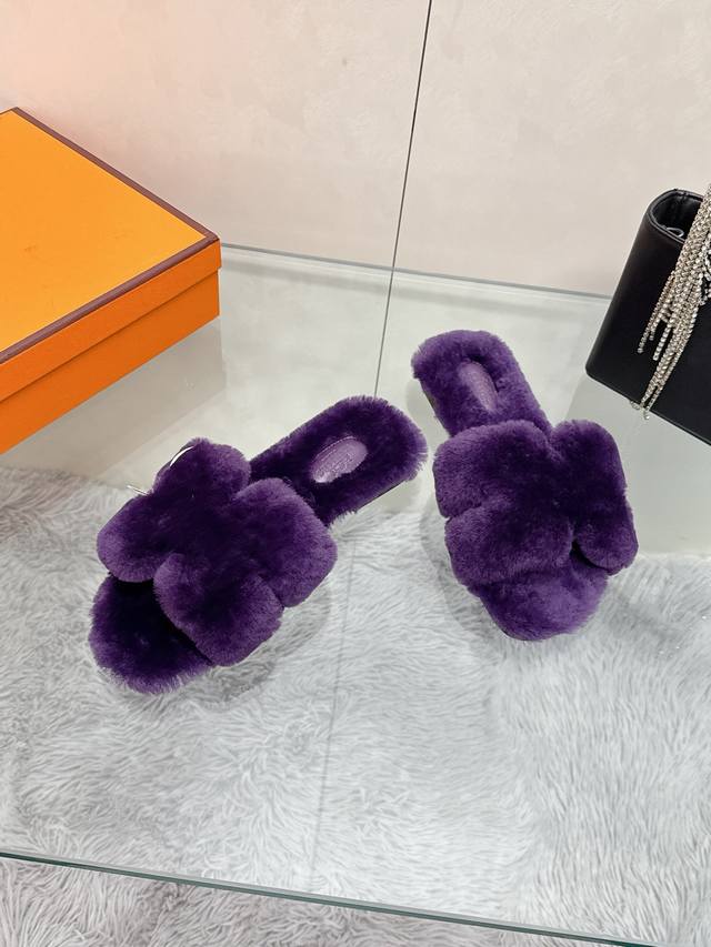 Factory Price: Hermes Classic H Slippers, High-End Wool Craftsmanship, Classic Evergreen Series Item. Material: Shearling. Insole: Scraped wool. All insole materials: Genuine leather + Italian craftsmanship combination. Outsole: Italian genuine leather sole with hand-studded details. Sizes: 35-40. Original full packaging. Details are visible to the naked eye. Original replica, comparable to genuine single-item items.