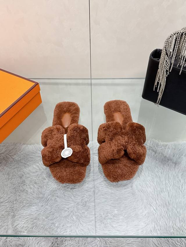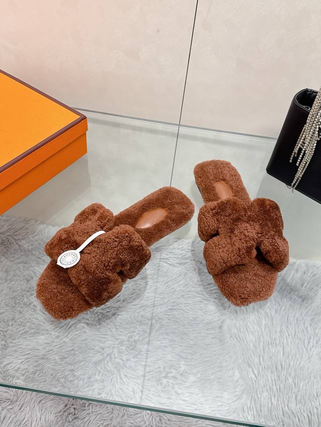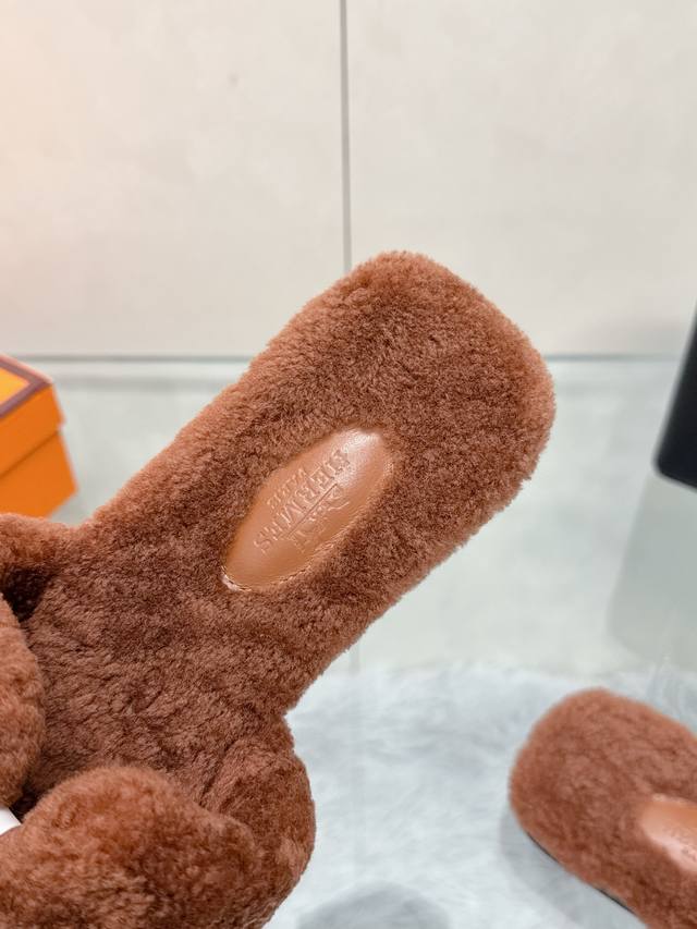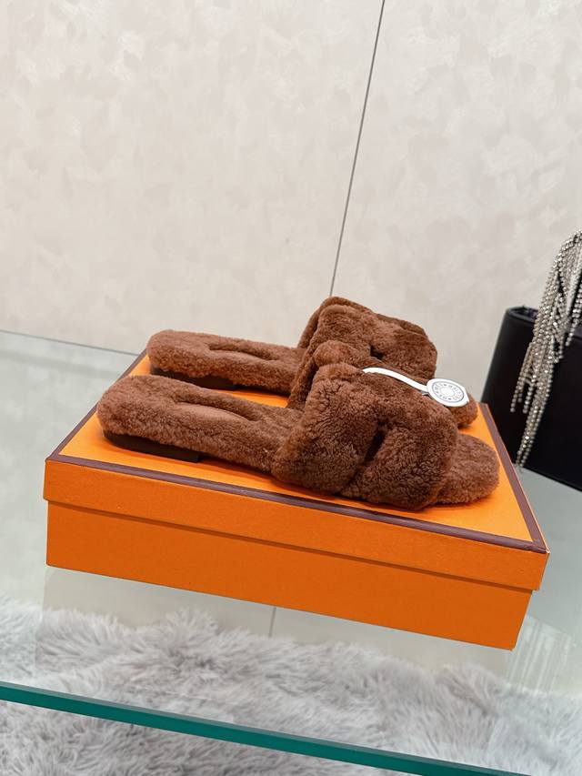 Factory Price: Hermes Classic H Slippers, High-End Wool Craftsmanship, Classic Evergreen Series Item. Material: Shearling. Insole: Scraped wool. All insole materials: Genuine leather + Italian craftsmanship combination. Outsole: Italian genuine leather sole with hand-studded details. Sizes: 35-40. Original full packaging. Details are visible to the naked eye. Original replica, comparable to genuine single-item items.