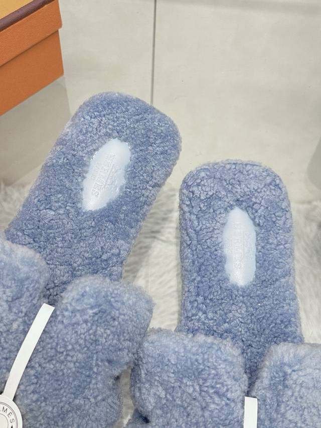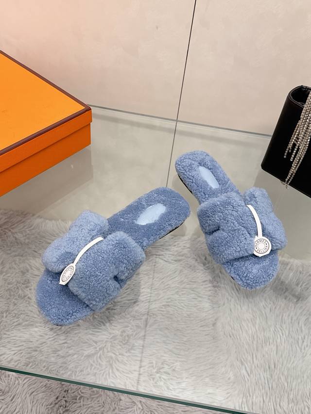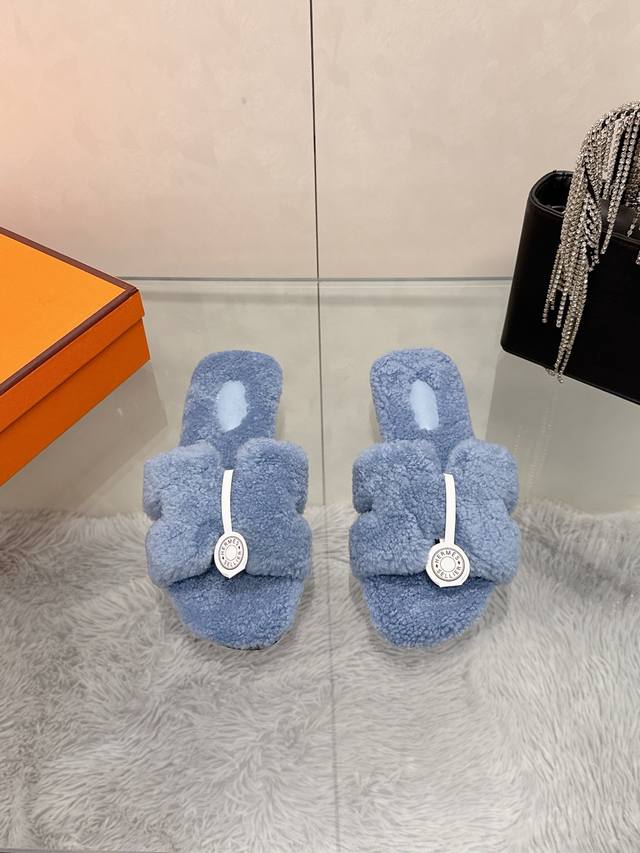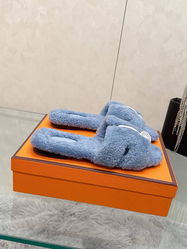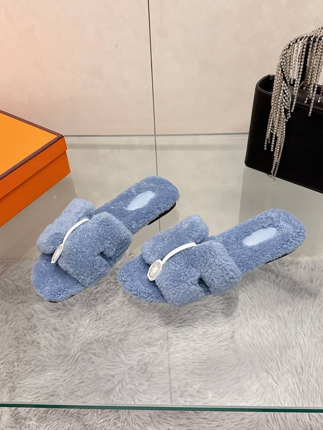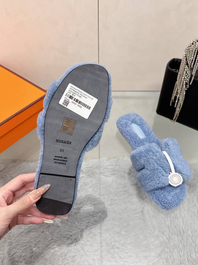 Factory Price: Hermes Classic H Slippers, High-End Wool Craftsmanship, Classic Evergreen Series Item. Material: Shearling. Insole: Scraped wool. All insole materials: Genuine leather + Italian craftsmanship combination. Outsole: Italian genuine leather sole with hand-studded details. Sizes: 35-40. Original full packaging. Details are visible to the naked eye. Original replica, original single item, comparable.