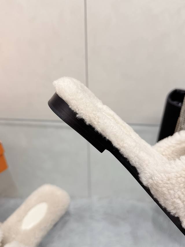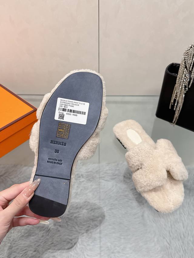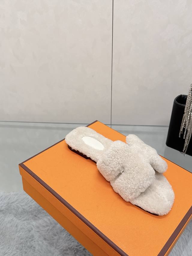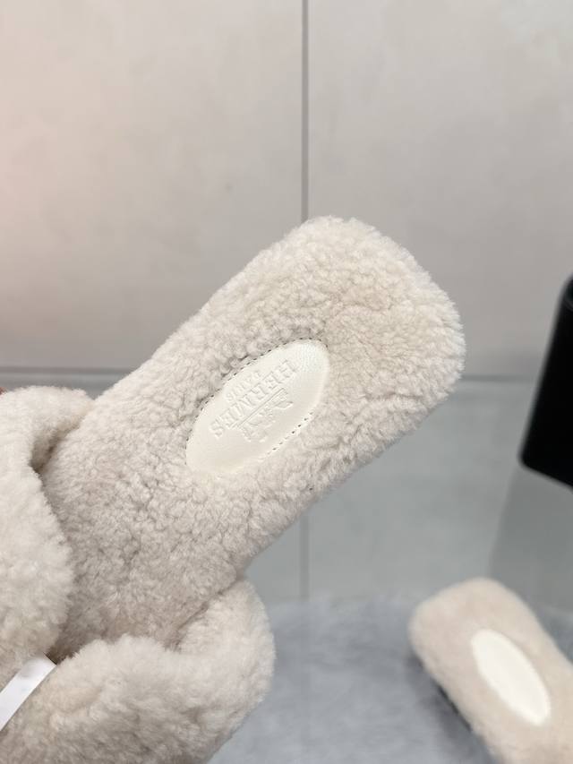 Factory Price: Hermes Classic H Slippers, High-End Wool Craftsmanship, Classic Evergreen Series Item. Material: Shearling. Insole: Scraped wool. All insole materials: Genuine leather + Italian craftsmanship combination. Outsole: Italian genuine leather sole with hand-studded details. Sizes: 35-40. Original full packaging. Details are visible to the naked eye. Original replica, original single item, comparable.