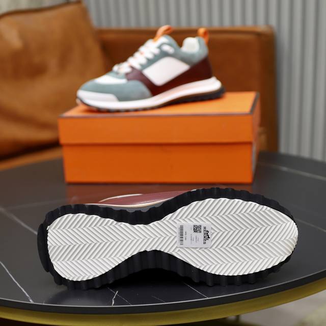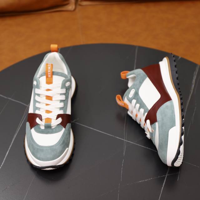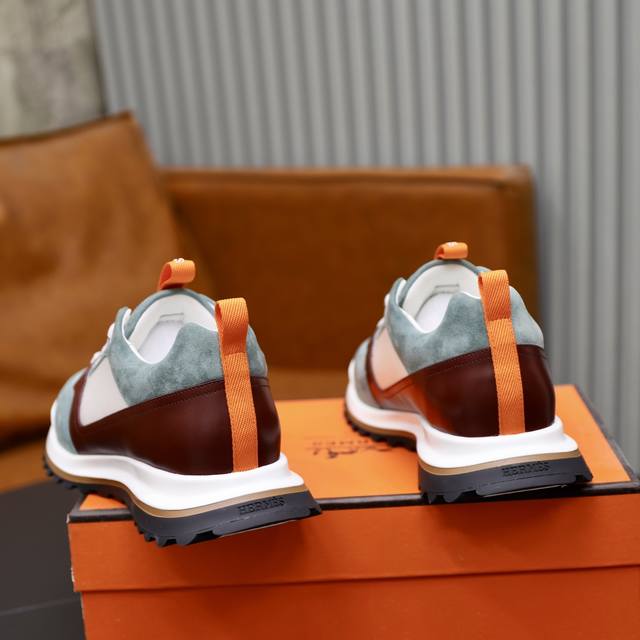 Factory Price: Hermes Leader Sneakers! Multi-color patchwork high-tech twill, calfskin, and suede goatskin sneakers. Lightweight geometric sole for a stylish urban look. Product Details: White and orange rubber sole; Black rubber sole with orange rubber inlays; Light natural leather inlays; White rubber toe; Leather insole; Mesh insole and lining; Cotton straps with rubber lettering; Sole height: 4cm; Sizes: 39-40-41-42-43-44; 38.45 (Custom made).