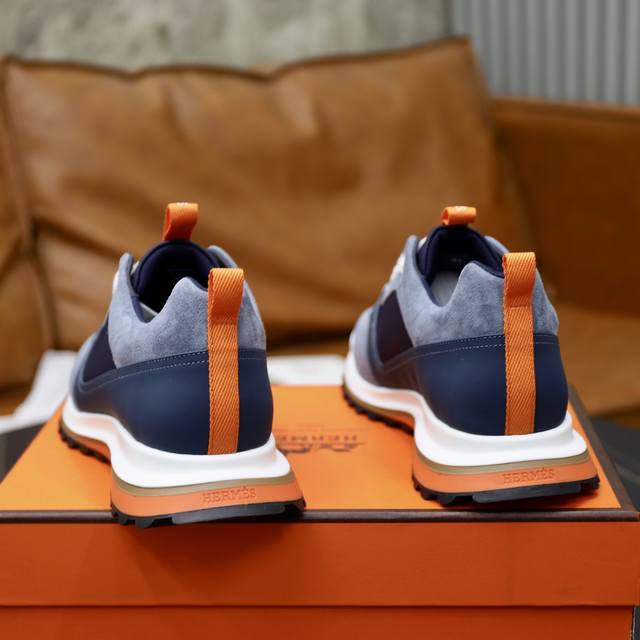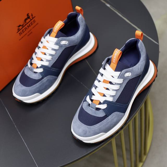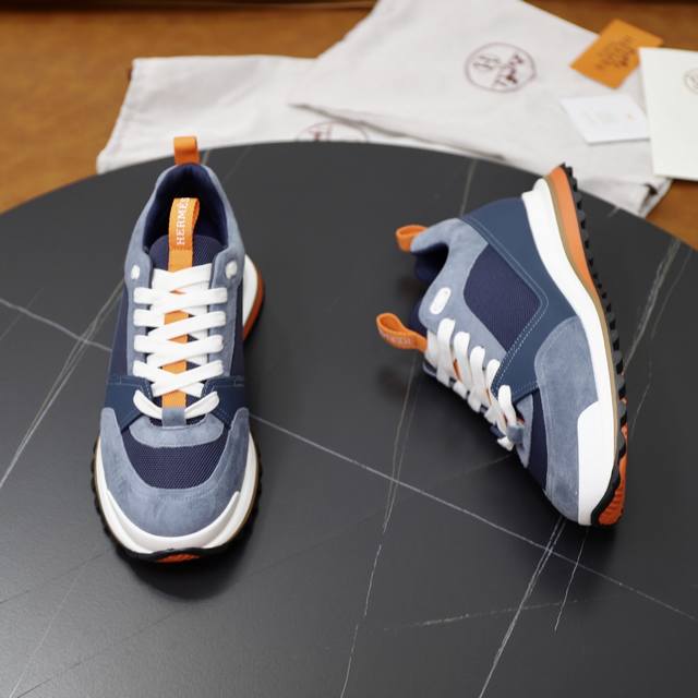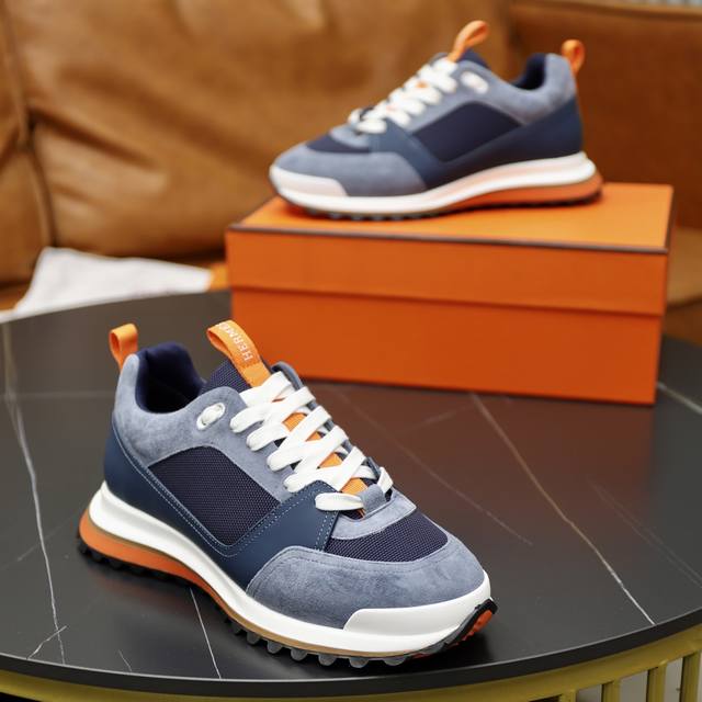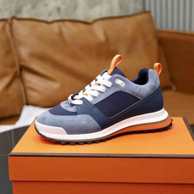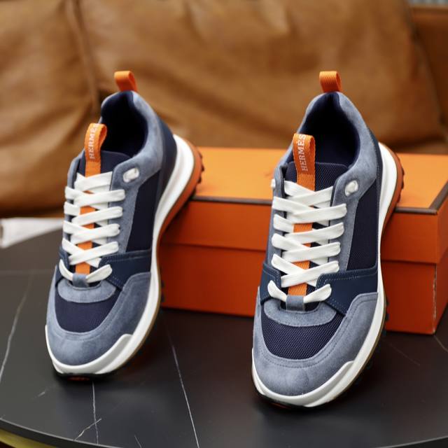 Factory Price: Hermes Leader Sneakers! Multi-color patchwork high-tech twill, calfskin, and suede goatskin sneakers. Lightweight geometric sole for a stylish urban look. Product Details: White and orange rubber sole; Black rubber sole with orange rubber inlays; Light natural leather inlays; White rubber toe; Leather insole; Mesh insole and lining; Cotton straps with rubber lettering; Sole height: 4cm; Sizes: 39-40-41-42-43-44; 38.45 (Custom made).