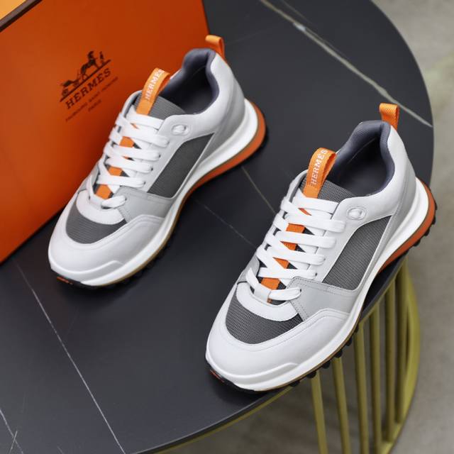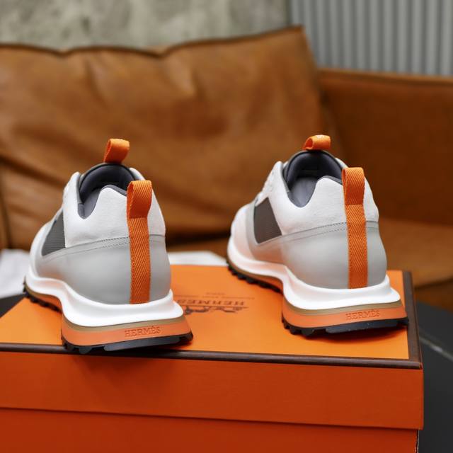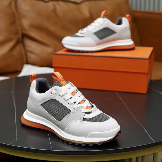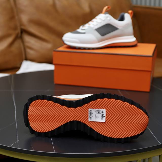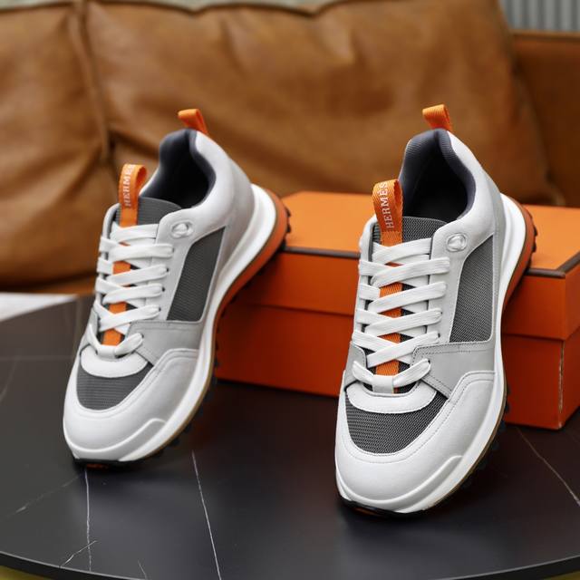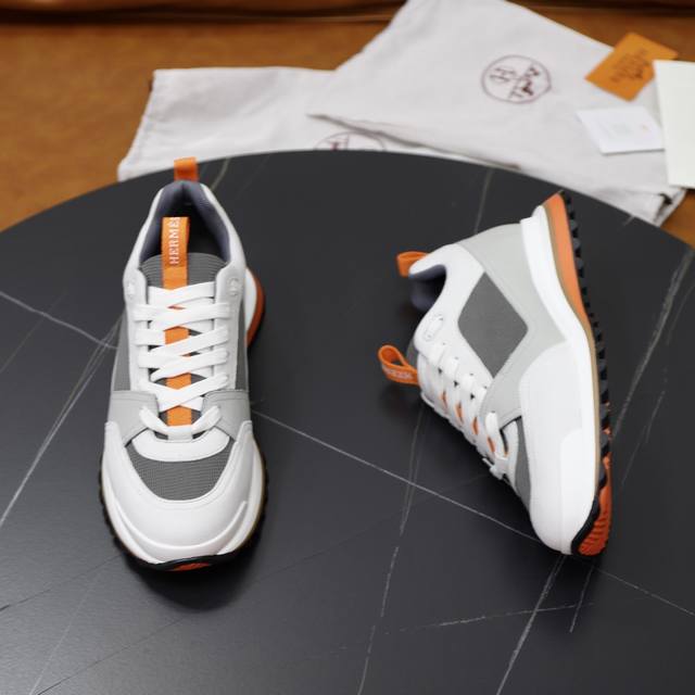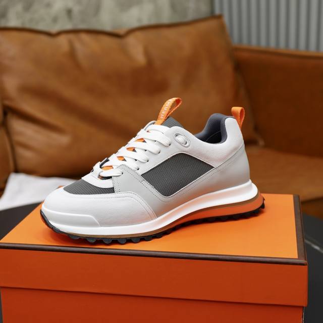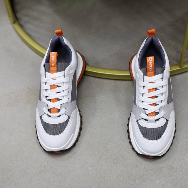 Factory Price: Hermes Leader Sneakers! Multi-color patchwork high-tech twill, calfskin, and suede goatskin sneakers. Lightweight geometric sole for a stylish urban look. Product Details: White and orange rubber sole; Black rubber sole with orange rubber inlays; Light natural leather inlays; White rubber toe cap; Leather insole; Mesh insole and lining; Cotton straps with rubber lettering; Sole height: 4cm; Sizes: 39-40-41-42-43-44; 38.45 (Custom made).