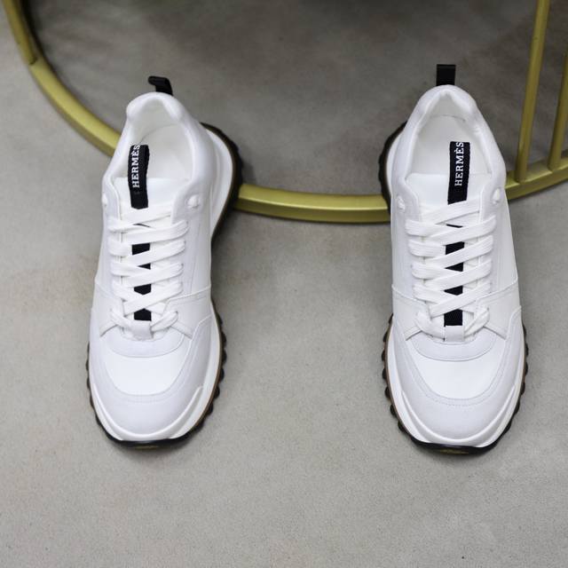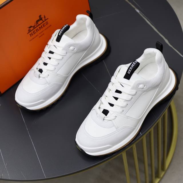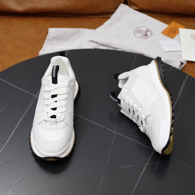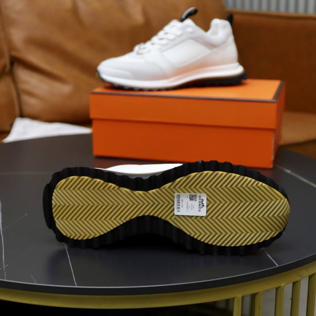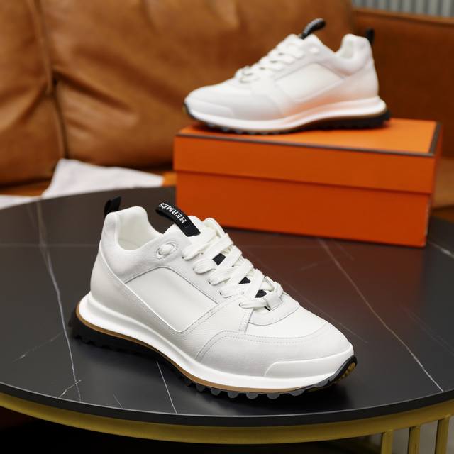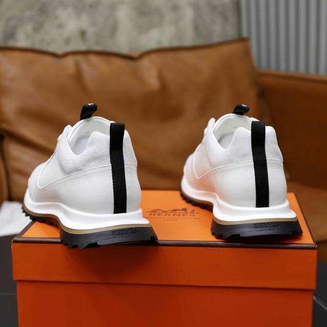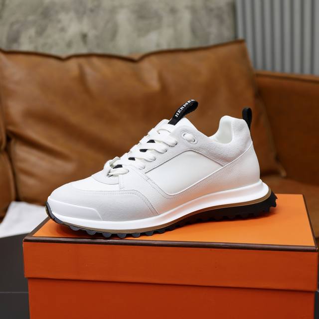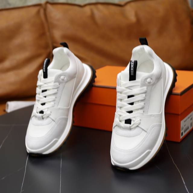 Factory Price: Hermes Leader Sneakers! Multi-color patchwork high-tech twill, calfskin, and suede goatskin sneakers. Lightweight geometric sole for a stylish urban look. Product Details: White and orange rubber sole; Black rubber sole with orange rubber inlays; Light natural leather inlays; White rubber toe; Leather insole; Mesh insole and lining; Cotton straps with rubber lettering; Sole height: 4cm; Sizes: 39-40-41-42-43-44; 38.45 (Custom made).