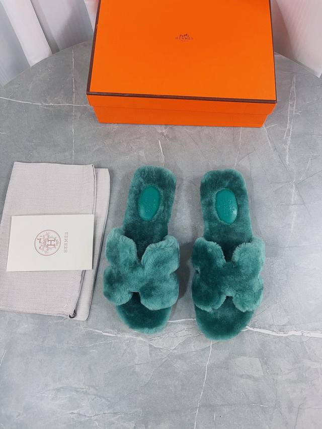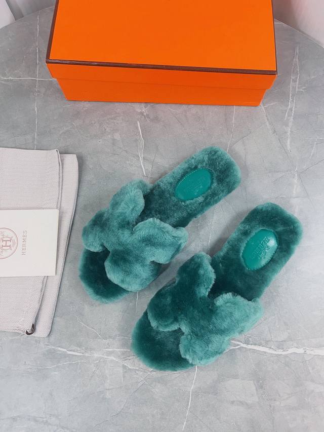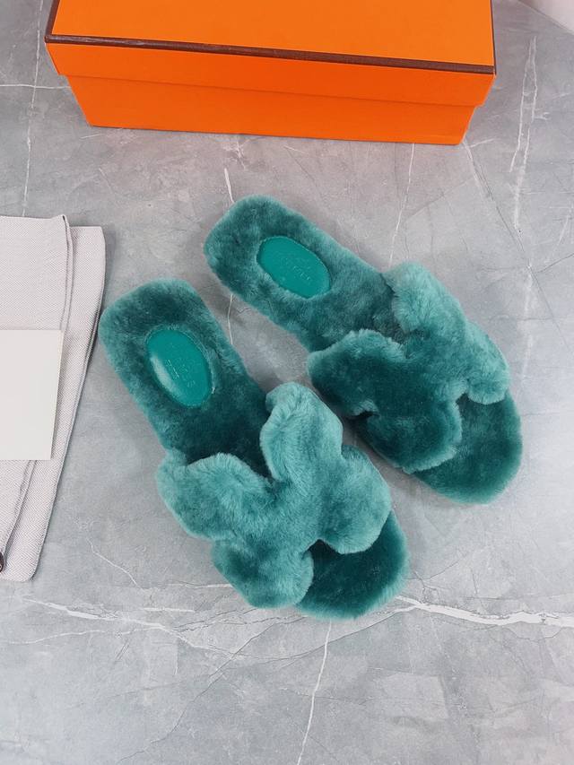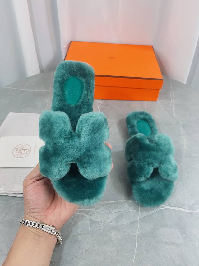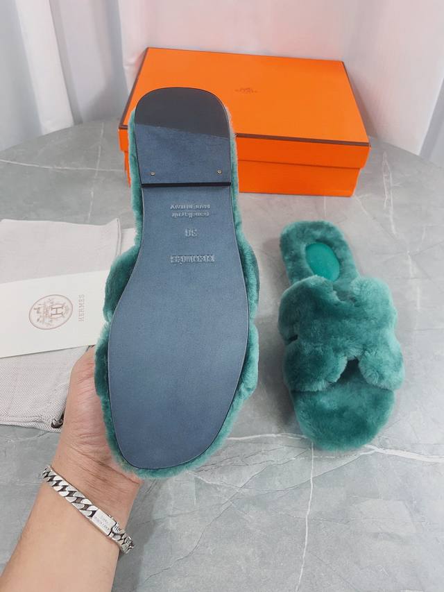 Furry Slippers, High-Quality Furry Slippers with H-Shaped Top, Hermess Fashionable Newest Teddy Wool Autumn/Winter Flat Furry Slippers, Super Versatile and Warm-Soled, a Favorite Among Ladies. Material: Genuine Teddy Sheep Leather Lining: Genuine Teddy Sheep Leather Outsole: Genuine Leather Outsole. Sizes: 35-42. Sizes 41 and 42 are custom-made, no returns or exchanges.