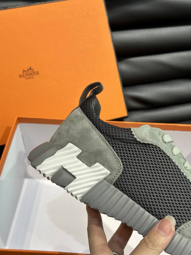 H Hermes Bouuncing sneakers, casual sneakers for couples, featuring a calfskin and mesh upper made of imported materials for a premium feel. The lightweight sole is decorated with contrasting patterns, creating a versatile and stylish look. Sizes: 35-44, 45 custom-made.