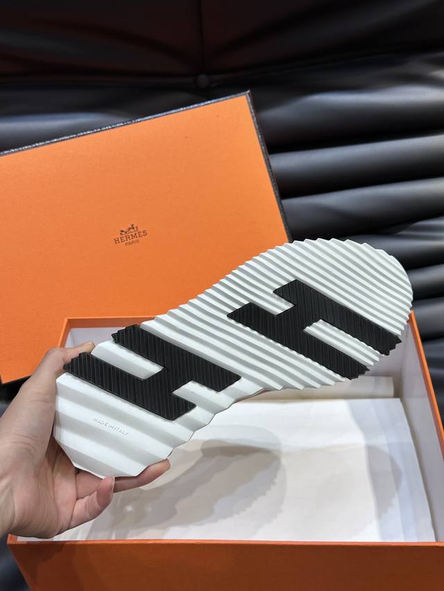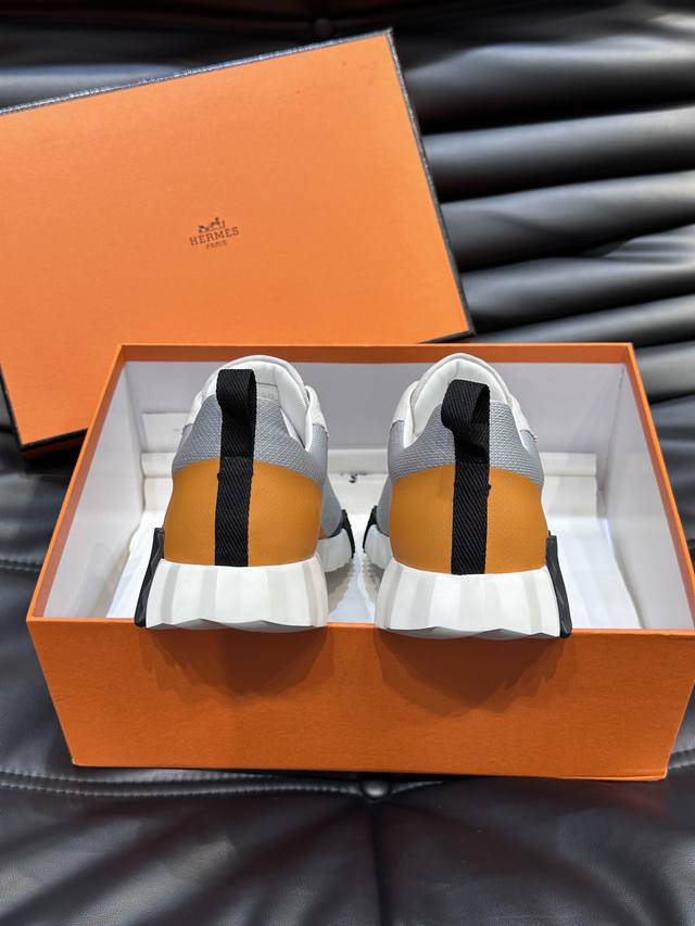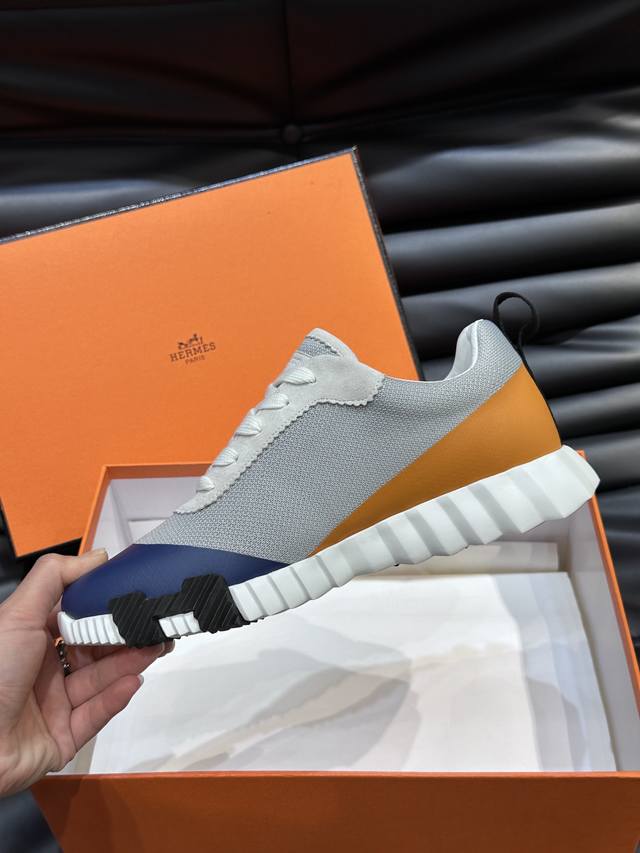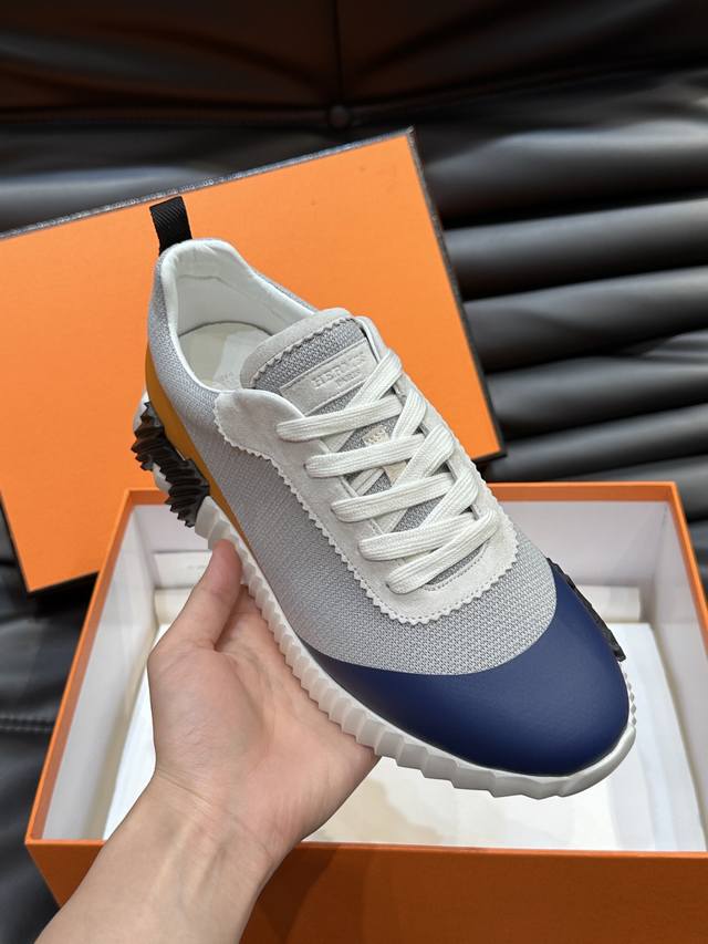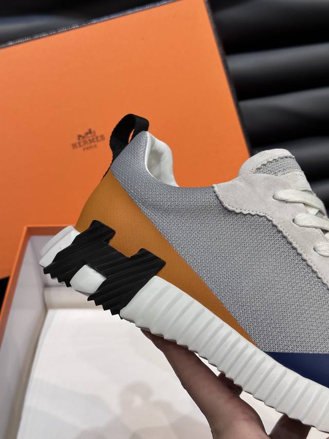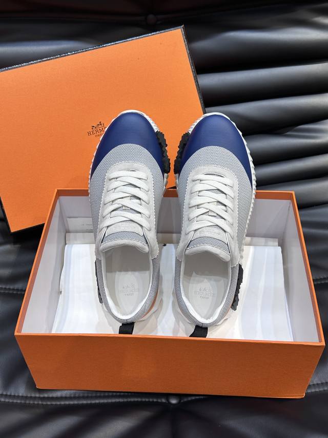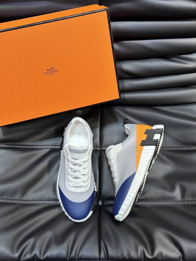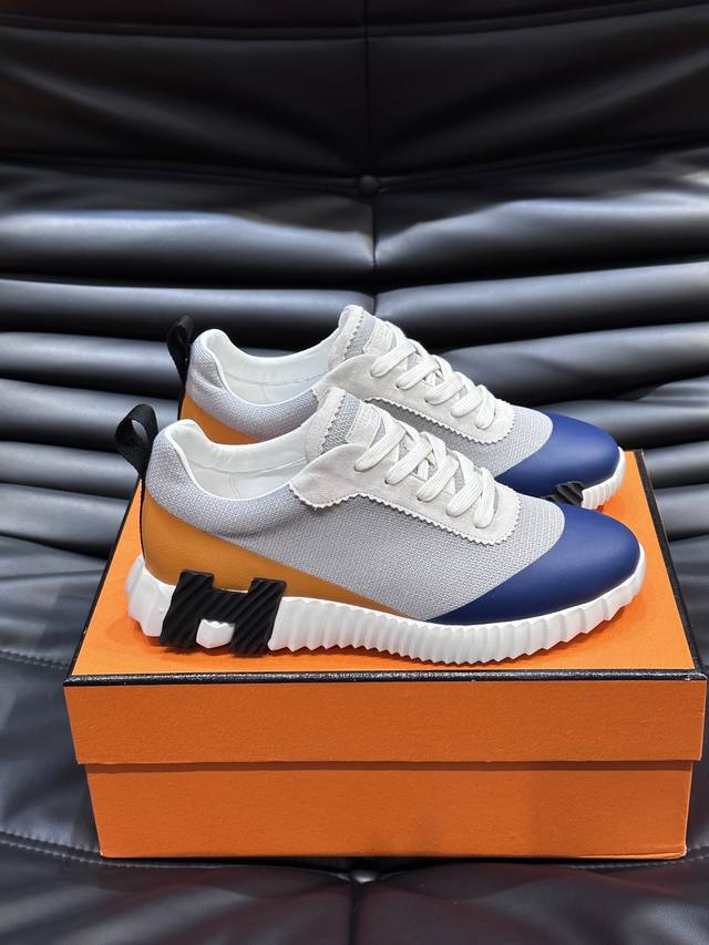 H Hermes Bouuncing sneakers, men's casual sneakers, featuring a cowhide upper combined with high-end mesh fabric, imported materials for a premium feel, and a lightweight sole adorned with contrasting patterns for a versatile and stylish look. Sizes: 38-44