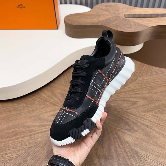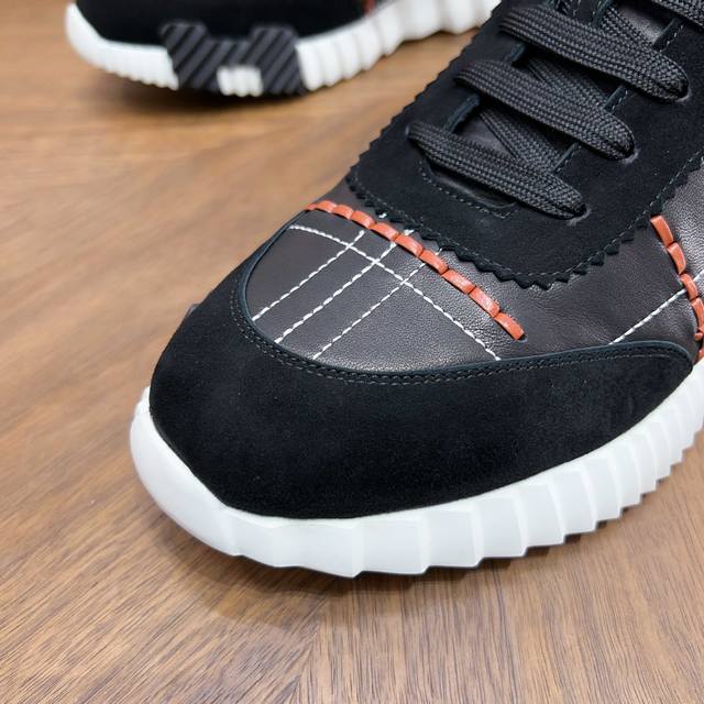 H Hermes Bouuncing sneakers, men's casual sneakers, upper crafted with calfskin patchwork, imported materials, full of texture, lightweight sole decorated with contrasting patterns, creating a versatile and fashionable style. Sizes: 39-44, 38, 45, 46. Custom orders available.