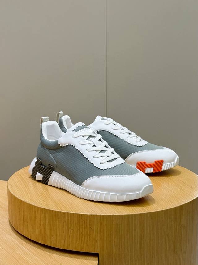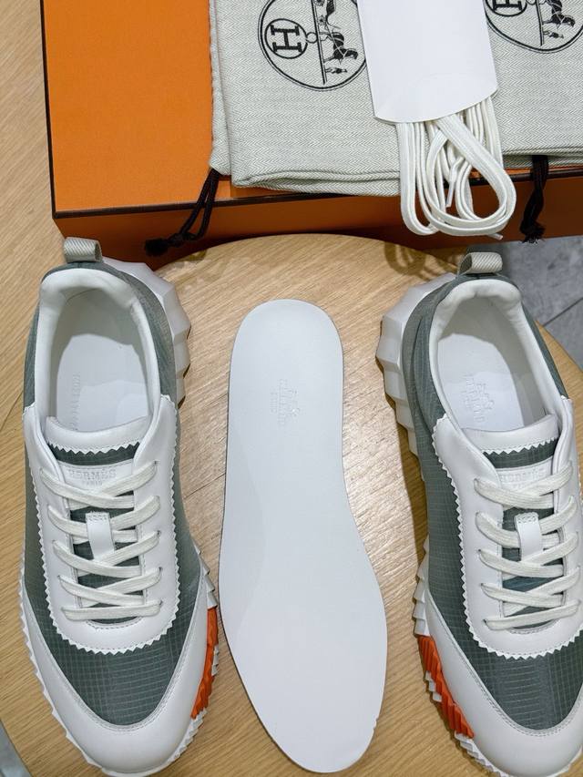 Hermes Bouning Men's Sneakers - Leather Midsole. Original purchase, 1:1 replica. For the ultimate in quality, this is yours! Made of suede, goatskin, and calfskin. Lightweight sole with contrasting pattern for a versatile and stylish look. Includes a second pair of laces. White rubber sole, black rubber inlays at the toe, hurricane grey rubber inlays at the heel, hurricane grey lambskin insole and lining. Sole height: 4cm. Comes with an extra pair of laces and official original packaging. Size: 39-44 (38, 45, 46 available for custom orders).