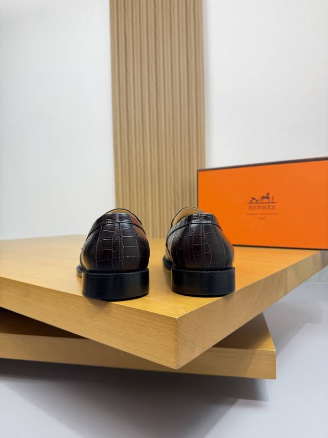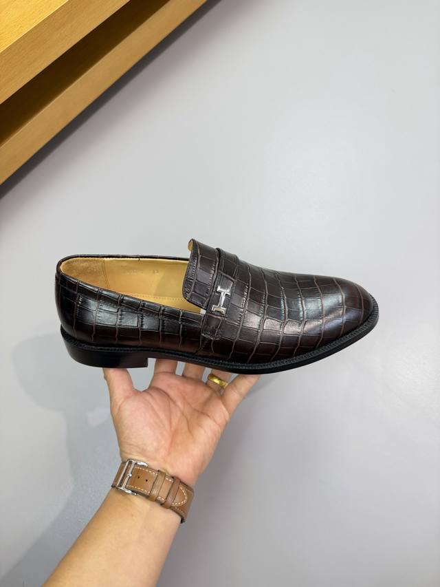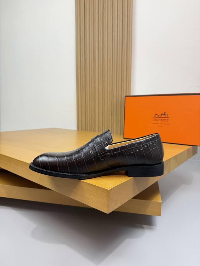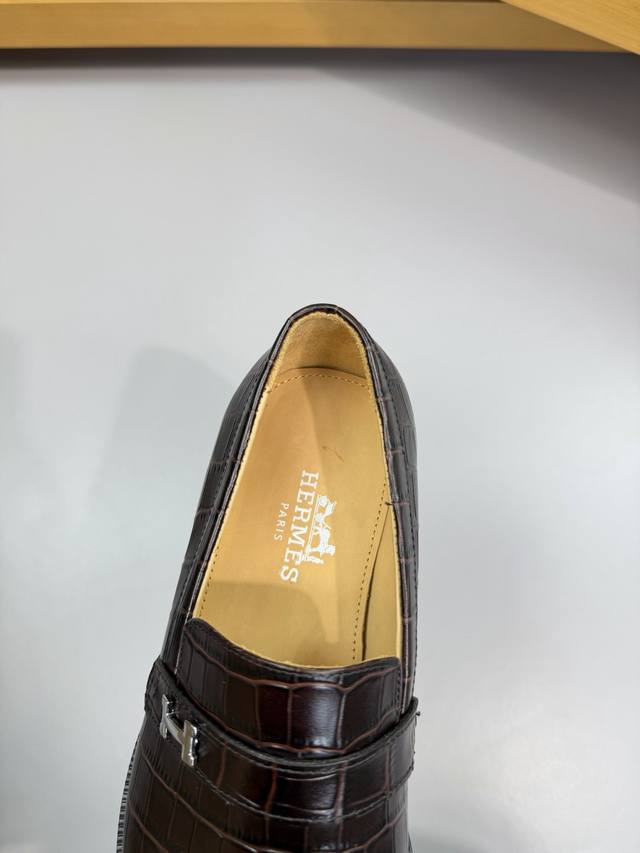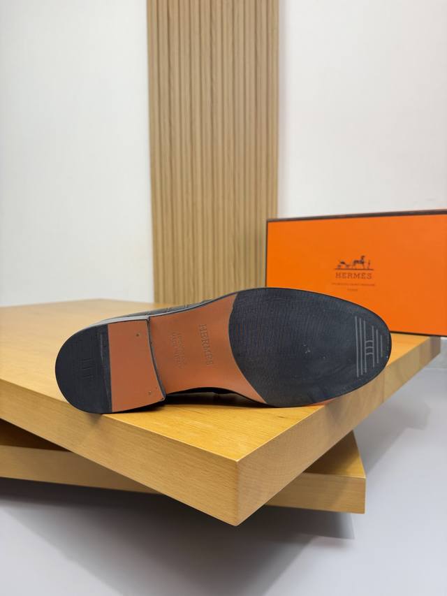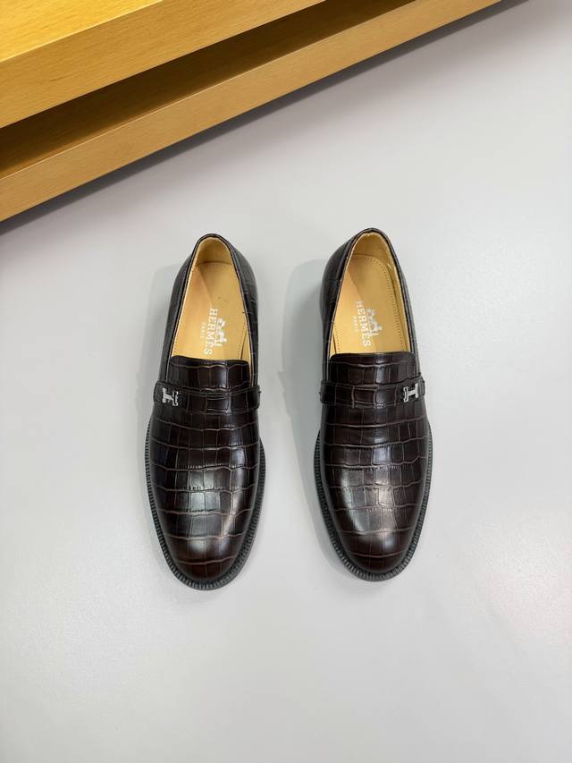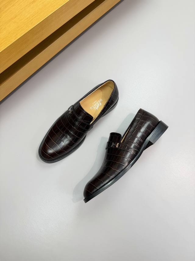 Hermes - High-end quality original dress shoes - Upper: Stone-patterned calfskin, brand metal buckle decoration - Lining: Water-dyed cowhide - Outsole: Ultra-lightweight TPR rubber; composite molded outsole - Super high quality control and exquisite workmanship: highlighting high-end luxury - Size: 39-44 38, 45, custom orders available H0225