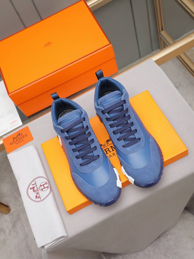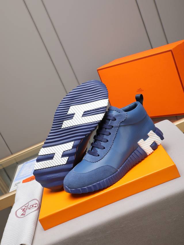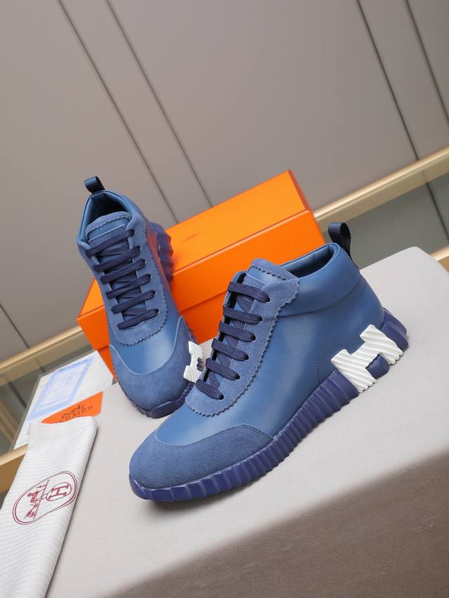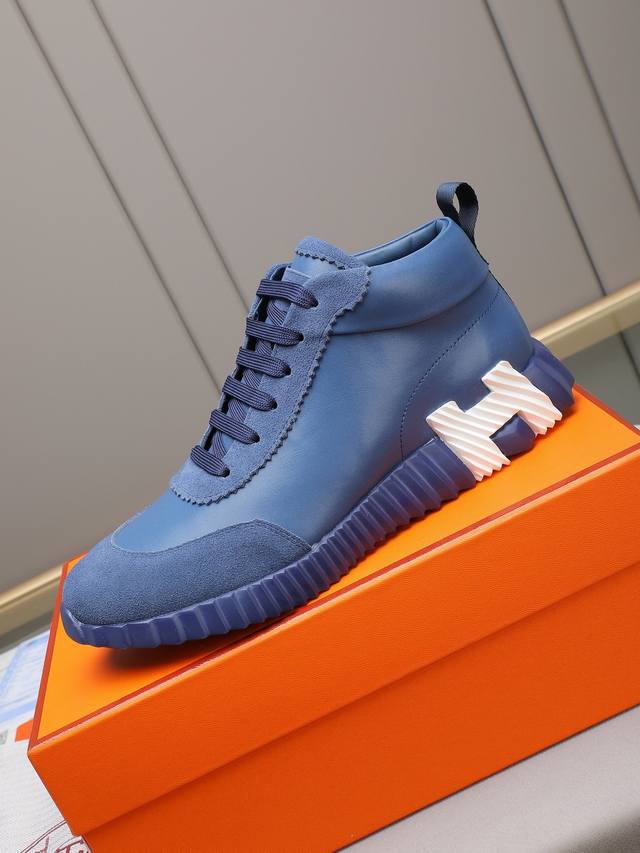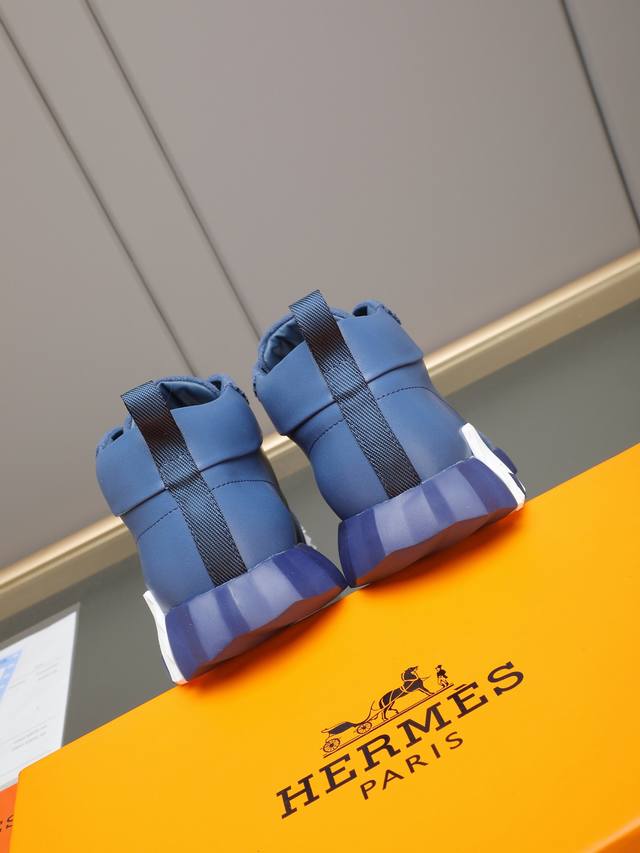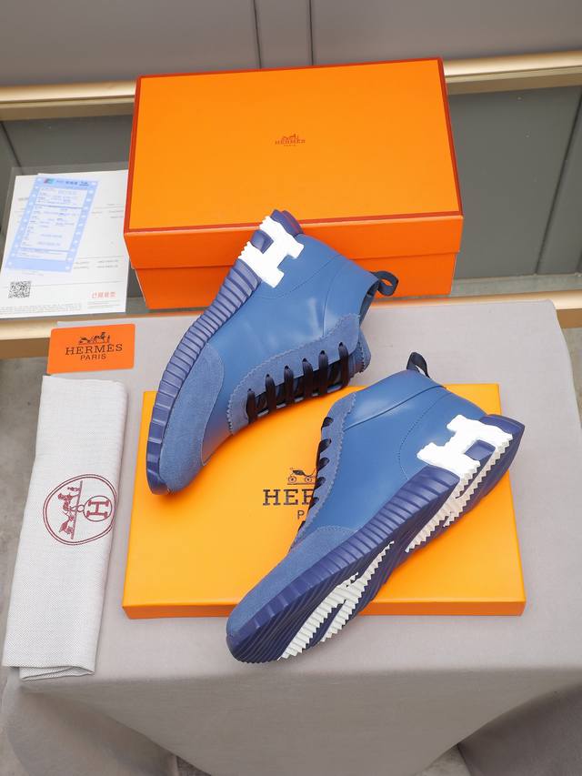 Hermes high-top men's sneakers, featuring textured calfskin details. The upper is made of original calfskin, drawing inspiration from the equestrian world and blending technical details with practical functionality. It features a breathable sheepskin lining, an original combination outsole, and high-end quality, with every detail perfectly combined! Sizes: 38-44, 45 can be customized.