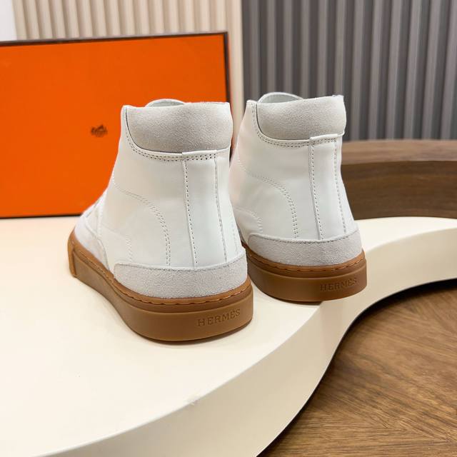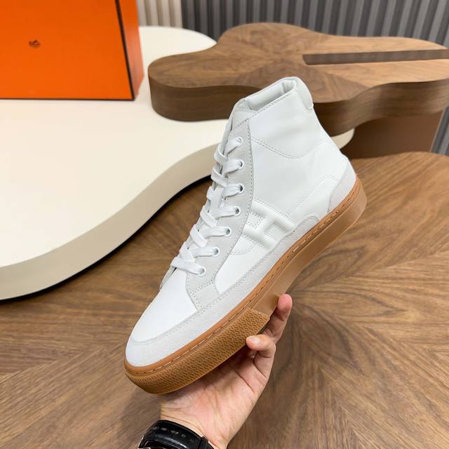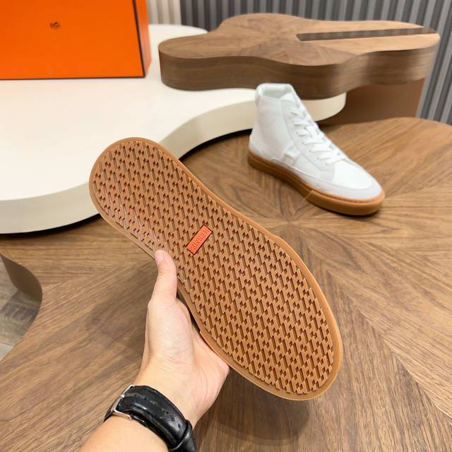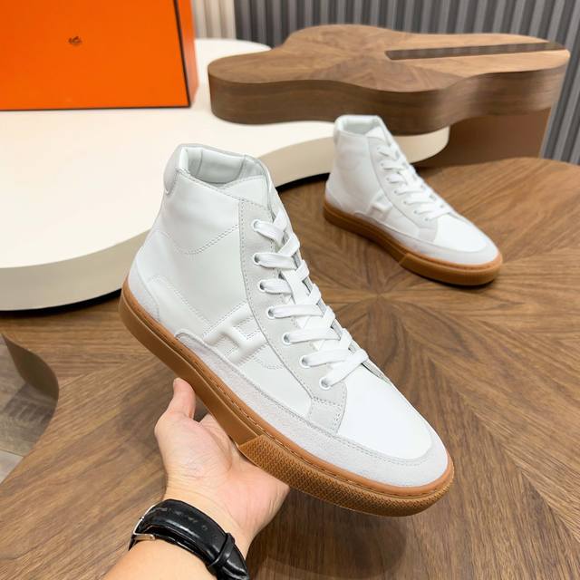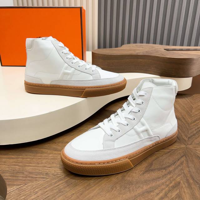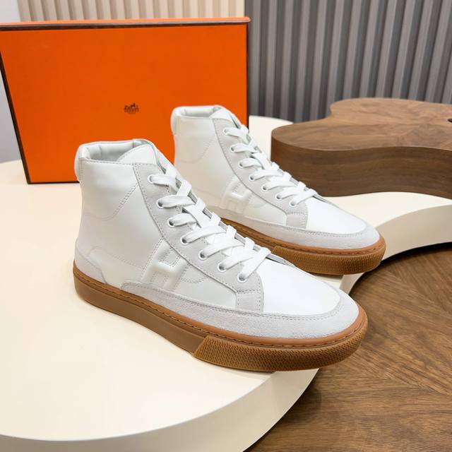 Hermes Kelly Men's Retro Mid-Top Sneakers, made with signature hand-textured calfskin leather, offering a delicate texture and durability. The mid-top design and calfskin lining ensure exceptional comfort, while the rubber outsole provides excellent grip. The distinctive "H" logo on the side adds a touch of sophistication. Available now! Sizes: 38-44, 38-45 (custom orders welcome).